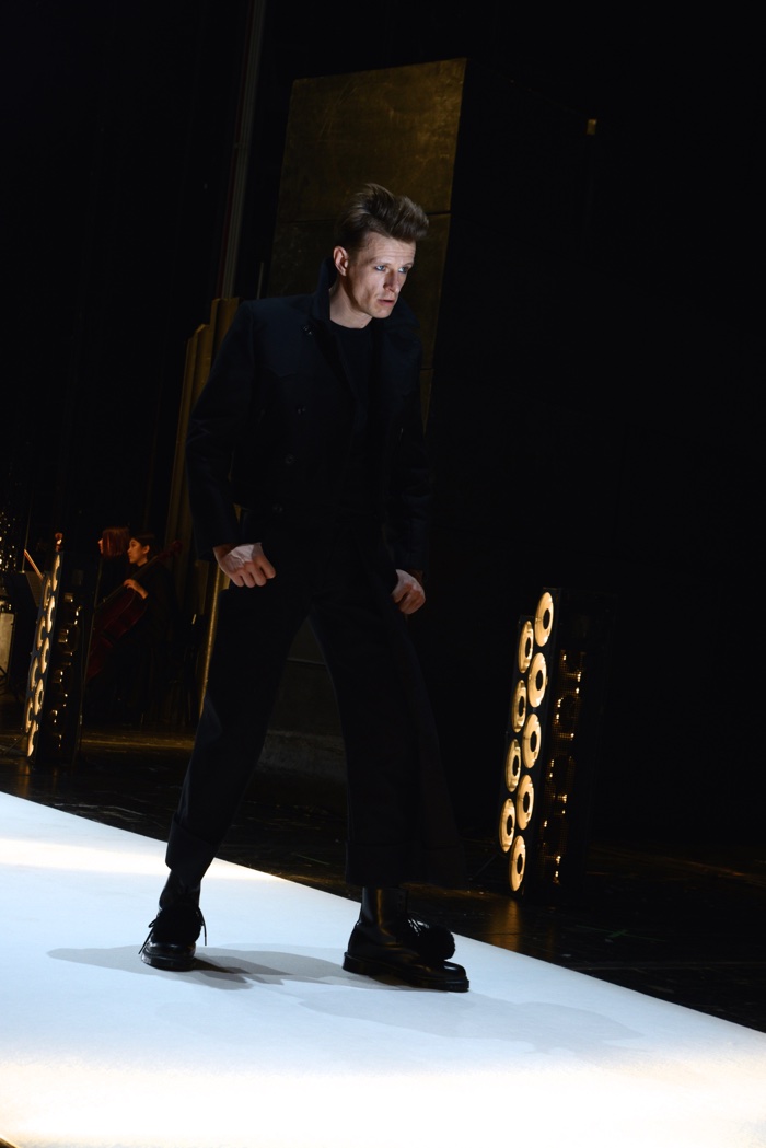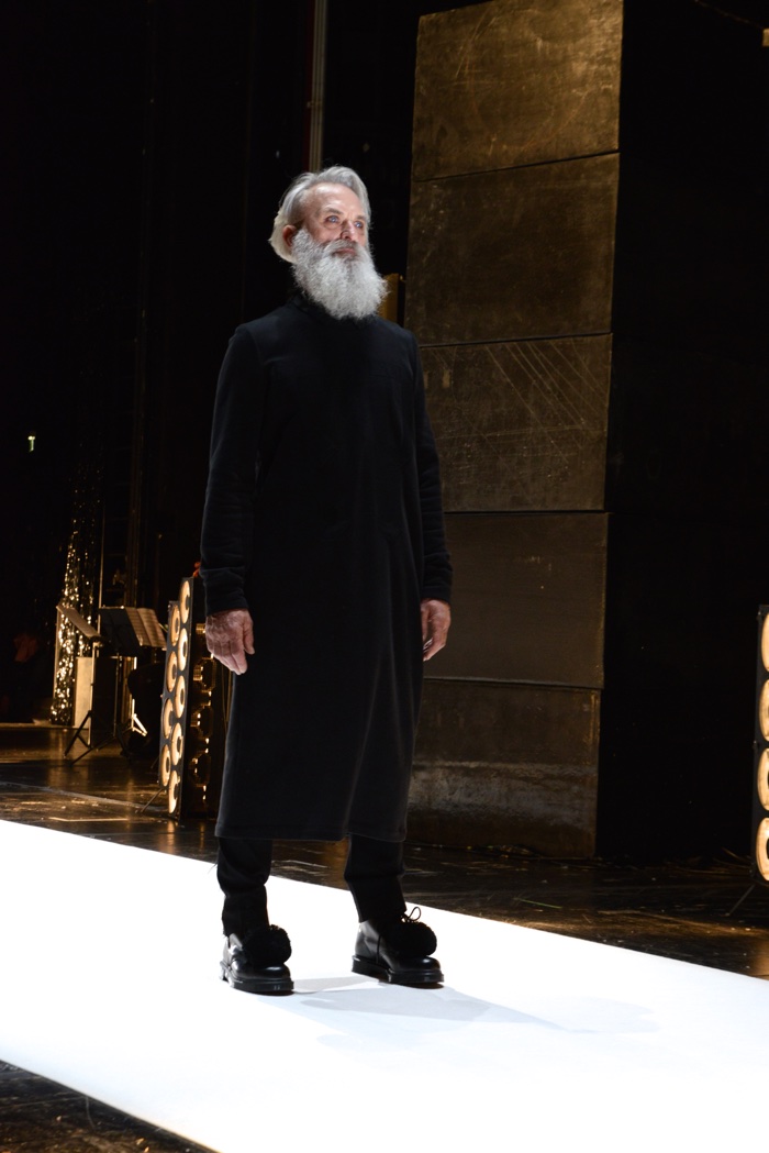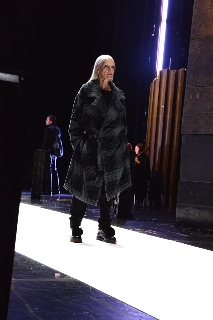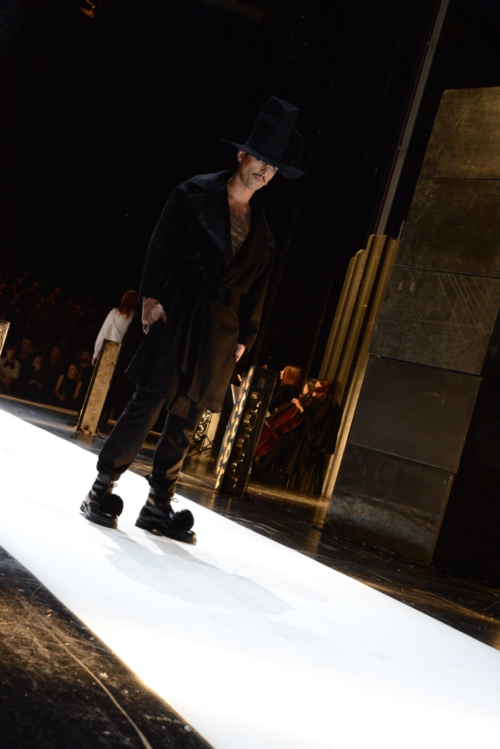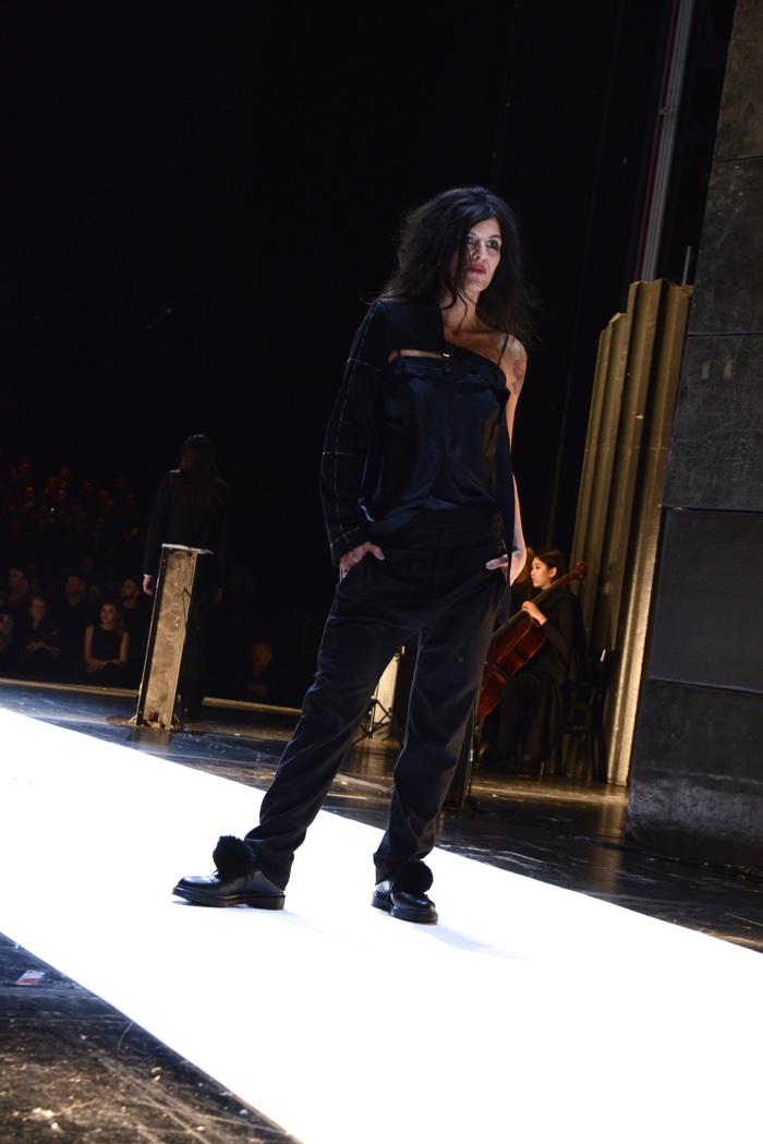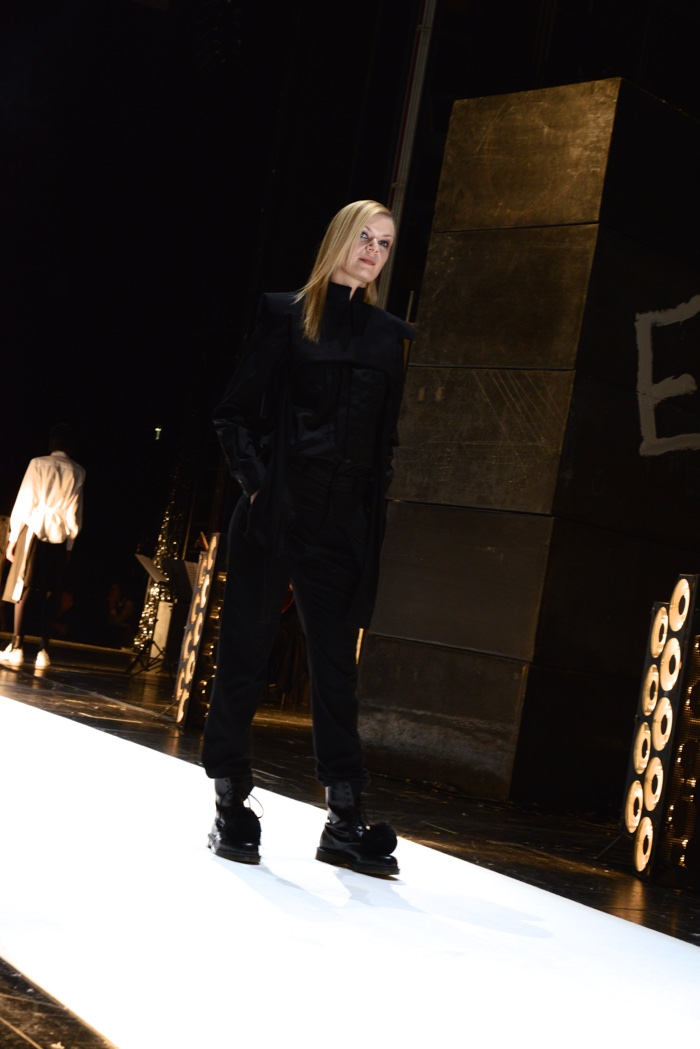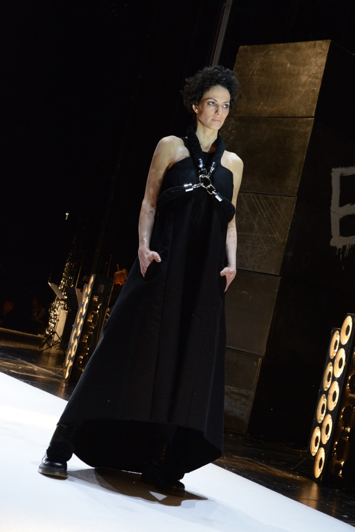 Berlin Fashion Week! #EMPÖRTEUCH – THE QUEEN of Berlin´s dark fashion style Esther Perbandt wowed the crowd during MBFWB with an outstanding runway show at Volksbühne. She is a designer, visionary, performer, master of ceremony and entertainer. Her new collection is a masterpiece! The designer chose to return to Volksbühne Berlin for a second time, magically attracted to the venue, which fits her like a second skin. On the stage of the memorable Bert Neumann, where the black and white films worlds of the twenties and thirties meet Buster Keaton, Dada, and George Grosz – Esther embeds her mix of present and future personalities – unconventional, confident, fragile, clear, energetic, somber and touchingly beautiful. We have seen many of our friends and KALTBLUT icons on the runway like photographer Florian Hetz, our very first cover model Lex Olsen, male model Sasha Marini, designer Herr von Eden, musician Romano and supermodel über-icon Vea von Lehndorff (aka Veruschka).