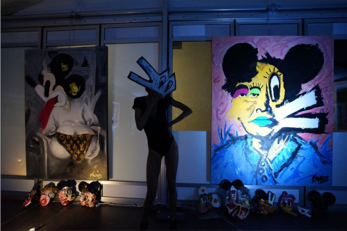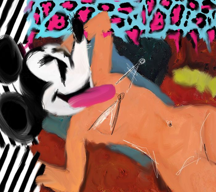 His works show Pop Culture Icons such as Andy Warhol’s Marylin and Disney characters, their figures disassembled and wildly reassembled. The compositions are often close ups, in the tradition of Andy Warhol’s Pop Portraits. The aggressiveness of the computer generated brush work adds up to the presence of International brands like Lacoste or Gucci who are cited in the works. The chaos of references is sometimes softened by the Photoshop blur.
