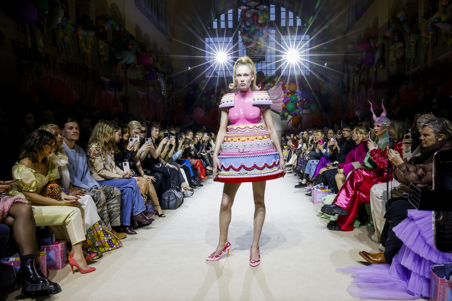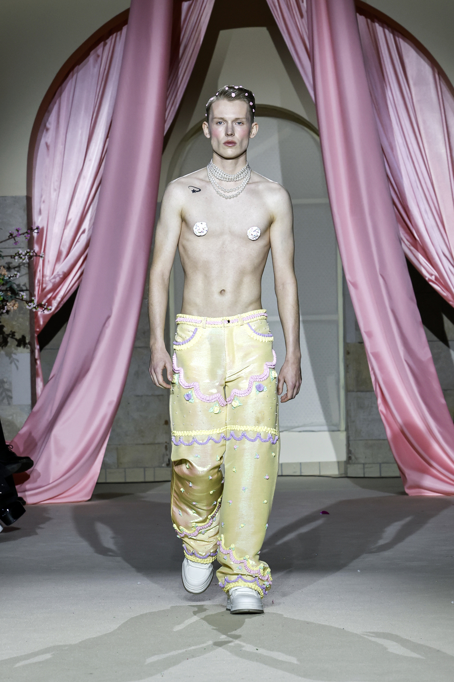 The designs incorporate whimsical elements such as vegan leather balloons, oversized bows, colourful flowers, and playful googly eyes, evoking a nostalgic sense of joy and carefree happiness. Glittering rhinestones add a festive touch, while surreal accents seamlessly blend with urban sophistication. Dark, Berlin-inspired features like sharp silhouettes, exaggerated shoulders, and fetish-style belts inject a bold, modern energy, achieving a unique balance of contrasting influences.
