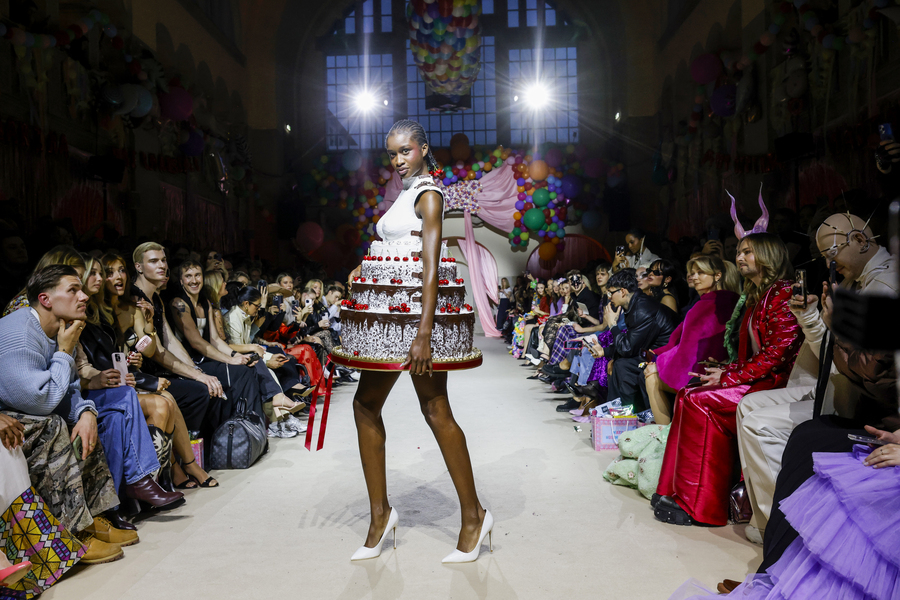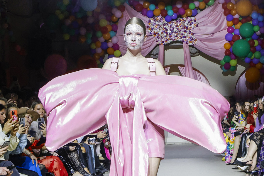 Drawing inspiration from the art of patisserie, the collection features elements like fine piping, tiny dragees, and birthday candles, transforming each piece into a wearable masterpiece. The cake vase stands out as a highlight, showcasing her exceptional craftsmanship. Textural diversity is a hallmark of the collection, with glossy organza, delicate tulle ruffles, and satin roses creating an elegant softness, while contrasting hard leather designs take on new forms, reminiscent of origami with jagged, torn edges.