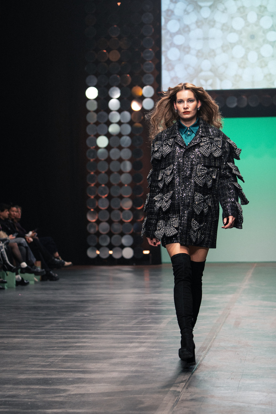To add softness, sensuality, and a touch of sexiness to the linear prints, the designer pairs them with opulent, flowing ruffles. A palette of cream, orange, mint, silver, green, and petrol captures the energizing spirit of the night, skillfully combined with luxurious materials such as faux leather, silk, and fine knits. The creations—ranging from cocktail and evening dresses to tailored suits and flowing kaftans—radiate a rare balance between luxury and everyday wearability.