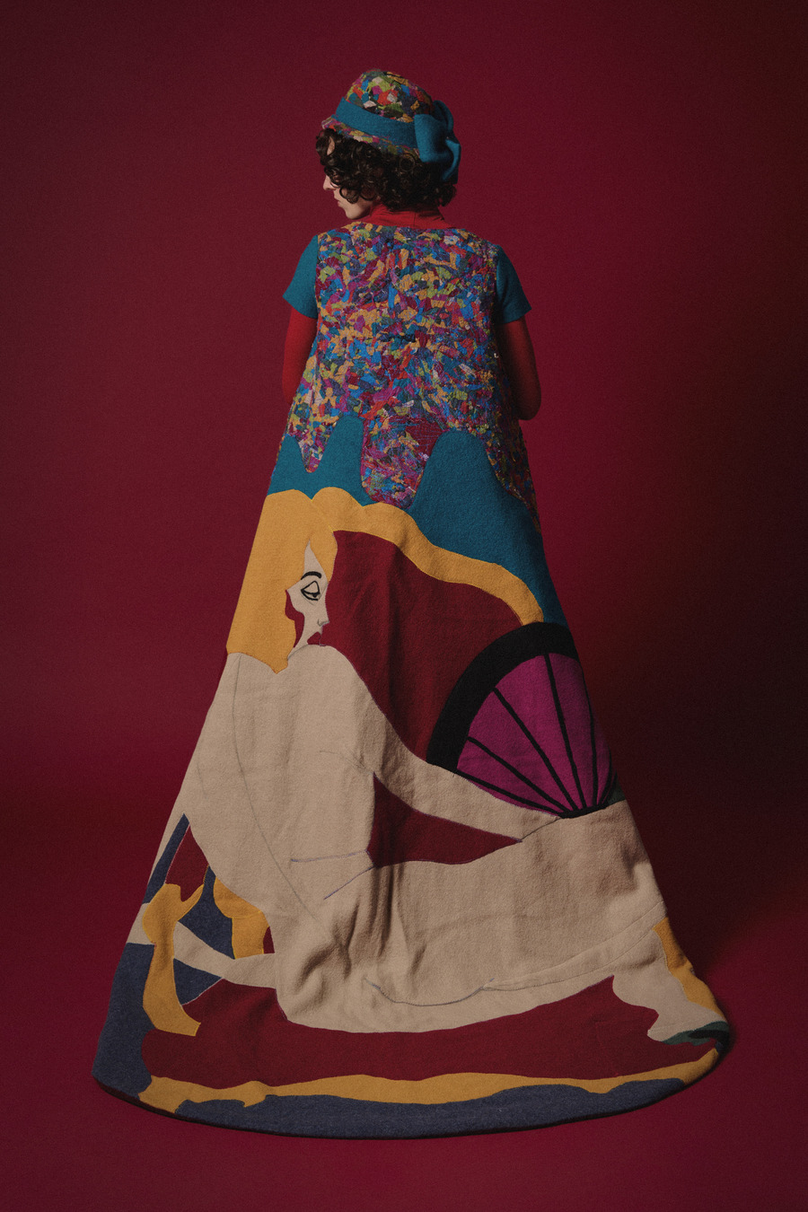 What makes Enkhbat’s collection extraordinarily captivating is her commitment to sustainability — a principle she integrates into every stitch and seam of her designs. “My collection is 100% sustainable, with no waste,” she states with pride. By leveraging Woolmark-certified materials for her intricate patchwork designs and repurposing every scrap of fabric and thread into her second looks, she infuses life into the very essence of upcycling.