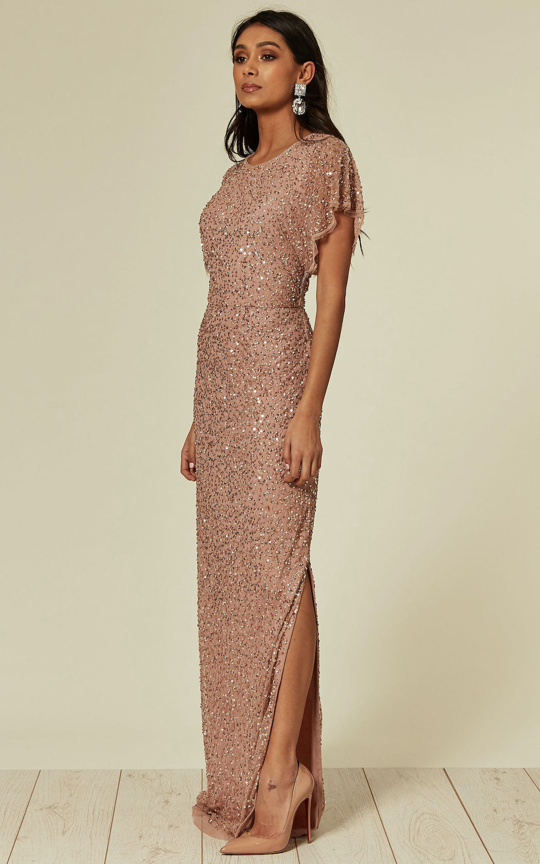 Our final choice for the upcoming Christmas season is the embellished Nude Pink Maxi Dress. This short-sleeved hand-embellished maxi dress is the perfect amount of sparkle and shine that you need for any special occasion. With an elegant side split and long skirt, this is the perfect gown for a formal Christmas party or wedding.