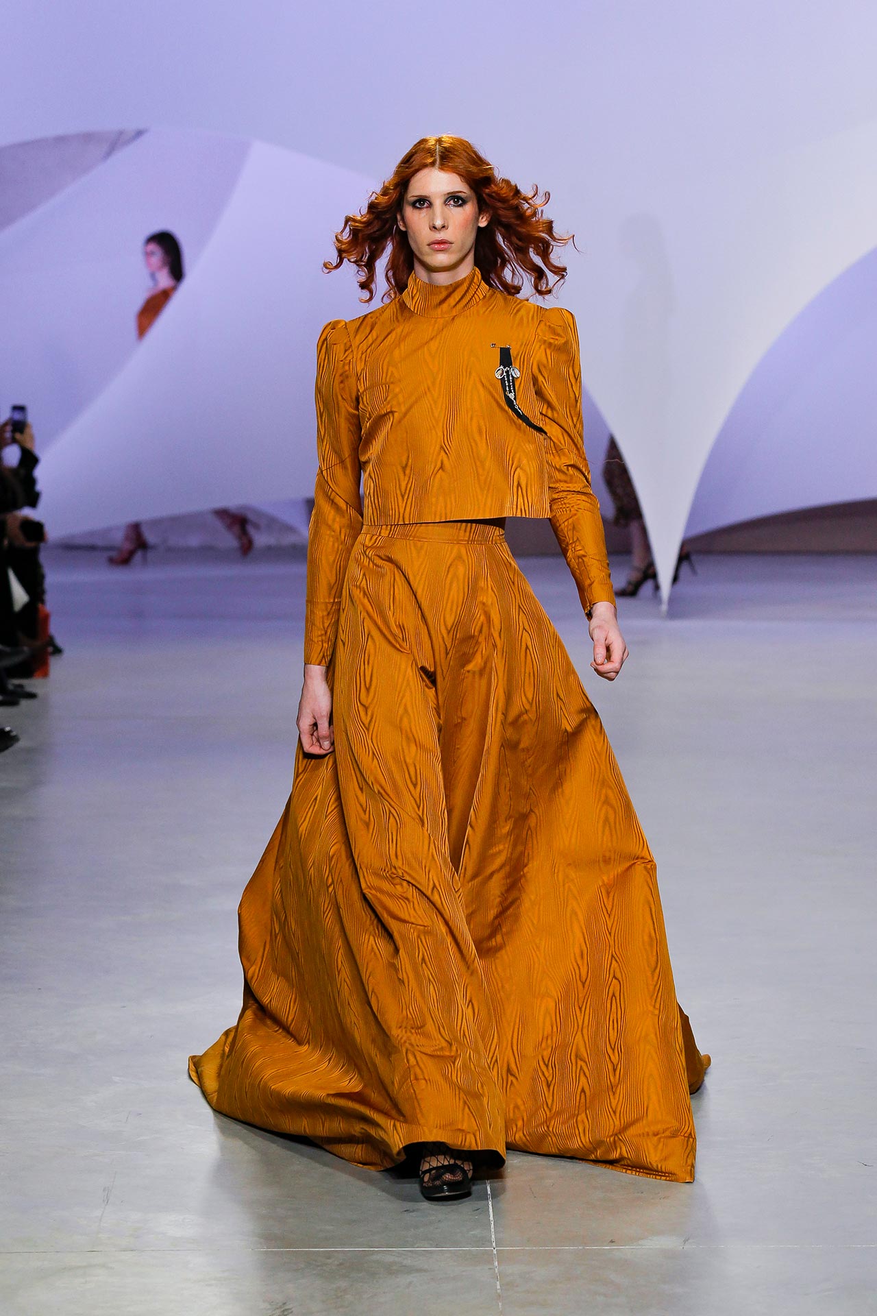 Over-sized silhouettes coexist with anatomically constructed structures, three-dimensional details, dramatic sleeves and right-and-back games. Dry textures in taffeta and moiré stitches and quilting contrast with pallets, liquid crepes in plain colours or leopard prints.