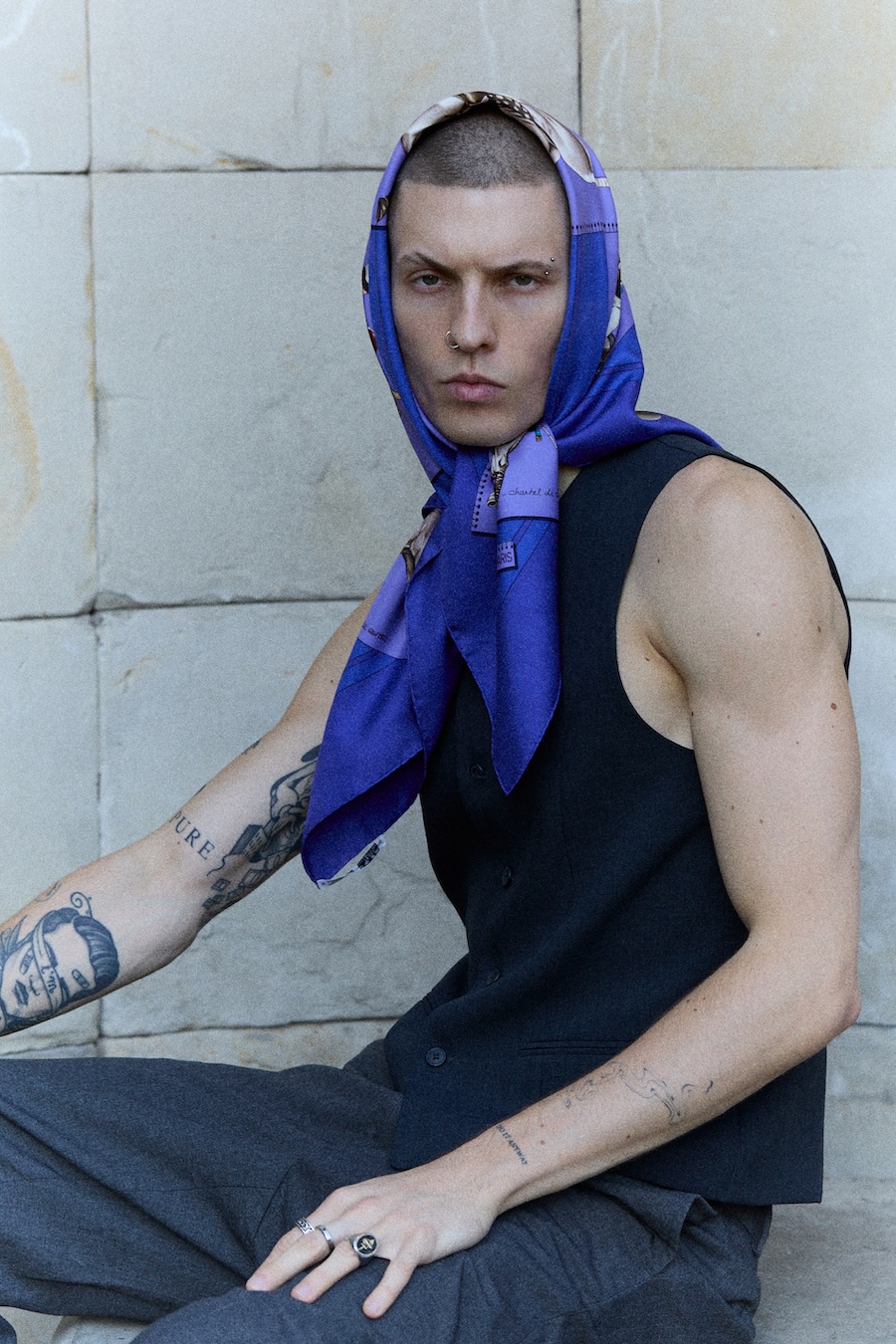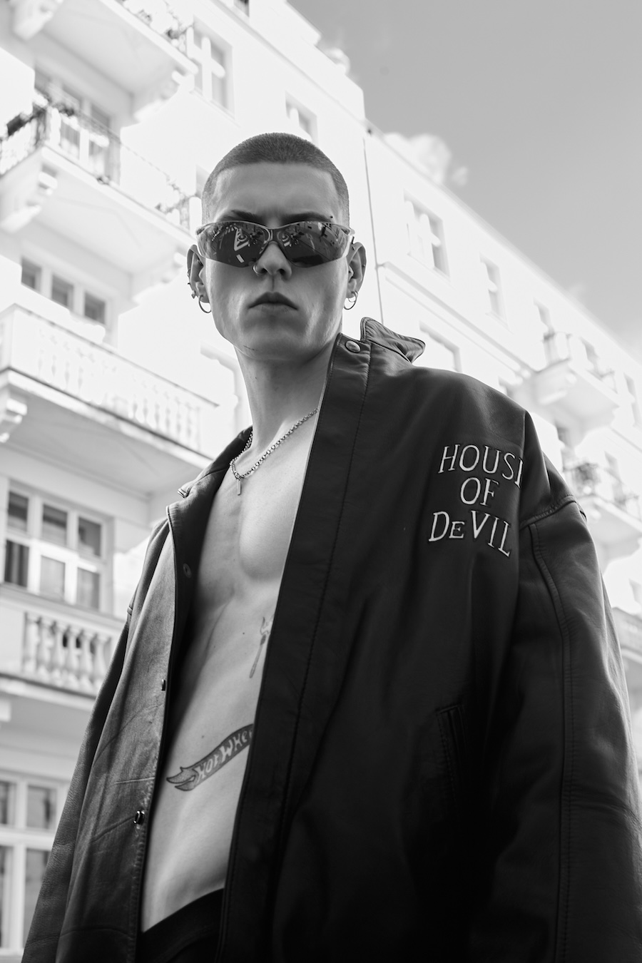 A KALTBLUT exclusive editorial. Photography by Robert Ryncarz. The model is Mateusz Pędracki from AS Management. Styling by Rafał Pasiak using Adrian Rusowicz, Oh Very, Hermès and leather with Cruella from Avalonia Vintage, Kryszy. And vintage jewellery from TFH Concept Store, Adidas, and Dior.