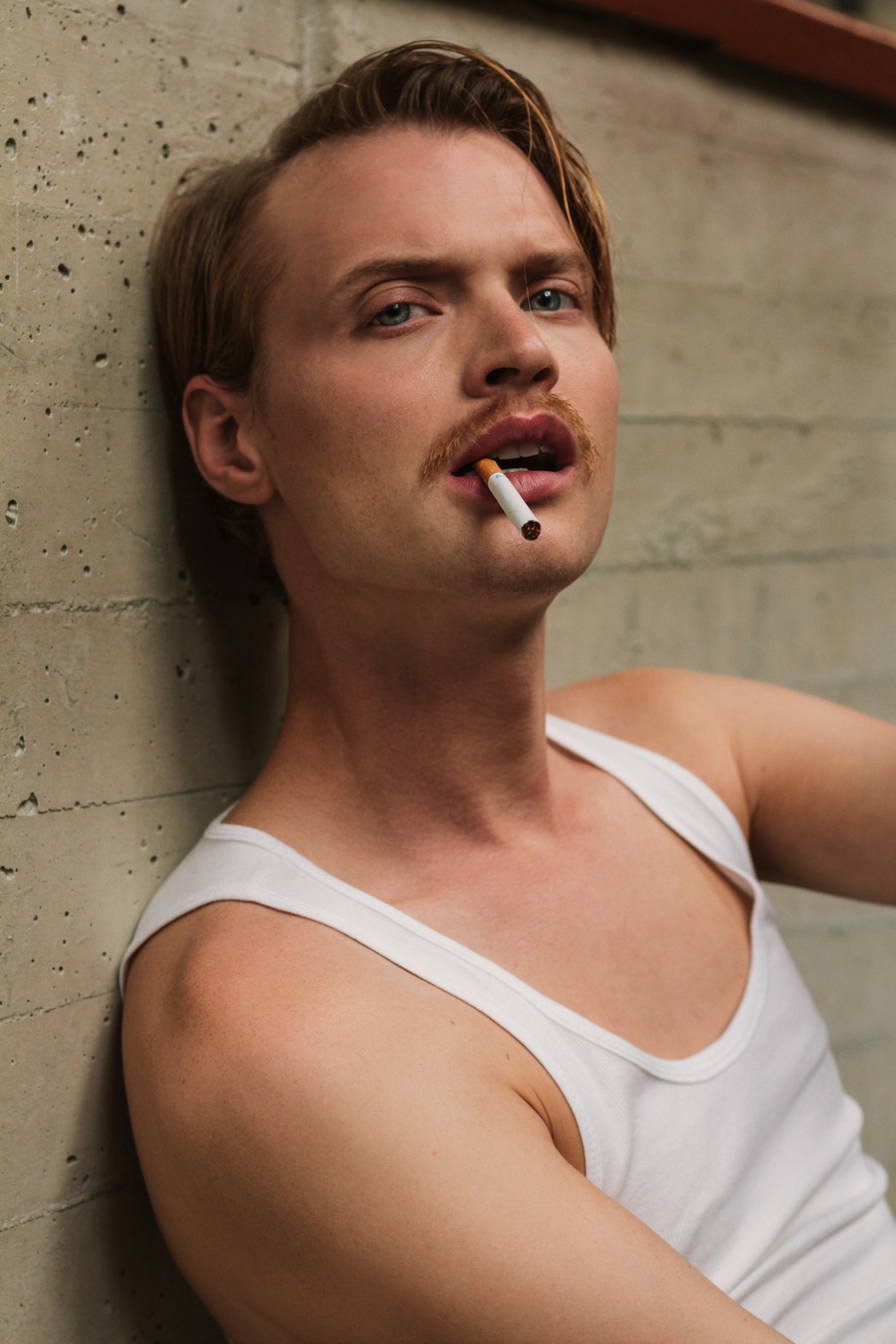 A KALTBLUT exclusive. Photography by Manuela Zapata. Model is Alexander Wolf. Makeup & Hair by Paula Medina. Styling by Jose Arango and Sebastian Montaño. Brands are Montt Brand, Forever 21, Zara Man, Tennis. 80’s dream is a fashion editorial that explores queer masculinity through the aesthetics of this era. It happens in a timeless space where our male “sweet macho” character flirts with the viewer. The editorial was created by our Colombian-German team: we all got together to dream, to talk and to create a sweet collective fantasy that reminds us of a porno movie from the ’80s.