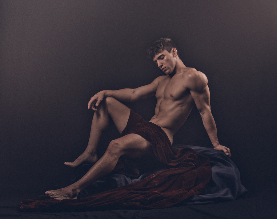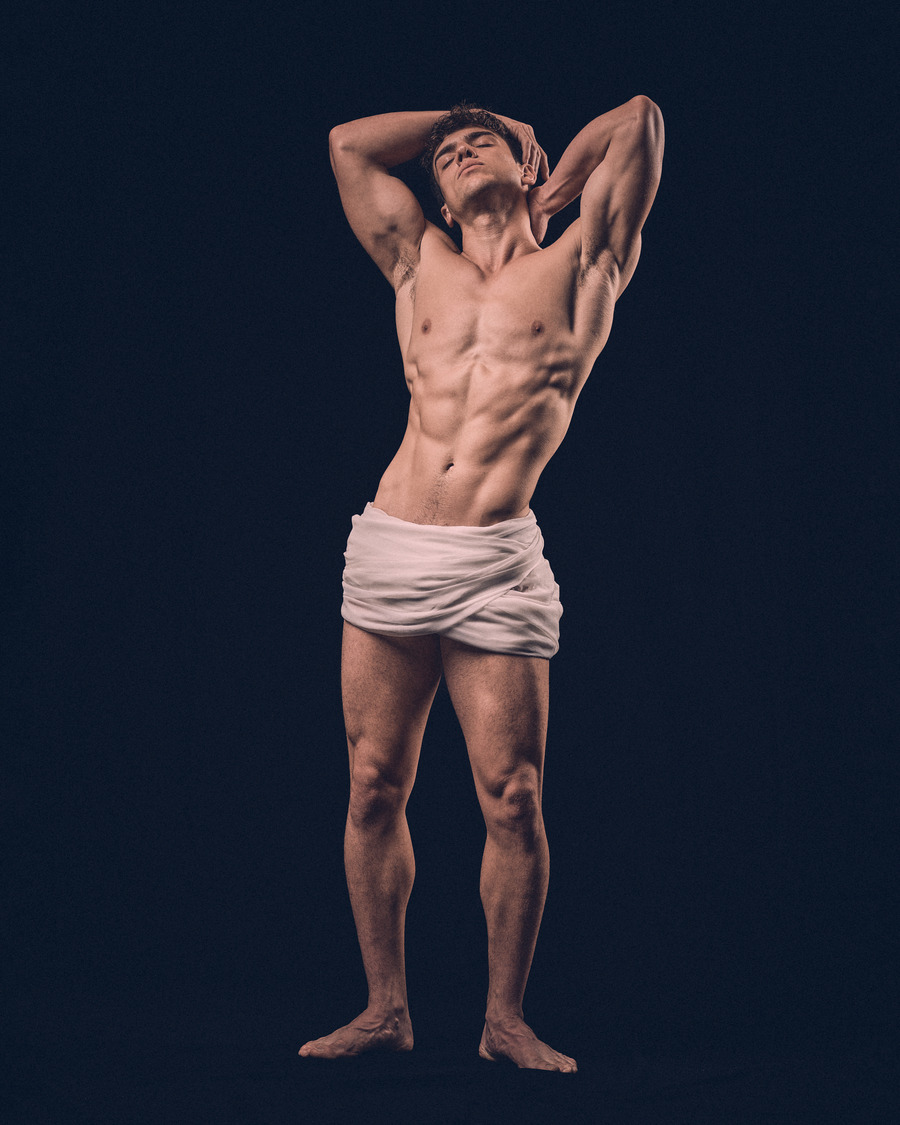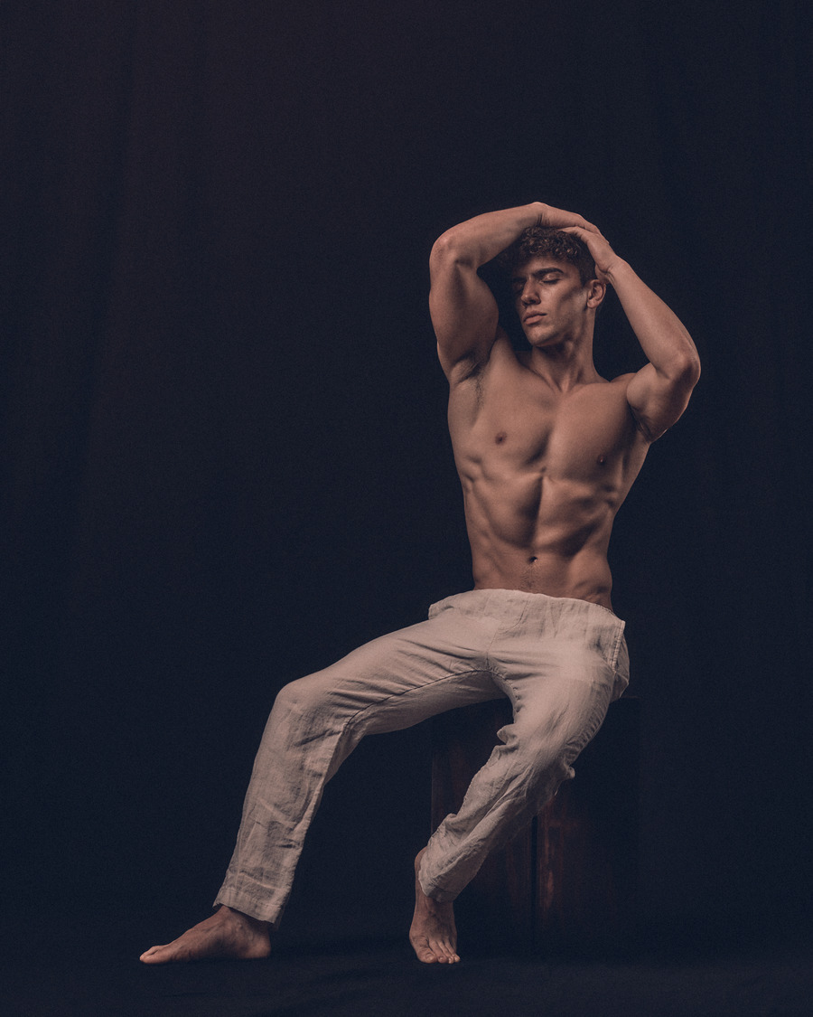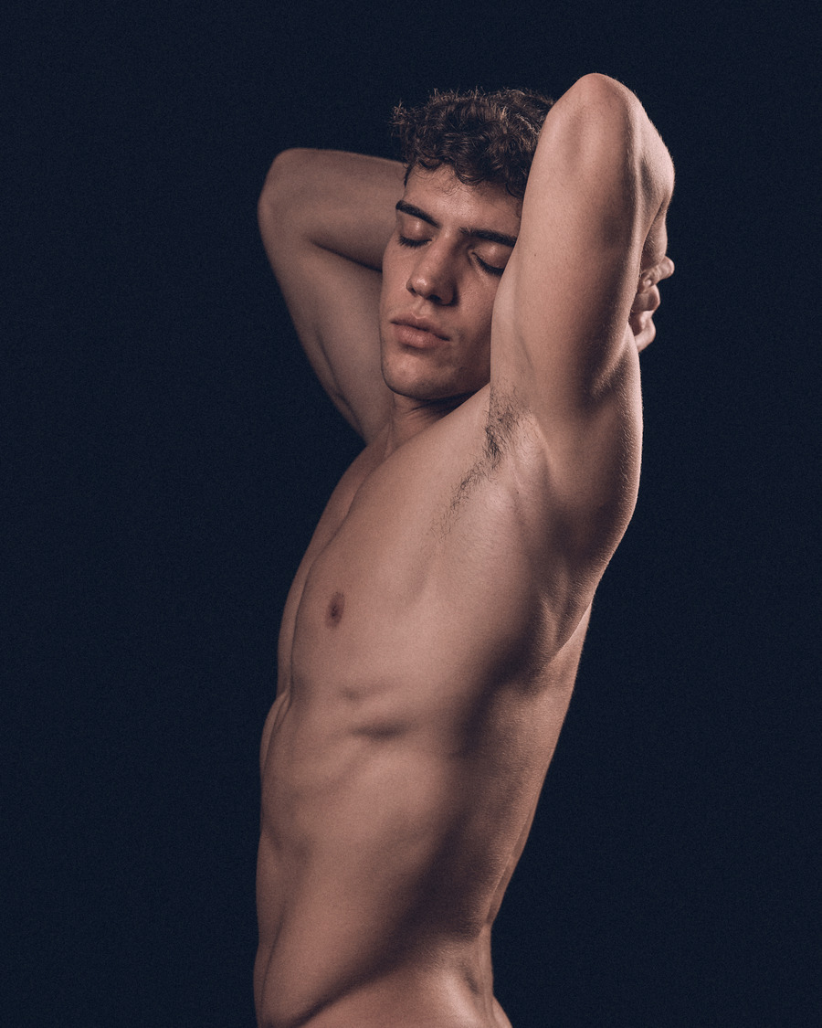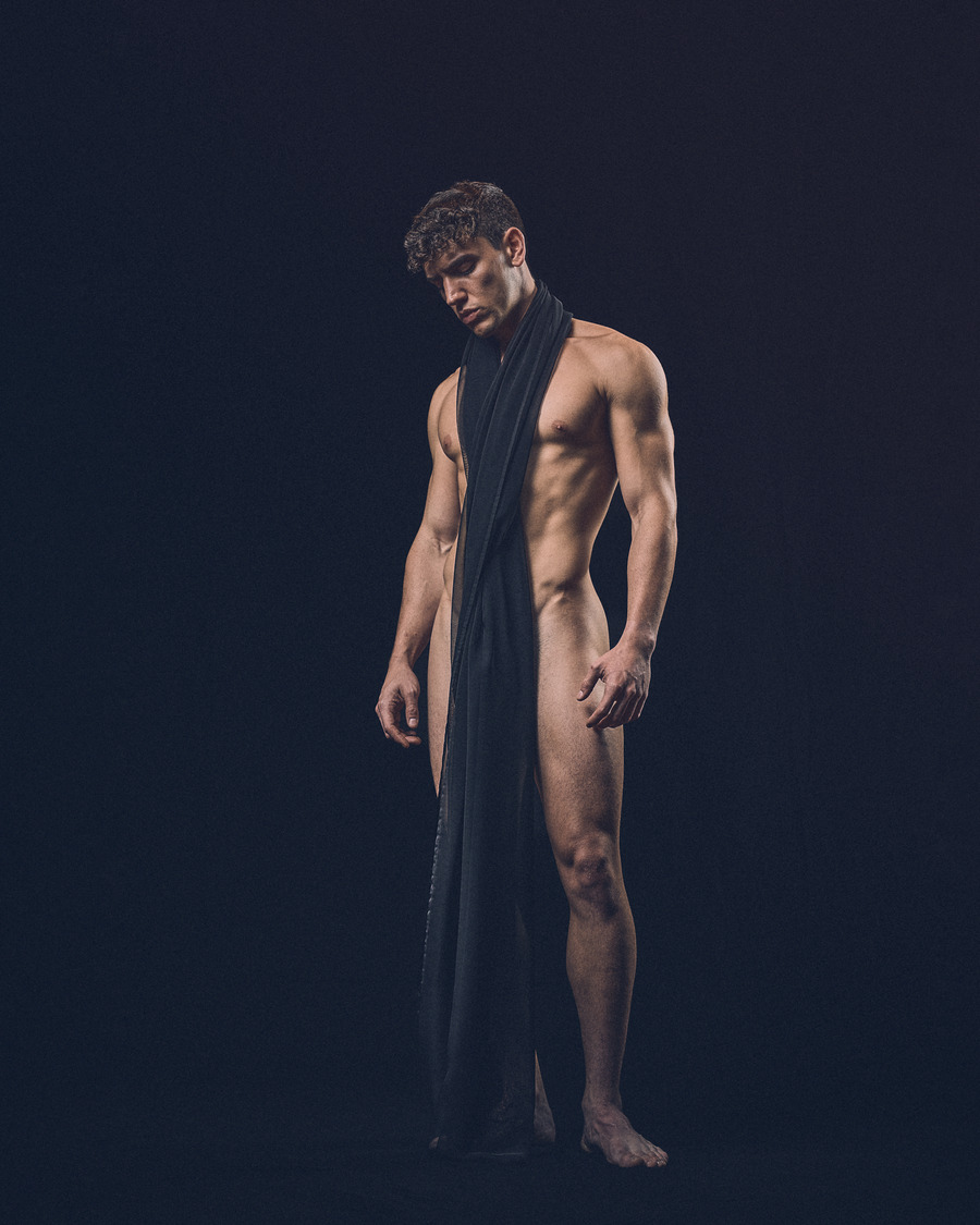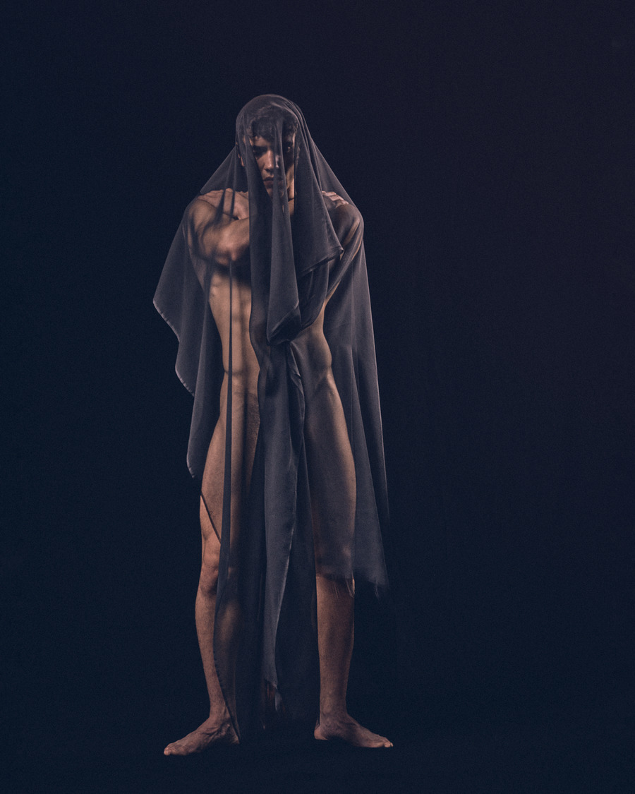 His classical, honed physique and subtle yet powerful gestures and expressions provide the corporeal portal for moments of resonance within this time-suspended dreamscape. Andriel becomes a gentle yet masculine manifestation between consciousness and dreaming, in which the light and shadow, reflected off his form, shape an ecstatic sculptural moment.