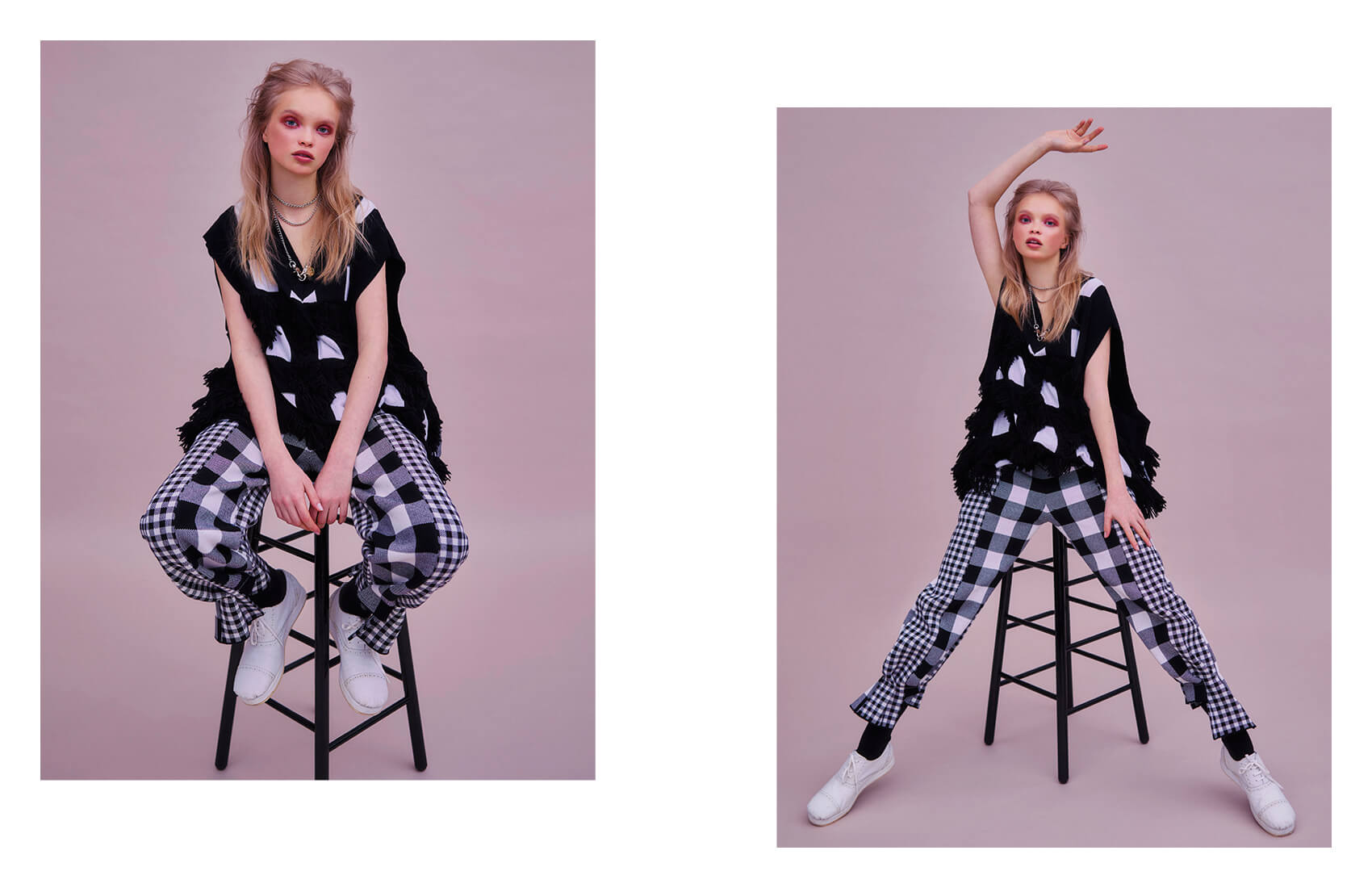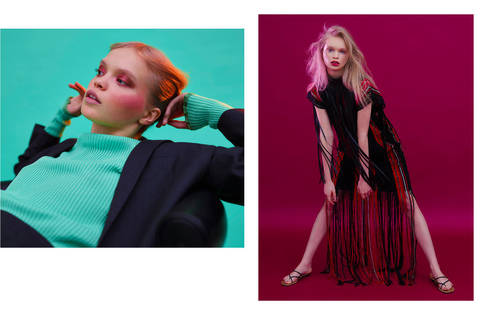 Nastya expresses her two-facades: a daydreaming sheep that has strong eyes with metallic purple-red colour, a little fox with messy over lip yet in the innocent atmosphere. What do you see of her inside out?