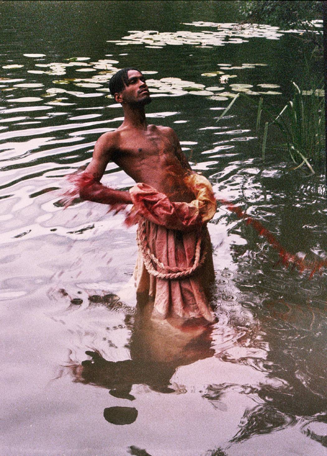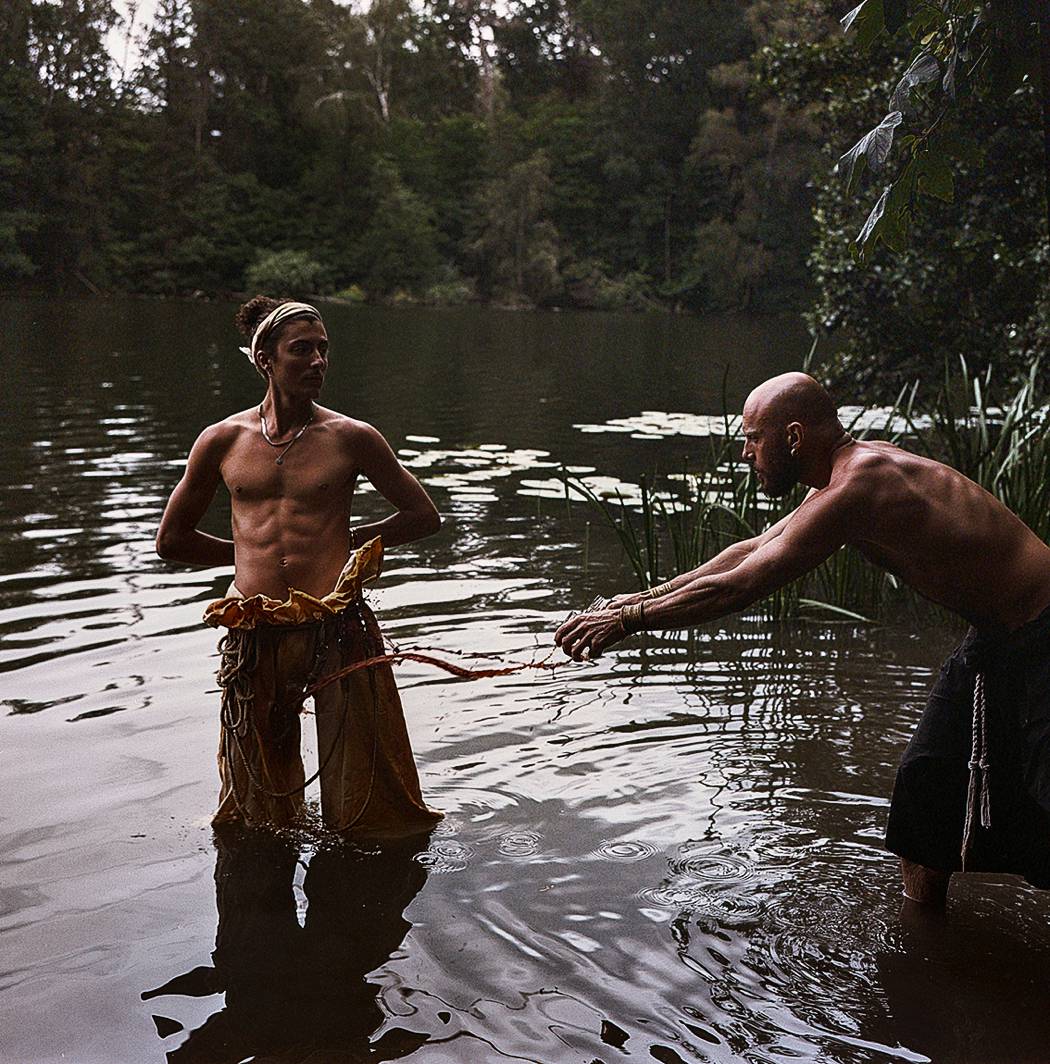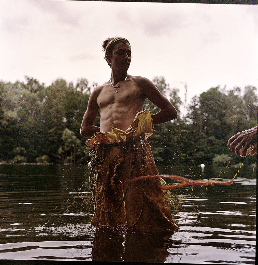 I think it is irresponsible, redundant, and counterproductive to create anything at this time without a strong focus and consideration for its environmental and social impact. With this concept in mind, I wanted to show my creative process in harmony with nature. It was a joyous collaboration between the photographer Tomàs Eyzaguirre, models Nayme, Joachim Perez, and myself. A great synergy was formed through creativity, joy, queerness, and being in touch with nature. I really wanted this collaborative energy to be seen in the images using a documentary lens rather than an editorial aesthetic.