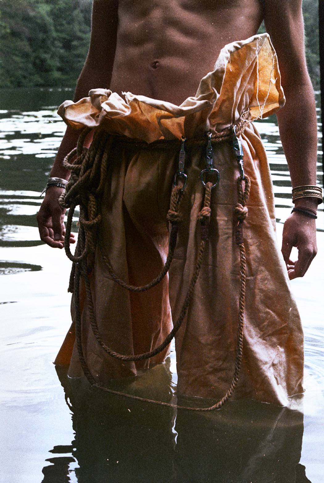 The pieces were worked and reworked on location using pleating, tying and binding so then they can be reused over and over in many different forms this is an ancient concept where textiles would have such value. A piece of fabric could be a blanket, shelter and garment all in one by utilising it in other ways which is a very sustainable idea, I think we should look at it again in a modern context where consumerism is running riot. The garments are more like concepts, draped sketches and shifting ideas. It’s an exploration of what is possible, they are not fixed in form or gender this resonates with the idea of potential rather than binaries or solutions. All the materials were recycled, vintage, natural, bio or unbleached textiles to which natural dyes from vegetables were applied.