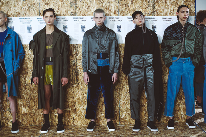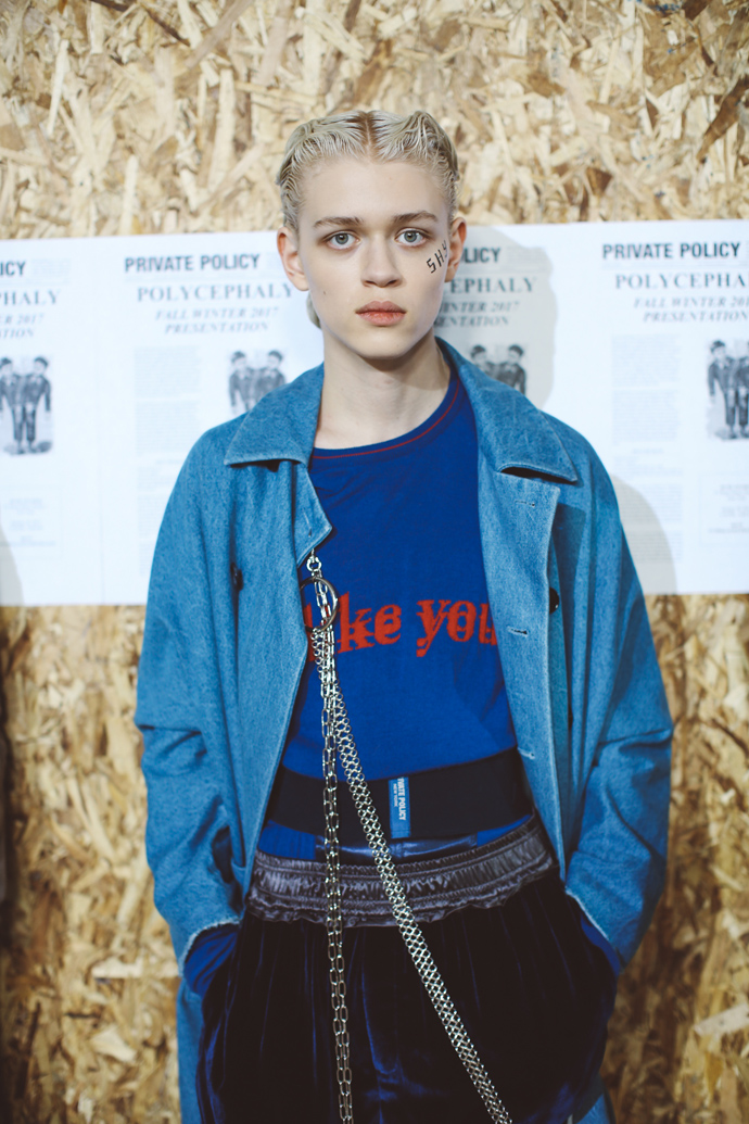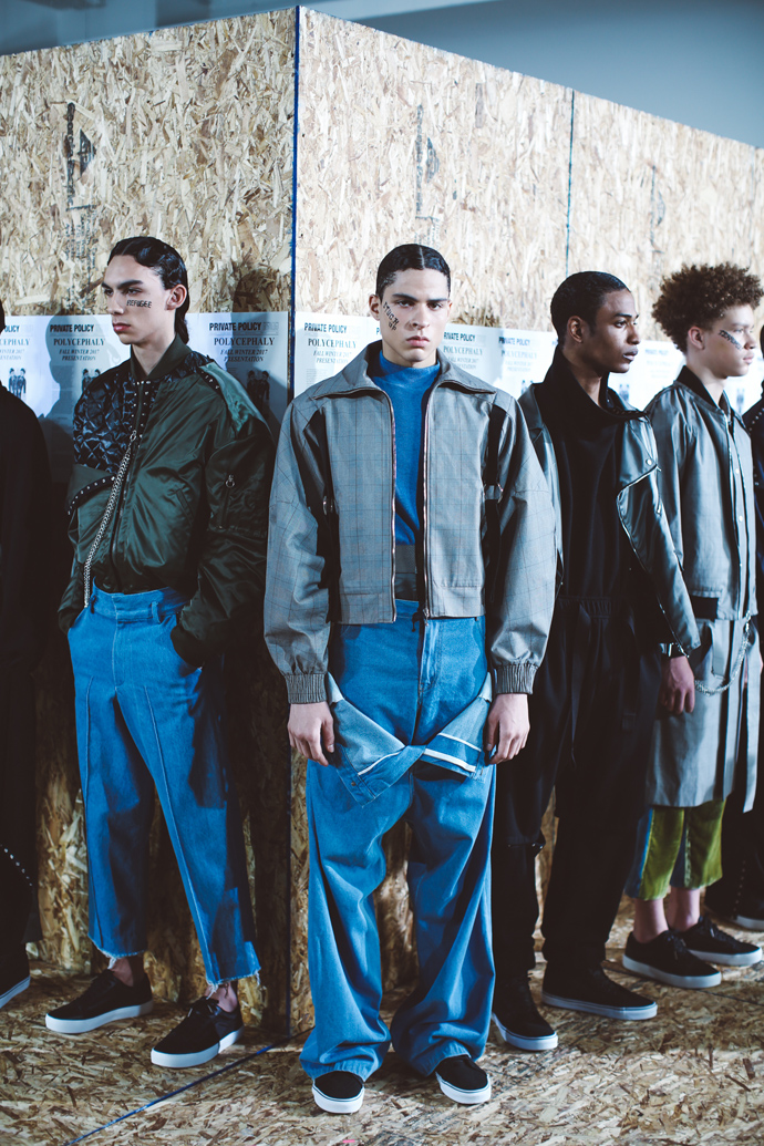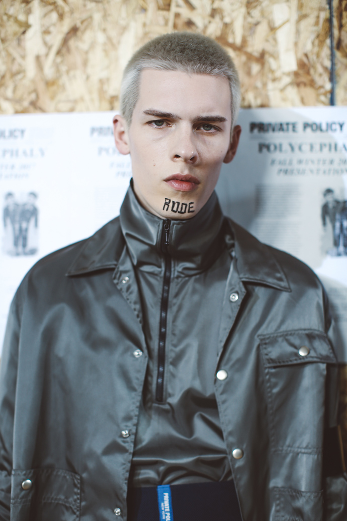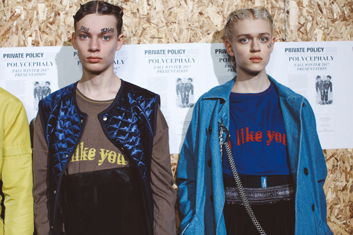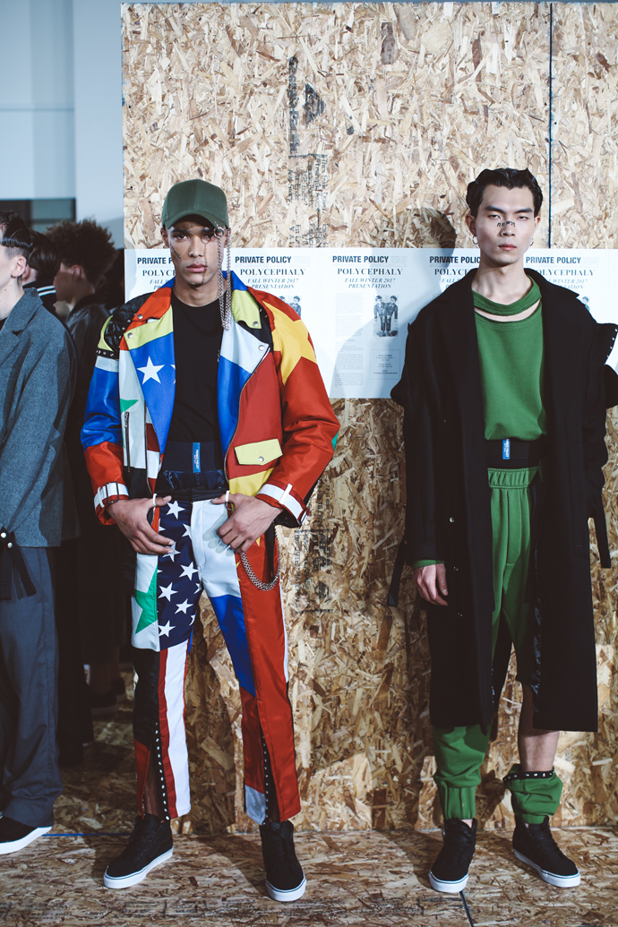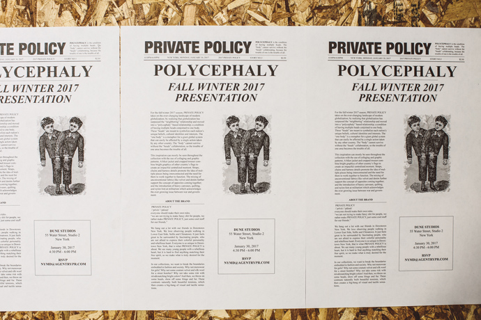 For the Fall/Winter 2017 season, PRIVATE POLICY takes on the ever-changing landscape of modern globalization; by realizing that globalization has surpassed the “neighboring” relationship and moved into a “polycephaly” based relationship; a condition of having multiple heads conjoined to one body. These “heads” are meant to symbolize each nation’s unique beliefs, cultural identities and interests. The “one body” is a metaphor for a giant global system that can easily be affected by a single action taken by any other country. The “body” cannot survive without the “heads” collaboration, so the trouble of one area becomes the trouble of all.