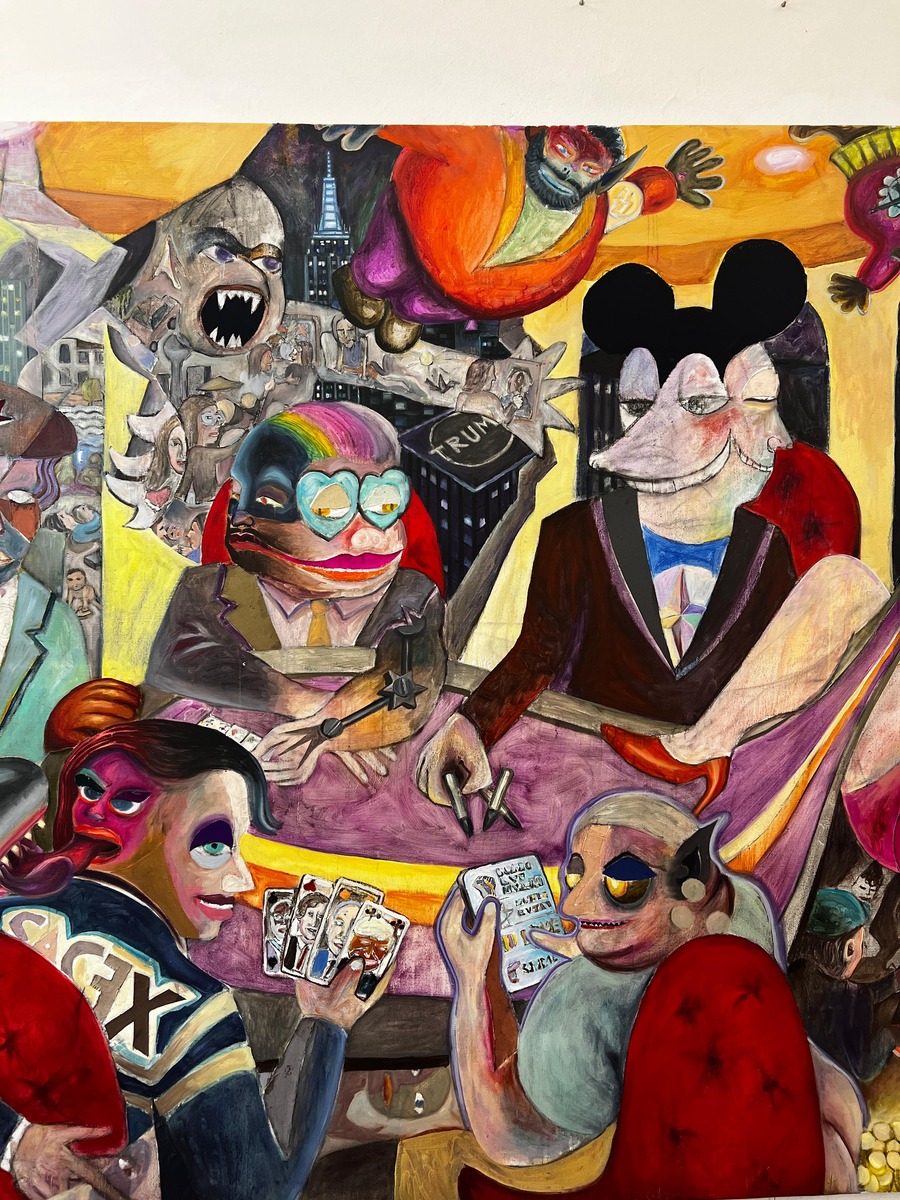 Experience Armin Boehm’s visceral solo show, where chaotic scenes expose deep human emotions through a mix of allegory and satire. Boehm critiques modern social and political landscapes with a keen, almost medieval eye. His textured canvases, infused with fabric patches and layered hues, depict morphing figures and hybrid identities, reflecting the performative nature of contemporary society. From a dystopian casino to a puppeteer of political figures, Boehm’s work captures the absurdity and complexity of today’s world.