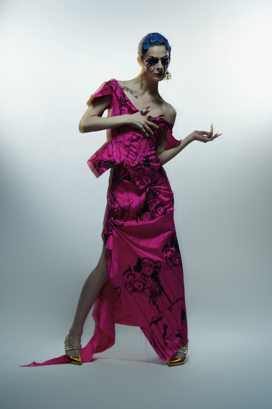 F/W23 ’Everything I Need Is Within Me’ is an ode to Adam’s mental health and his emergence back into doing what he loves after one of the hardest periods of his life involving heartache and sexual health woes. The first point of inspiration for the collection was ’Doxycycline’ medication, electric pink and blue candy-coloured packaging, usually taken for an STD. Frost aims to create beauty out of the mundane, and uses his self-deprecating sense of humour to create something fabulous or as he likes to call it ’working class couture.’