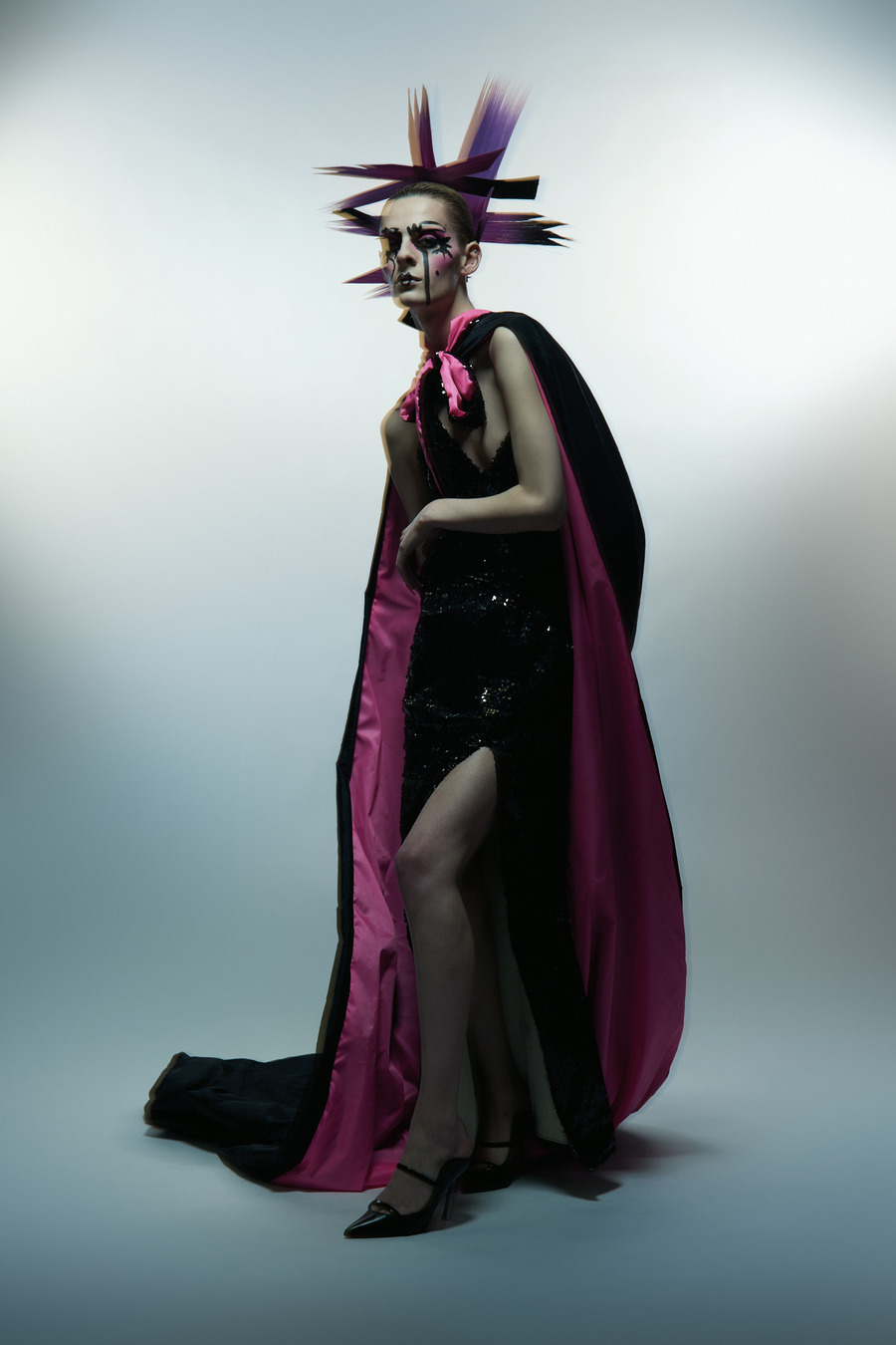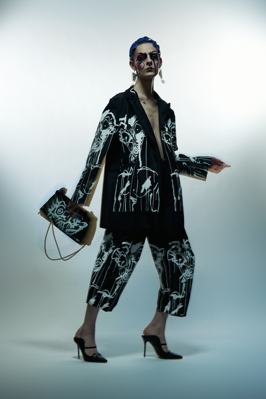 “It’s midnight at the discotheque; adorned in screen-printed silk, a corset and a sculptural fur coat. I make my way through the door. Grace Jones is now banned, she threw up on her silk taffeta cape last week. I put my glasses on, sober in my mind. Roisin Murphy and Bjork blaring through the airways. Next thing I know, I’m snogging a fit lad in the bathroom, chatting crap with a margarita cocktail in hand – spicy, of course. I wake up, put my massive glasses on and think, what a great night. I feel sexy again, I needed that release. Now it’s time for me to meditate and repeat ’I am enough.’”