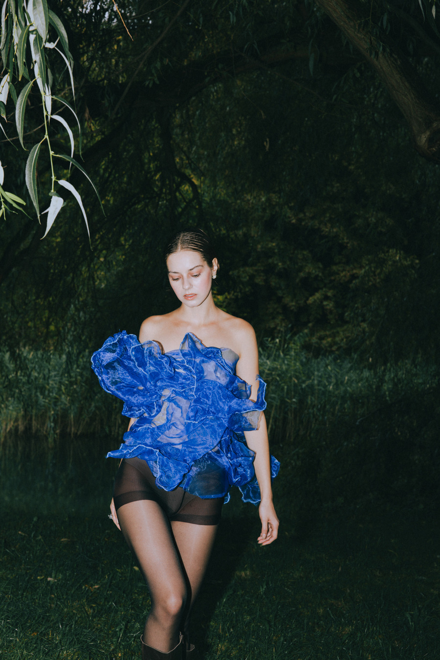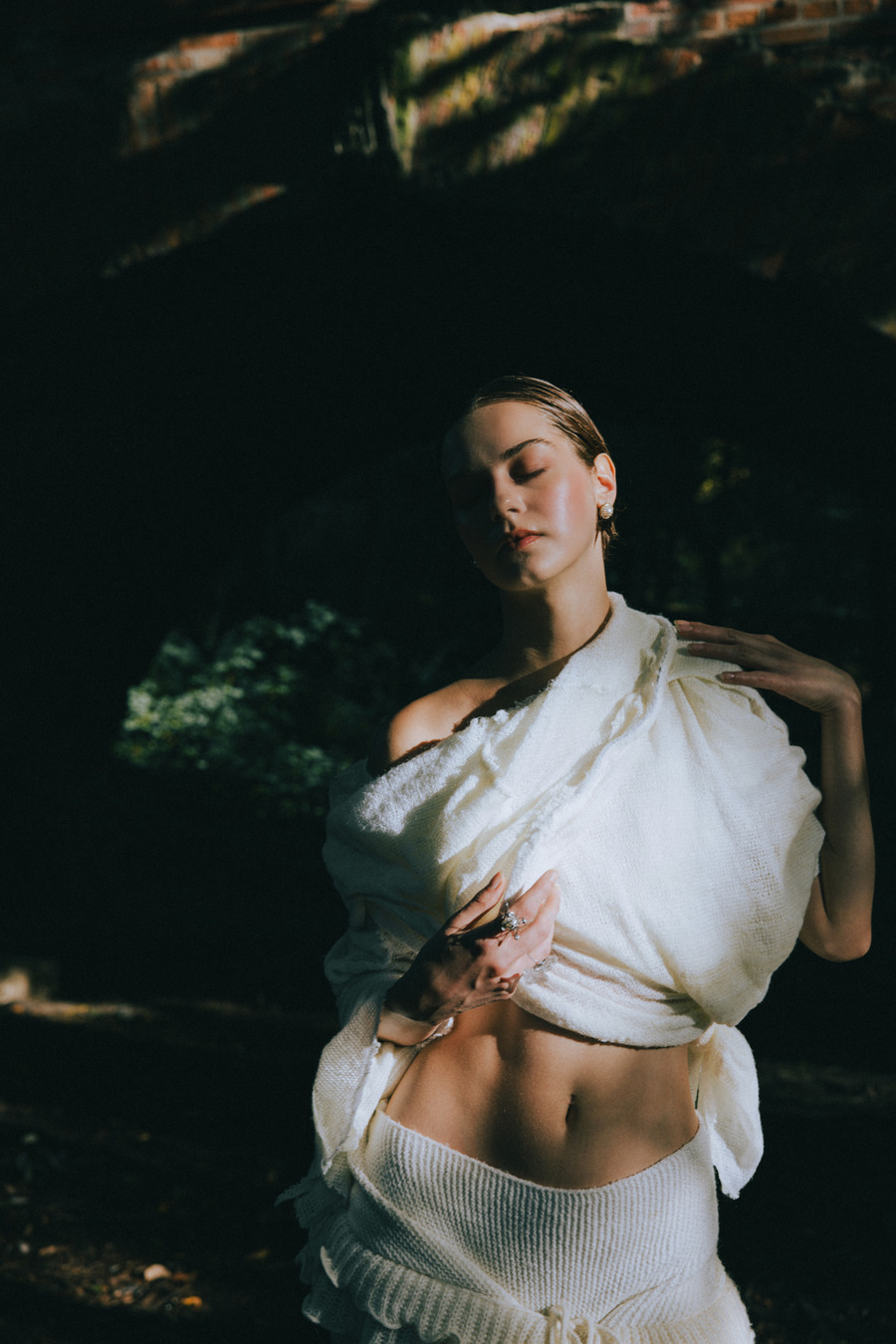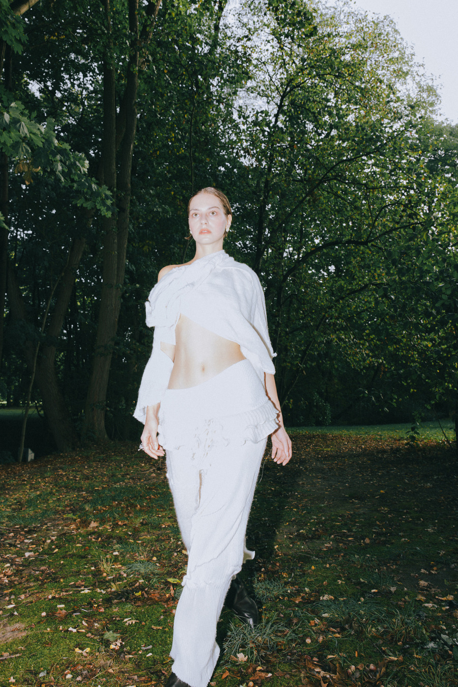 A KALTBLUT exclusive. Photography by Zuzanna Czaplak. The stylist and costume designer is Maryia Tratsiakova. The model is Aniela. “I am a fashion designer from Warsaw (Poland), who works in both commercial and artistic fields. The “Afterimage” project results from collaborating with young designer Maryia Tratsiakova, a student at the Academy of Fine Arts, fashion department. This collaboration resulted in a photo shoot in Arcadia Park. The delicate and ethereal character of the styling was partially broken by strong flash, which gave the photos a unique atmosphere.” *Maryia Tratsiakova