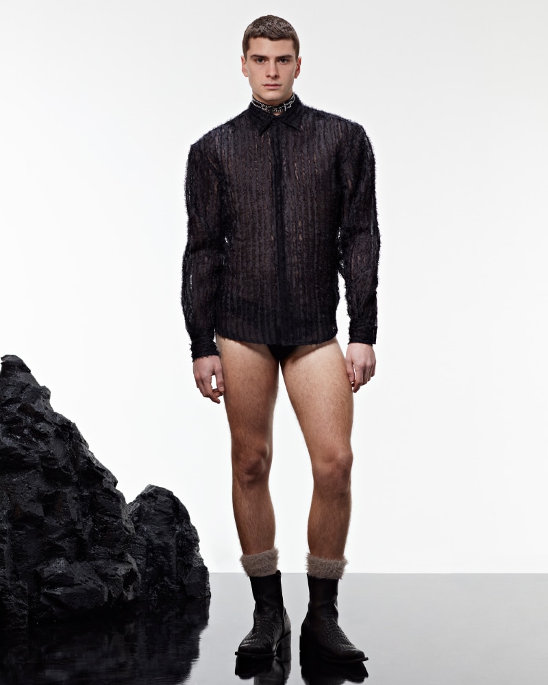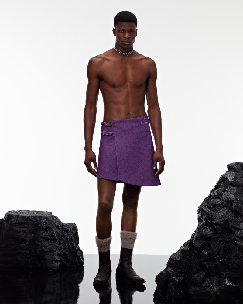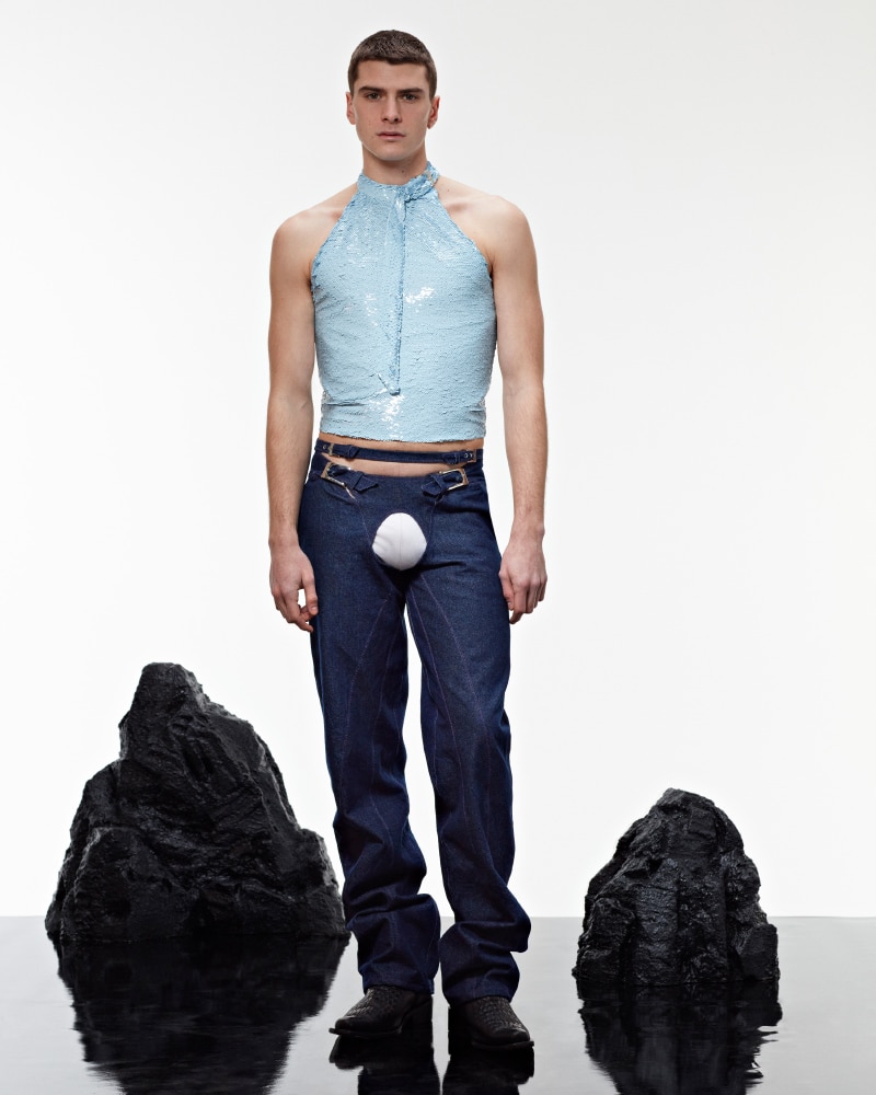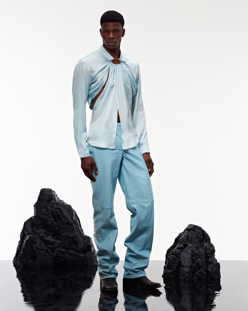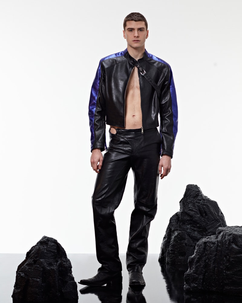 Albarella presents its Fall/Winter 2023 collection titled “HUNTY”, inspired by the designer’s own experiences while growing up queer in Southern Italy. He had to hybridize a strong masculine stance with signifiers that also allowed for his feminine side to transpire.