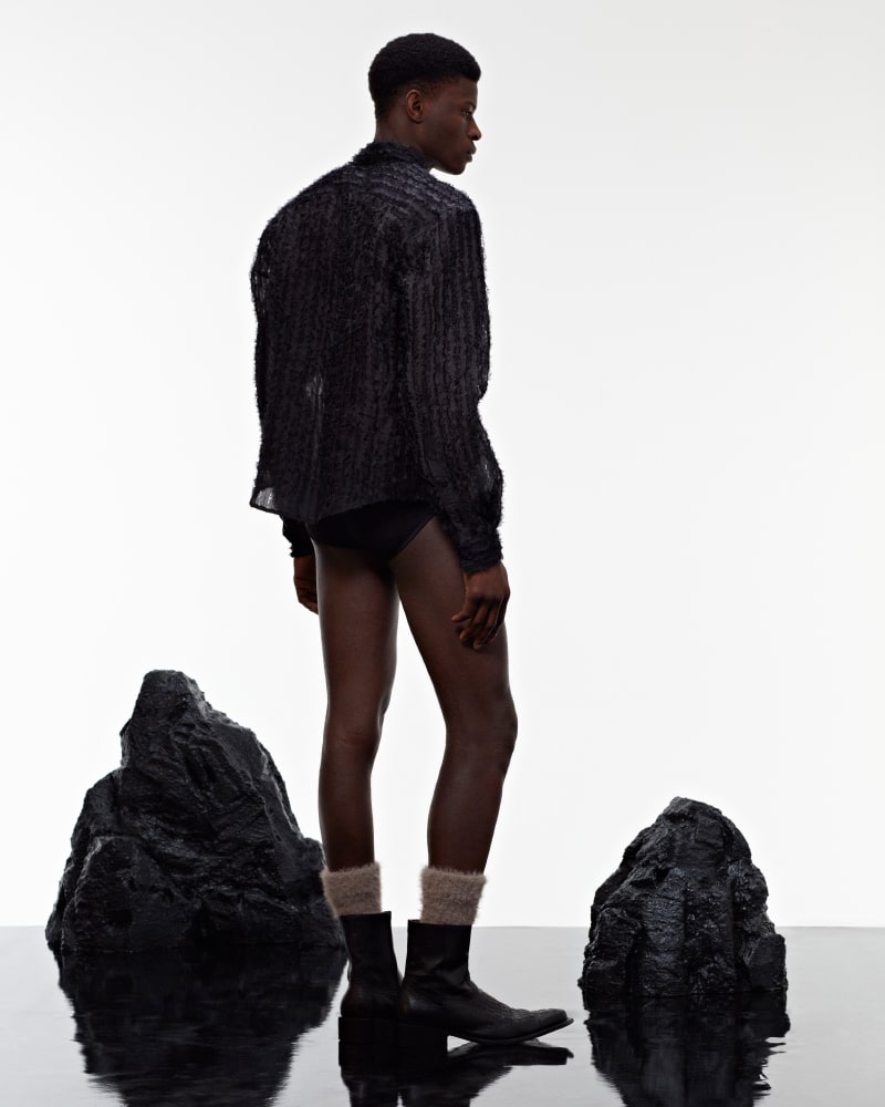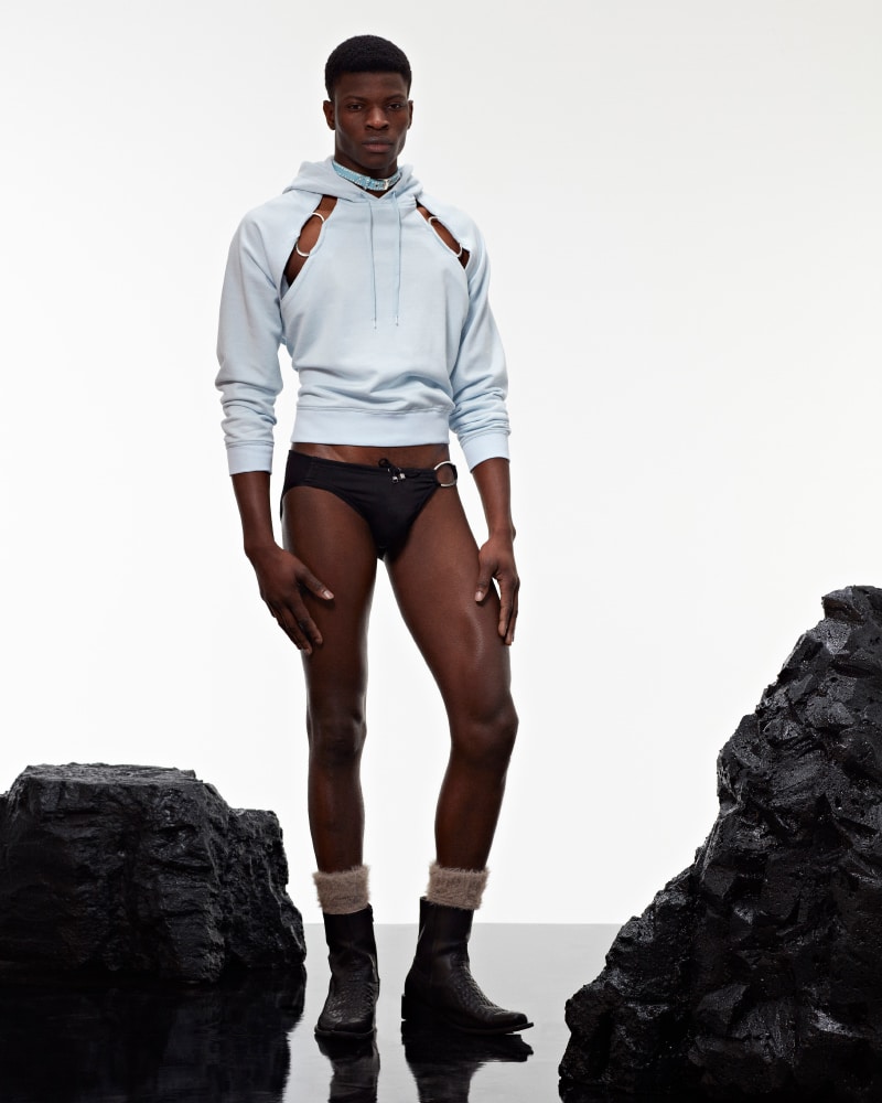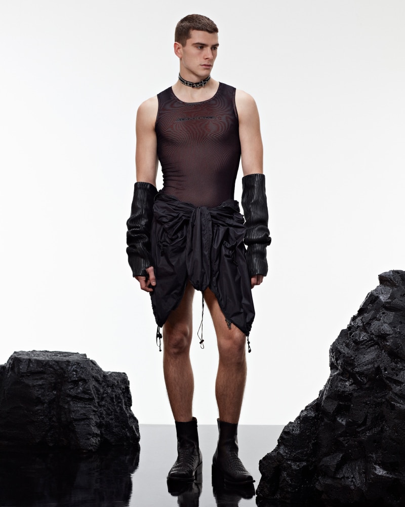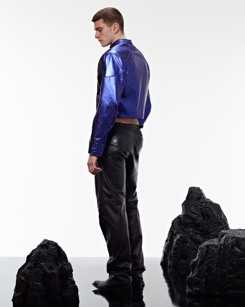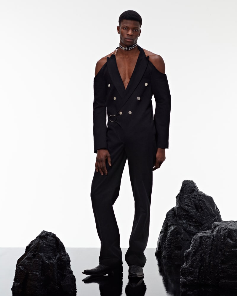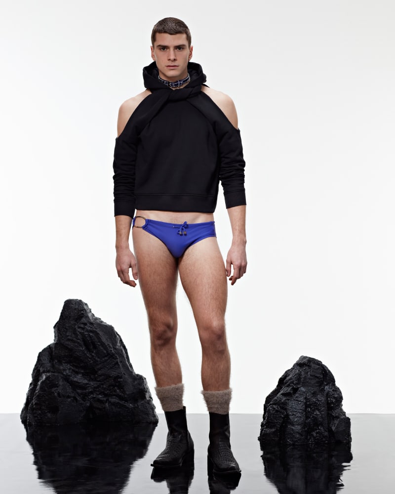 Albarella presents its Fall/Winter 2023 collection titled “HUNTY”, inspired by the designer’s own experiences while growing up queer in Southern Italy. He had to hybridize a strong masculine stance with signifiers that also allowed for his feminine side to transpire.