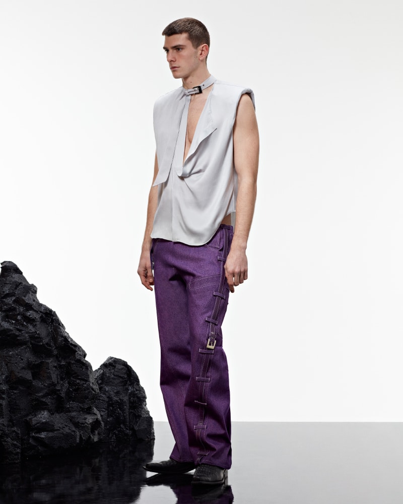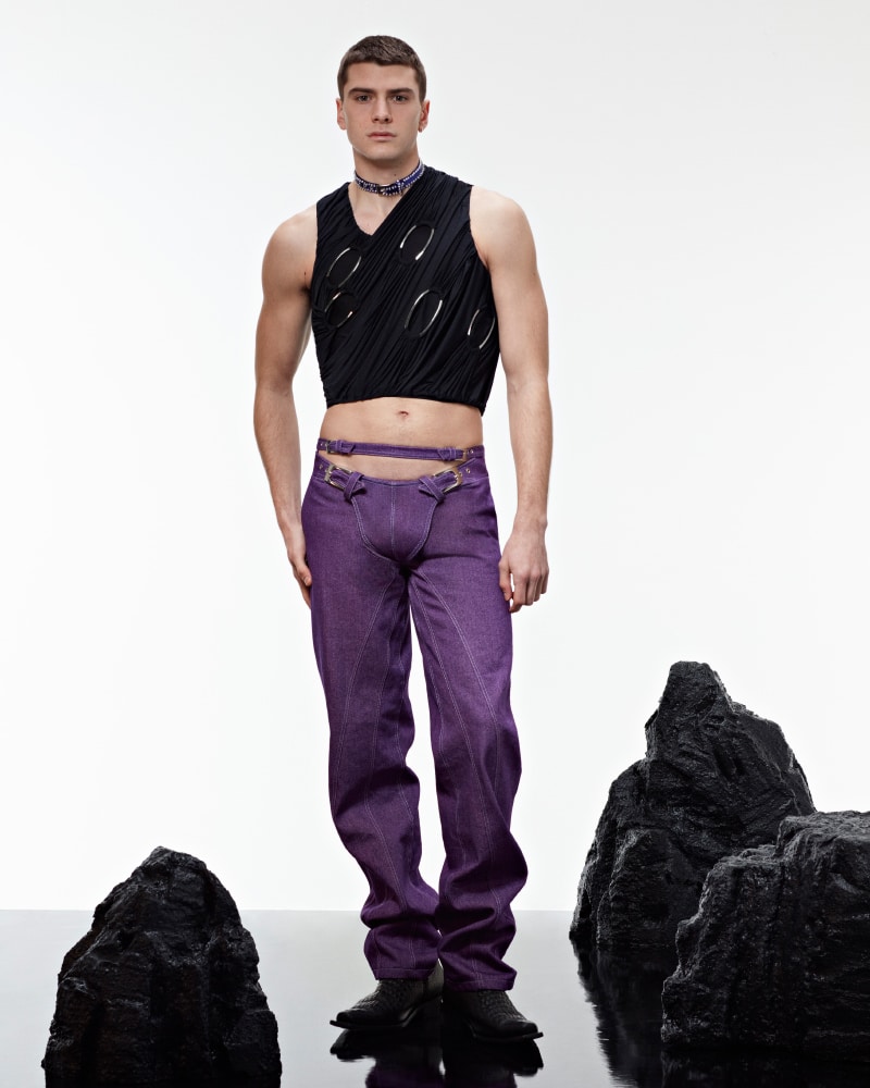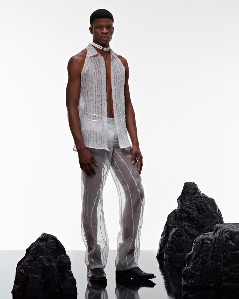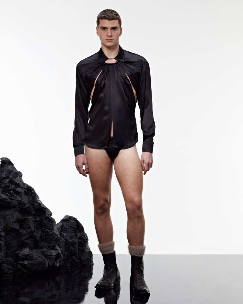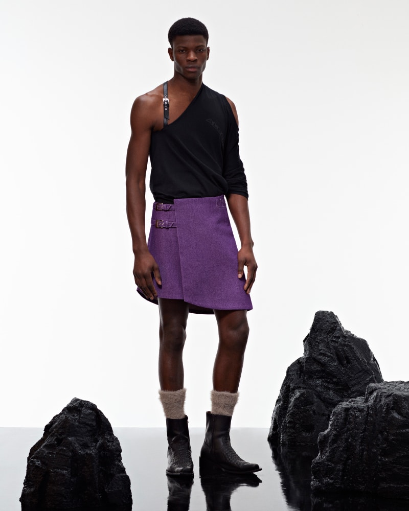 Albarella presents its Fall/Winter 2023 collection titled “HUNTY”, inspired by the designer’s own experiences while growing up queer in Southern Italy. He had to hybridize a strong masculine stance with signifiers that also allowed for his feminine side to transpire.