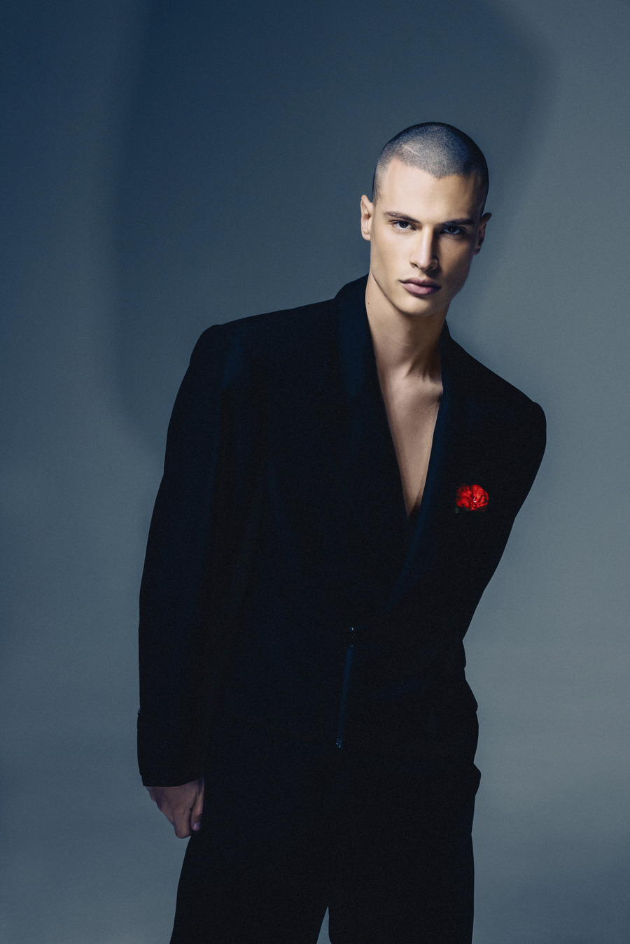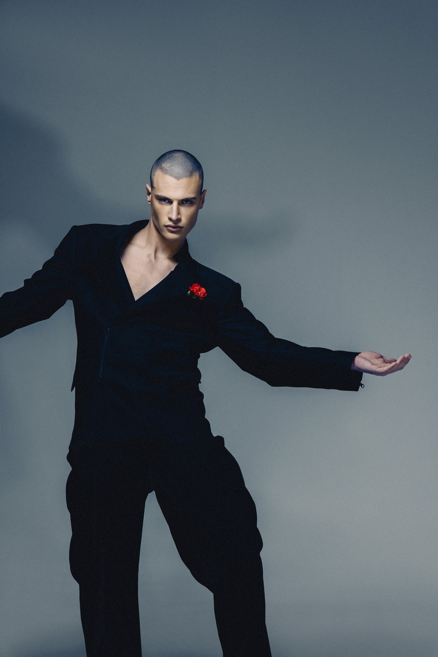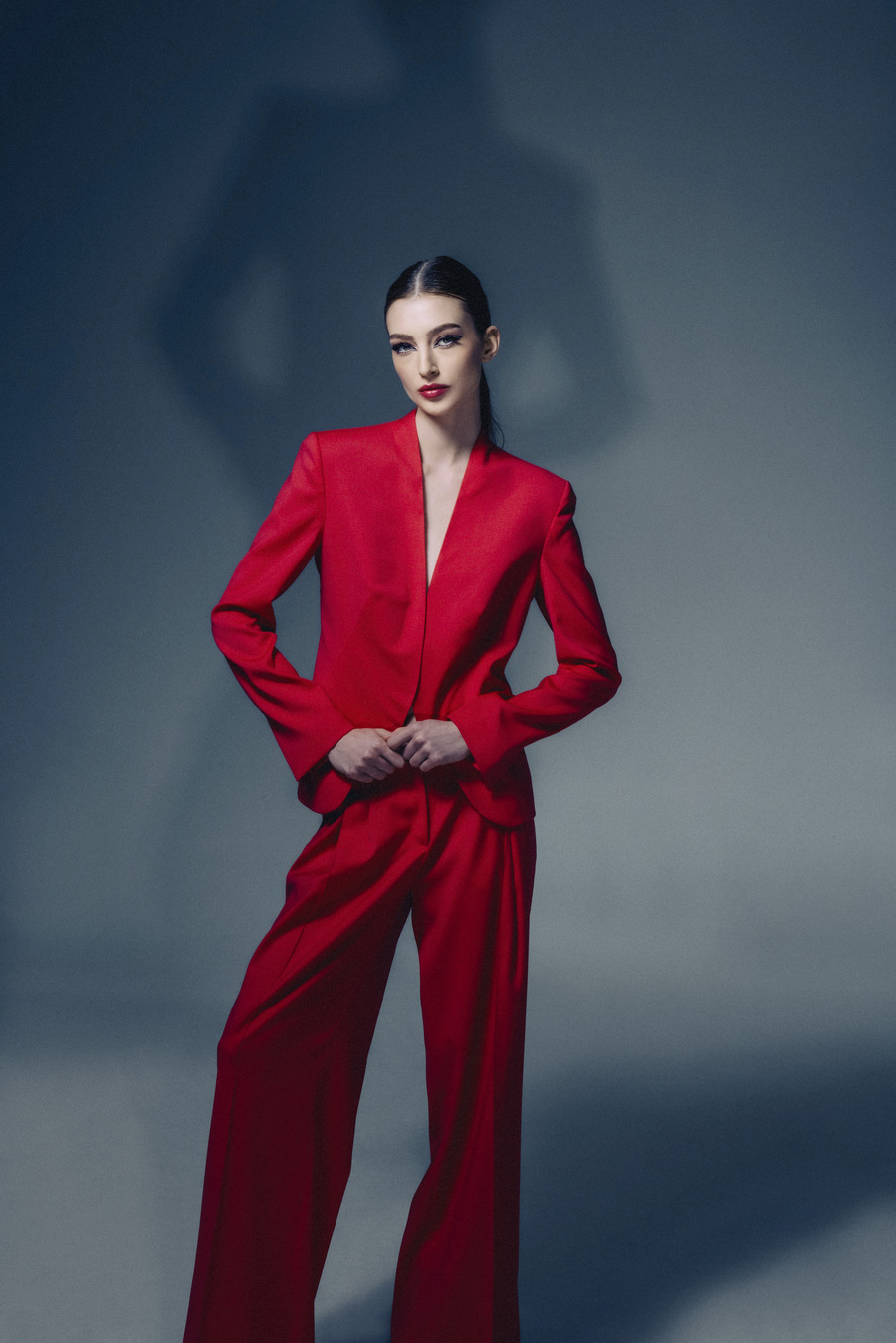 Alexandar Nikolich’s new F/W25 collection is a masterclass in modern elegance, blending sharp tailoring with fluid motion. The collection captures a striking interplay of contrasts—sleek black suits with fiery red accents, structured blazers against sheer corsetry, and bold silhouettes softened by graceful movement.