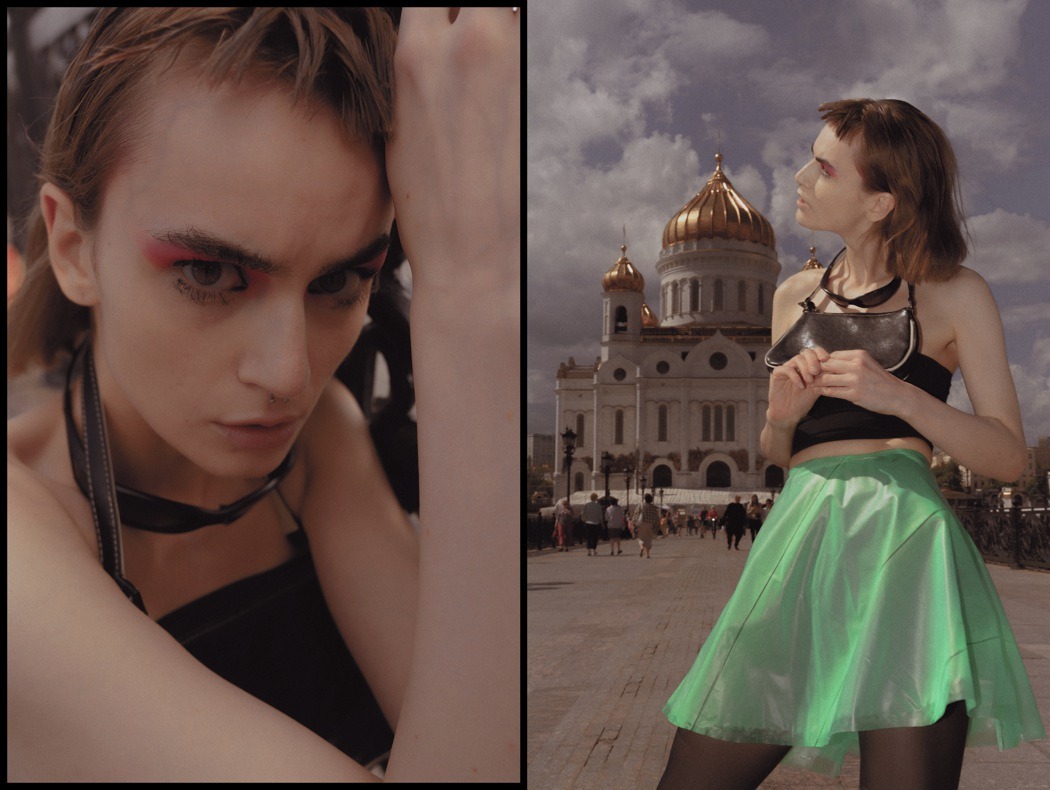 A KALTBLUT exclusive. Photography by Egr Ega. Model is Sophia. Styled by Ruslan Nasir. Fashion: ASOS latex pants, Auchan shopping bag, Bershka flared trousers, all other clothing and accessories – vintage. MakeUp by Tanya Levenets.