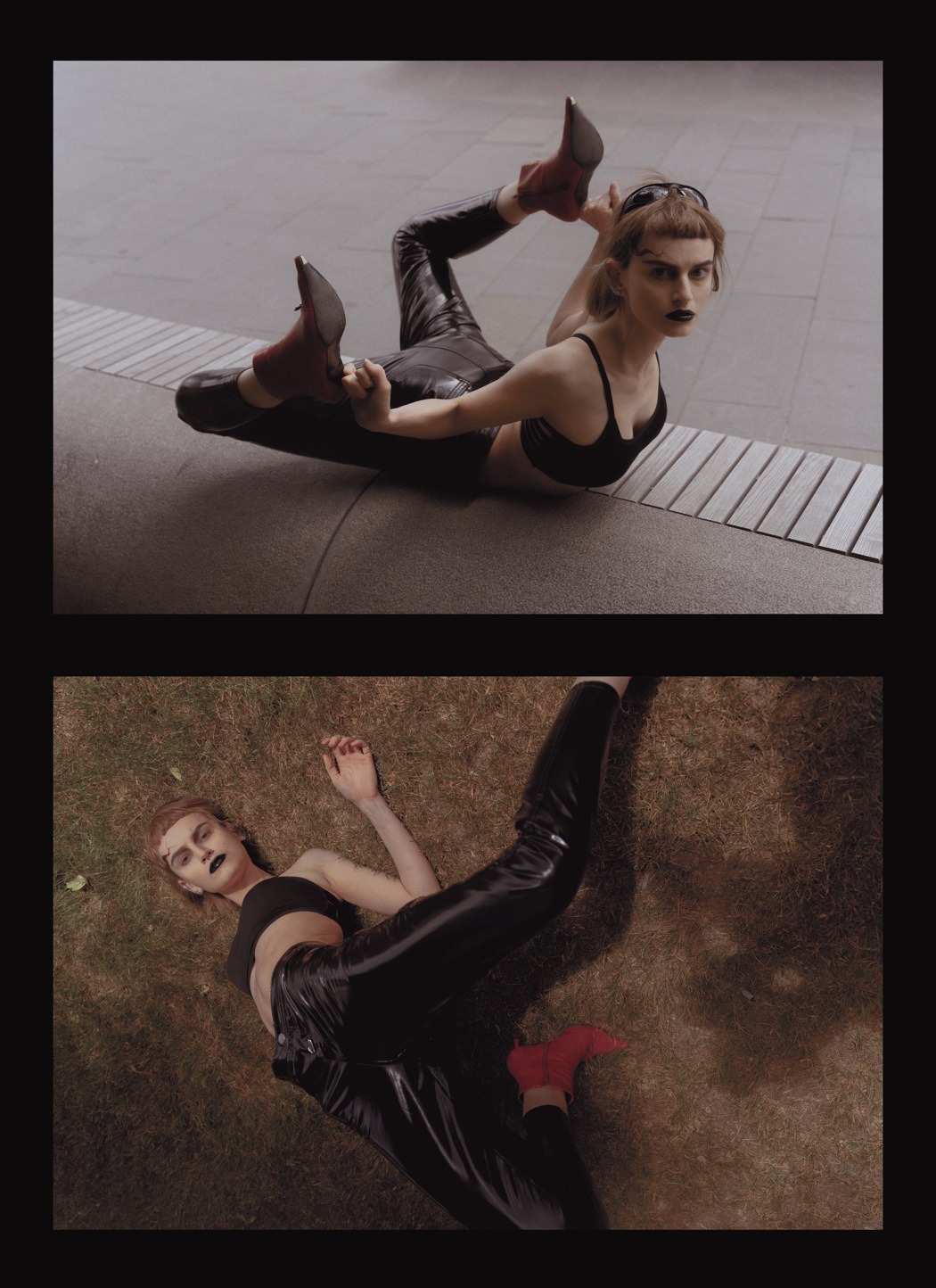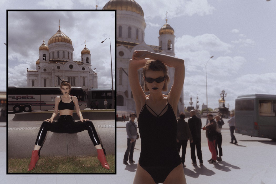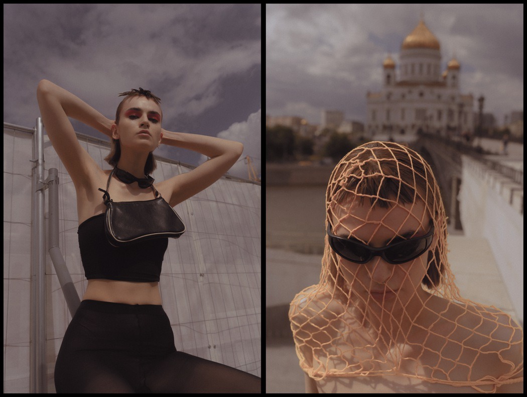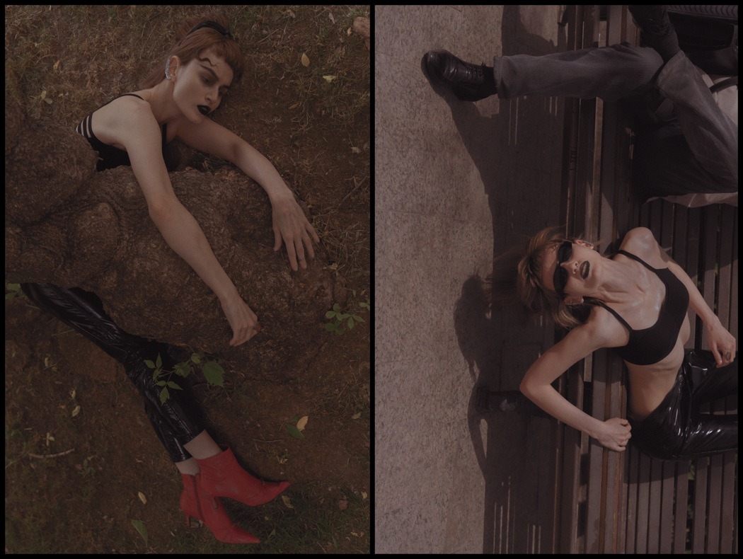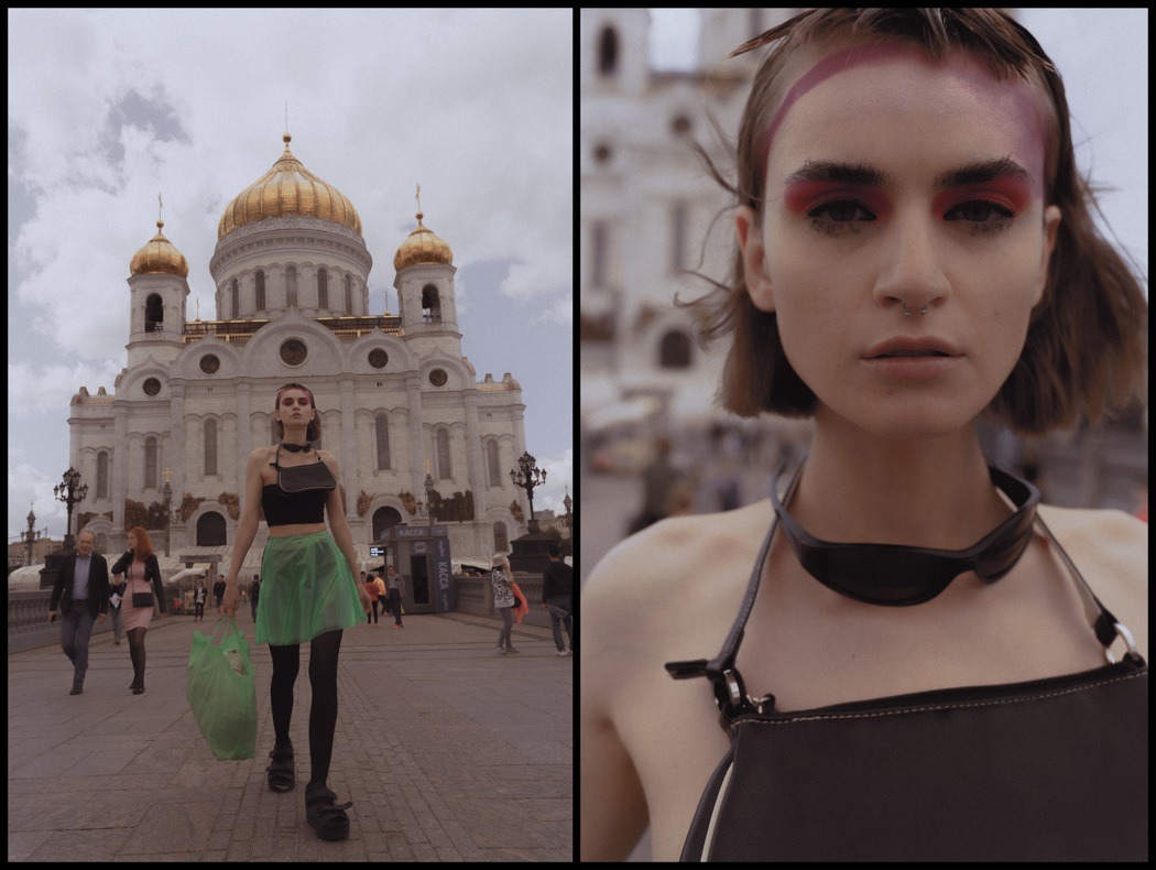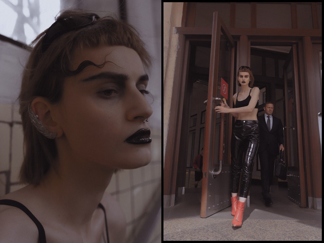 A KALTBLUT exclusive. Photography by Egr Ega. Model is Sophia. Styled by Ruslan Nasir. Fashion: ASOS latex pants, Auchan shopping bag, Bershka flared trousers, all other clothing and accessories – vintage. MakeUp by Tanya Levenets.