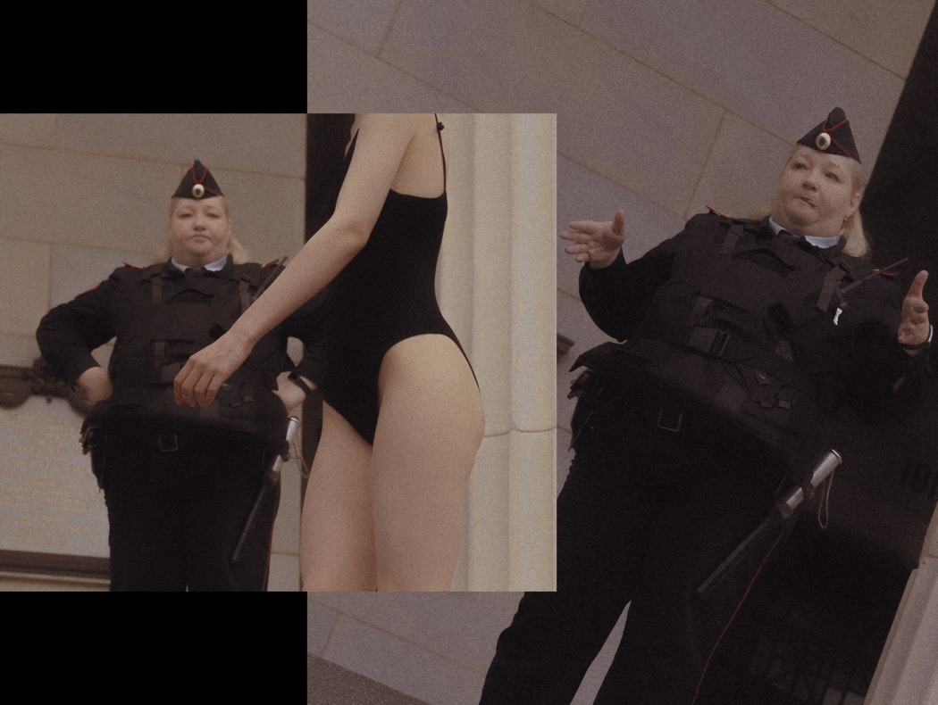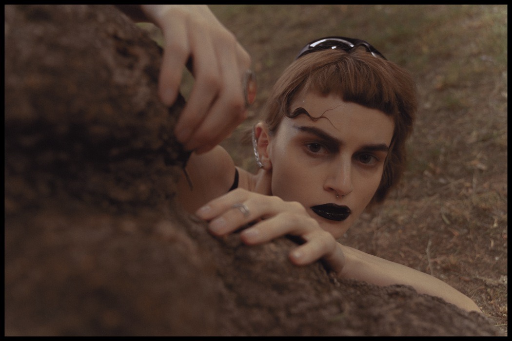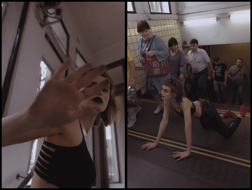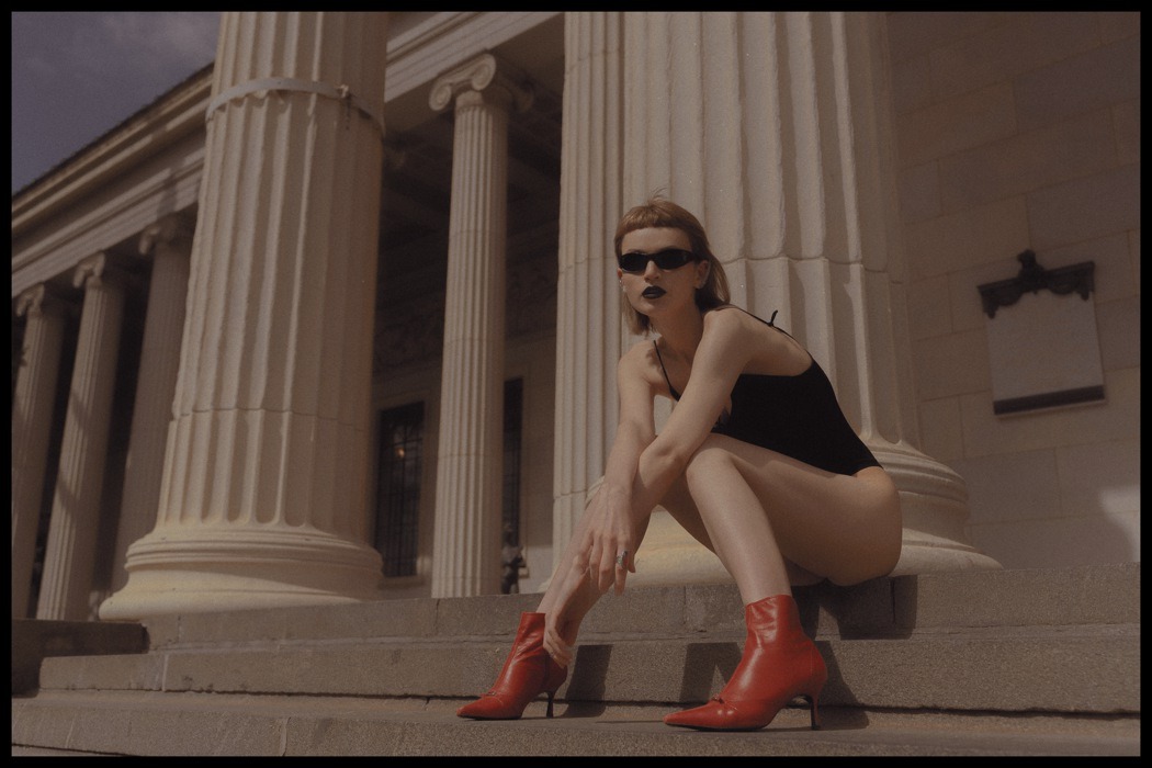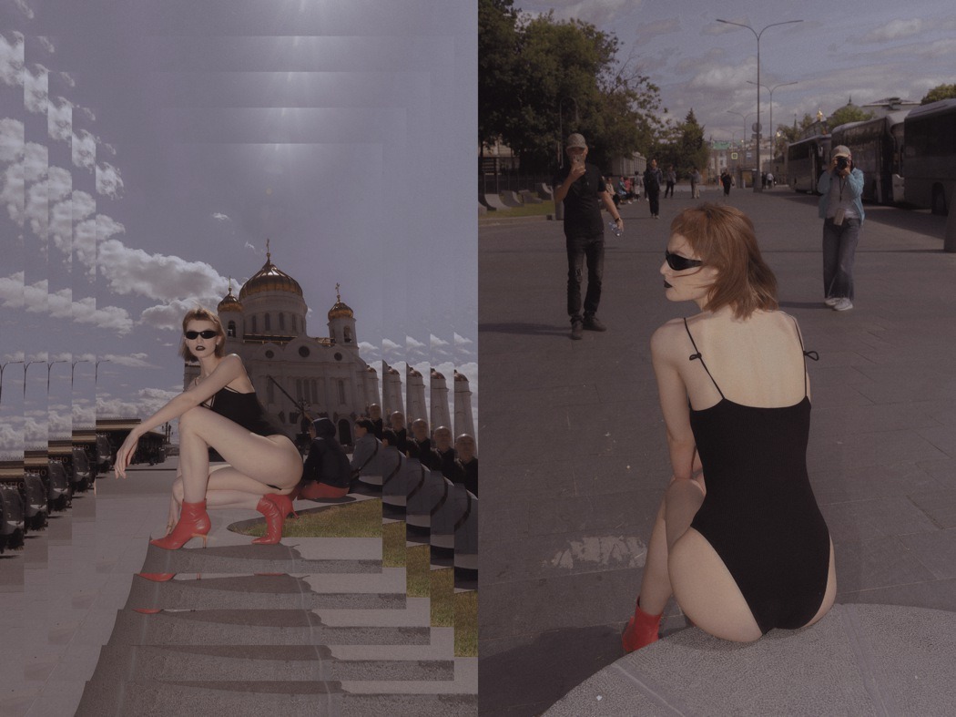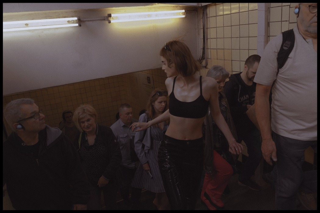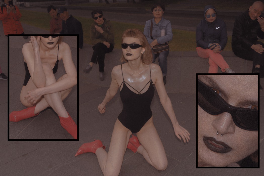 A KALTBLUT exclusive. Photography by Egr Ega. Model is Sophia. Styled by Ruslan Nasir. Fashion: ASOS latex pants, Auchan shopping bag, Bershka flared trousers, all other clothing and accessories – vintage. MakeUp by Tanya Levenets.