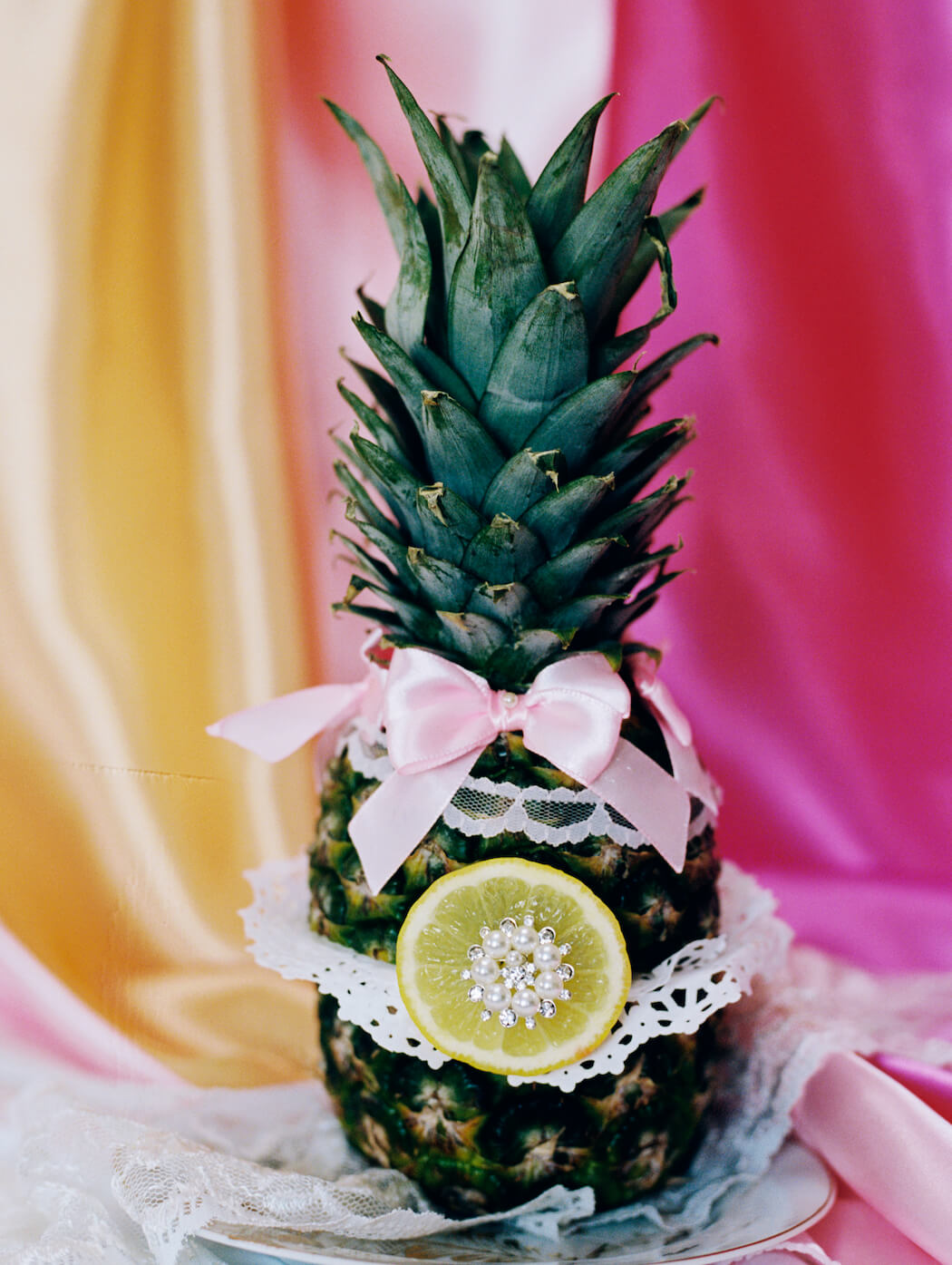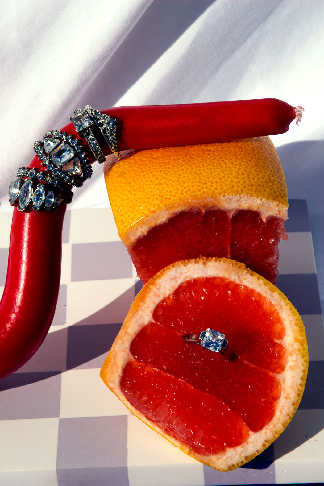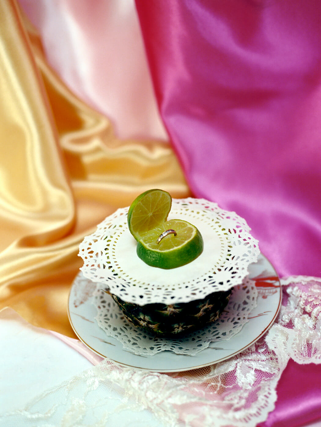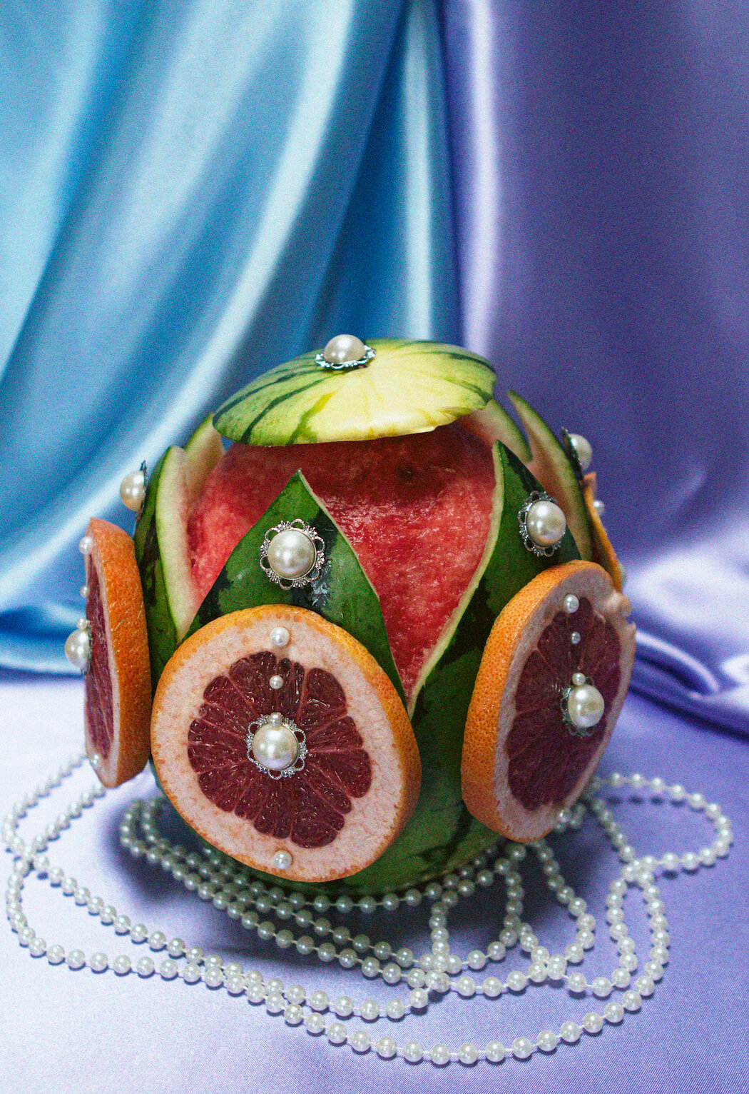 “This still life series features my deepest love and respect for women and fashion. Lockdown prevented me from photographing models so I began to dress fruit as if they were women and the idea of objectification
