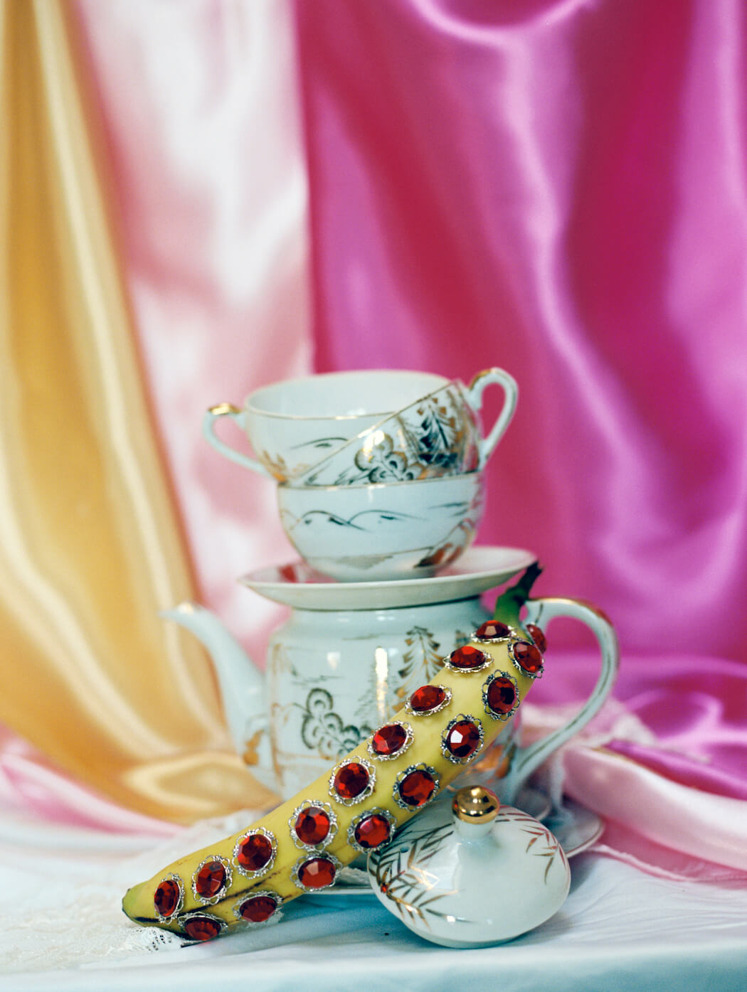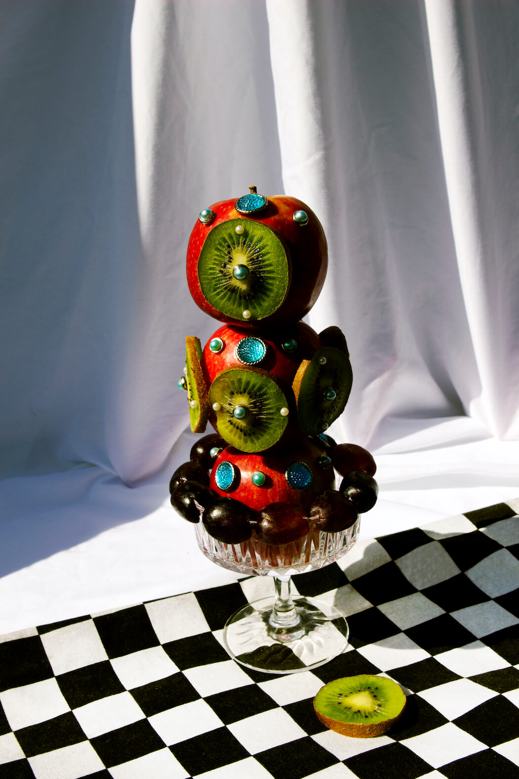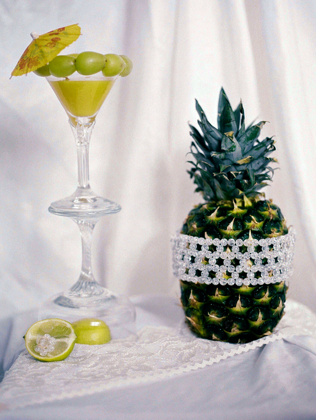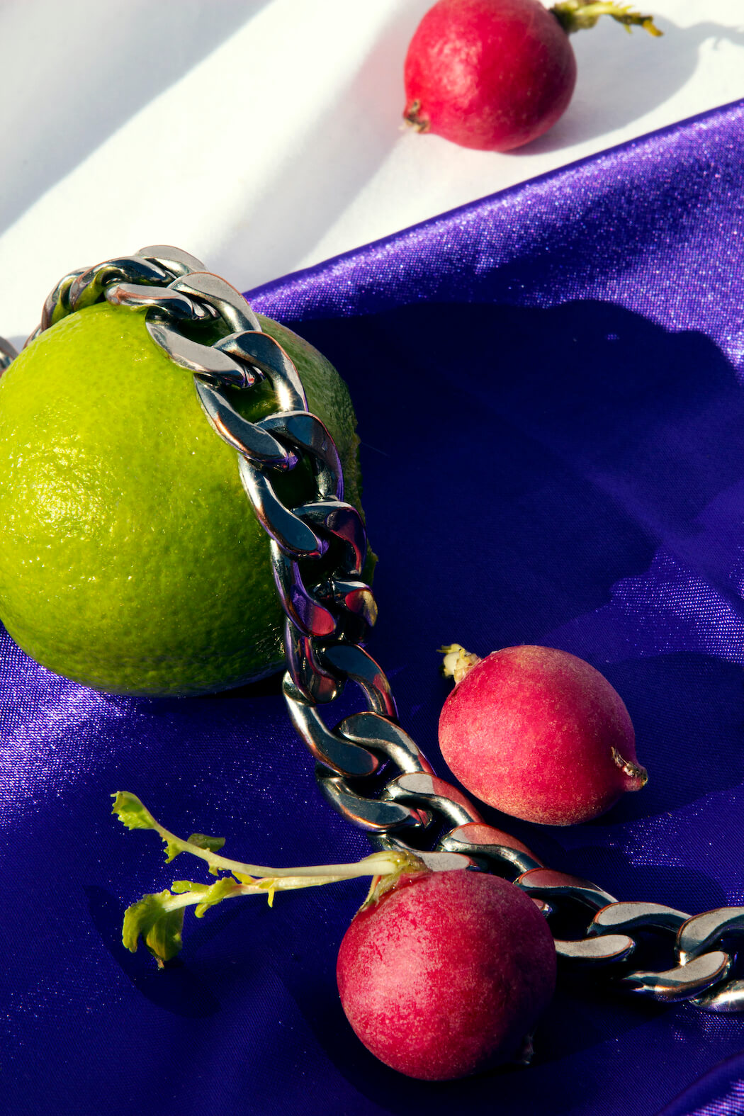 “This still life series features my deepest love and respect for women and fashion. Lockdown prevented me from photographing models so I began to dress fruit as if they were women and the idea of objectification