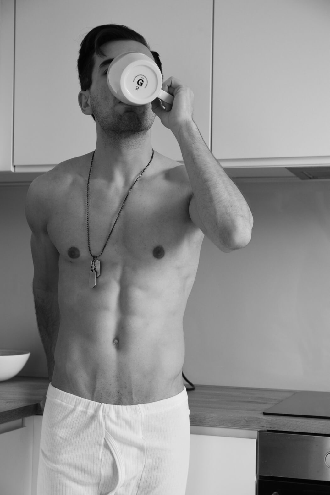 A KALTBLUT exclusive. Photographer Xander Hirsh captures Polish male model Michał Komarnicki, using pieces of male underwear with a twist of a classic wardrobe.