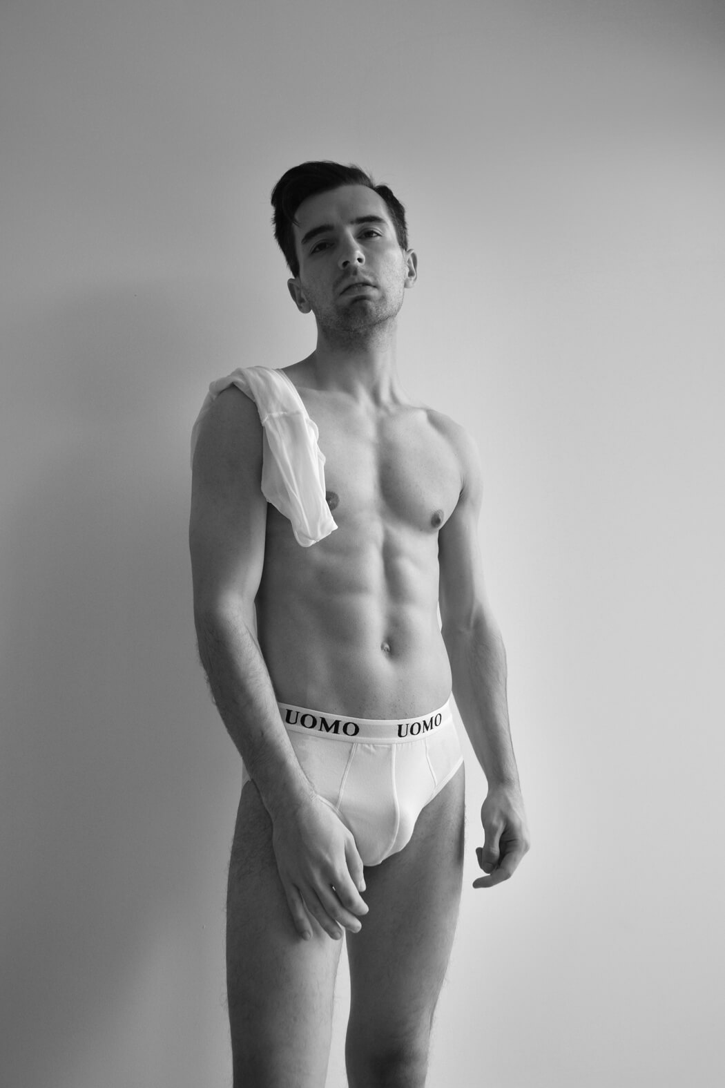 A KALTBLUT exclusive. Photographer Xander Hirsh captures Polish male model Michał Komarnicki, using pieces of male underwear with a twist of a classic wardrobe.