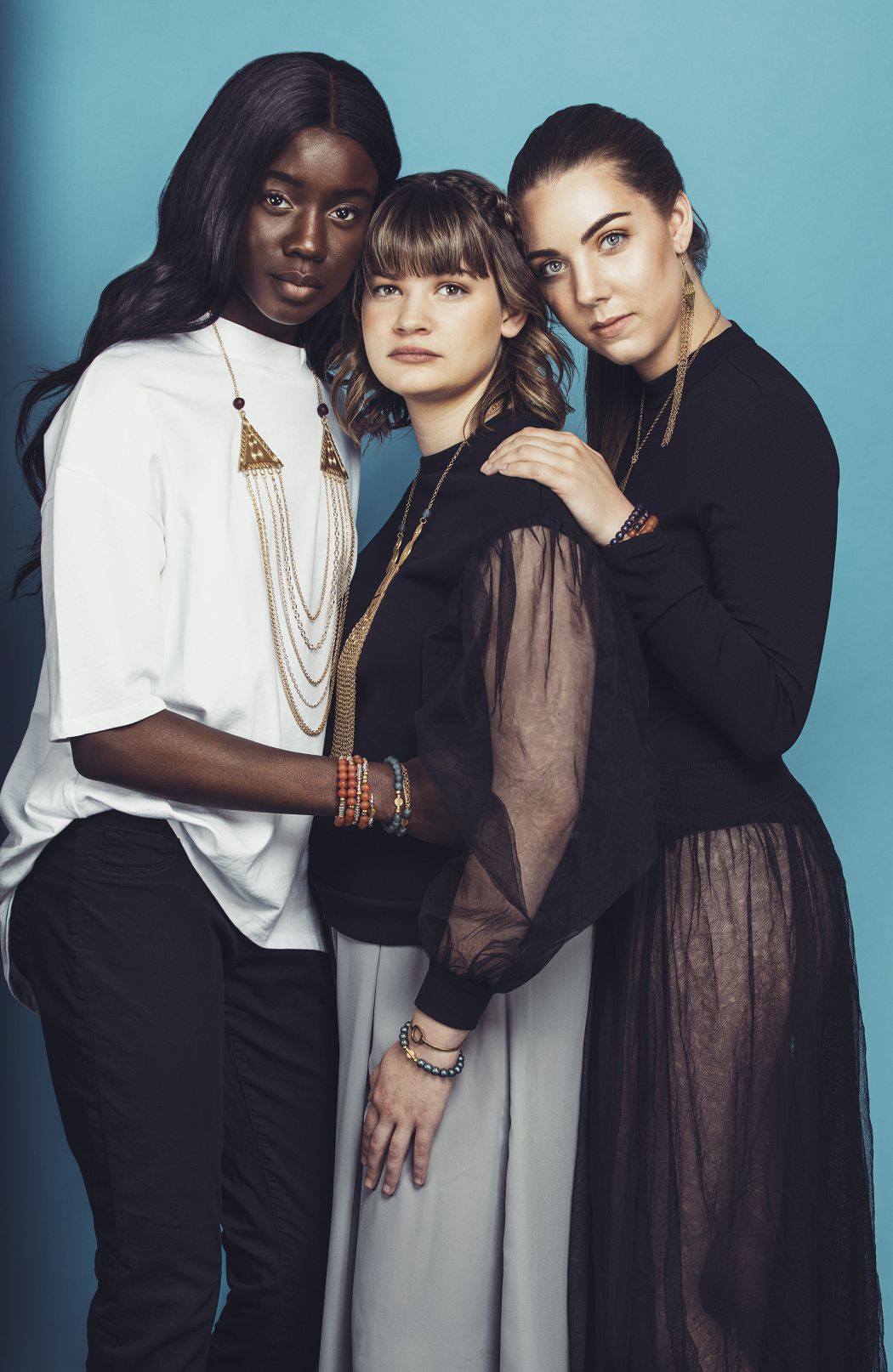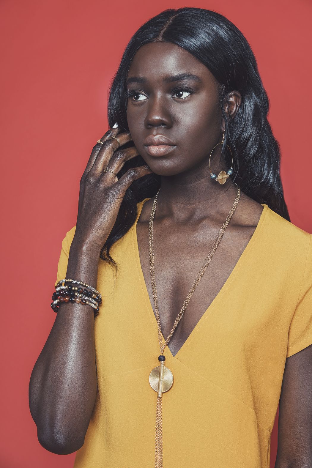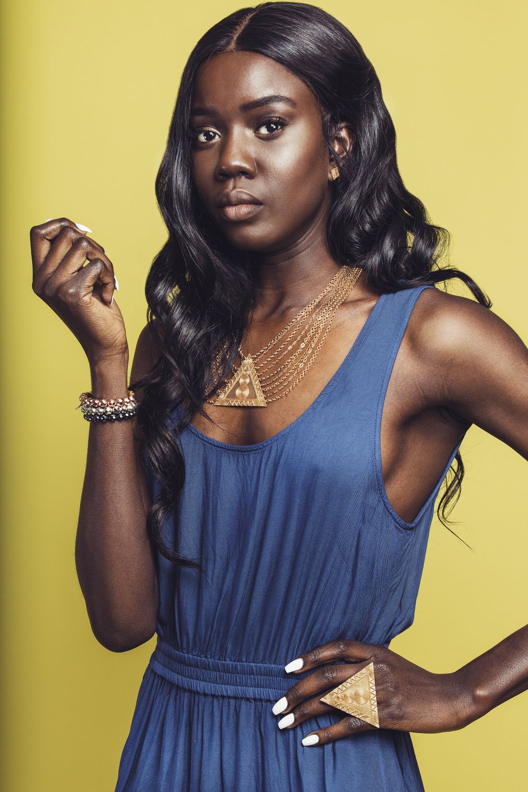 Introucing jewelry by Alora Boutique with an exclusive editorial. Photography by Darryl Pollock. Styling by Peter Njongwe. Models are Achok Thiik, Lachlan Burr, Patience Bush. Make up by SwizzleSticks Salon Spa. Hair by Zunny Hair.