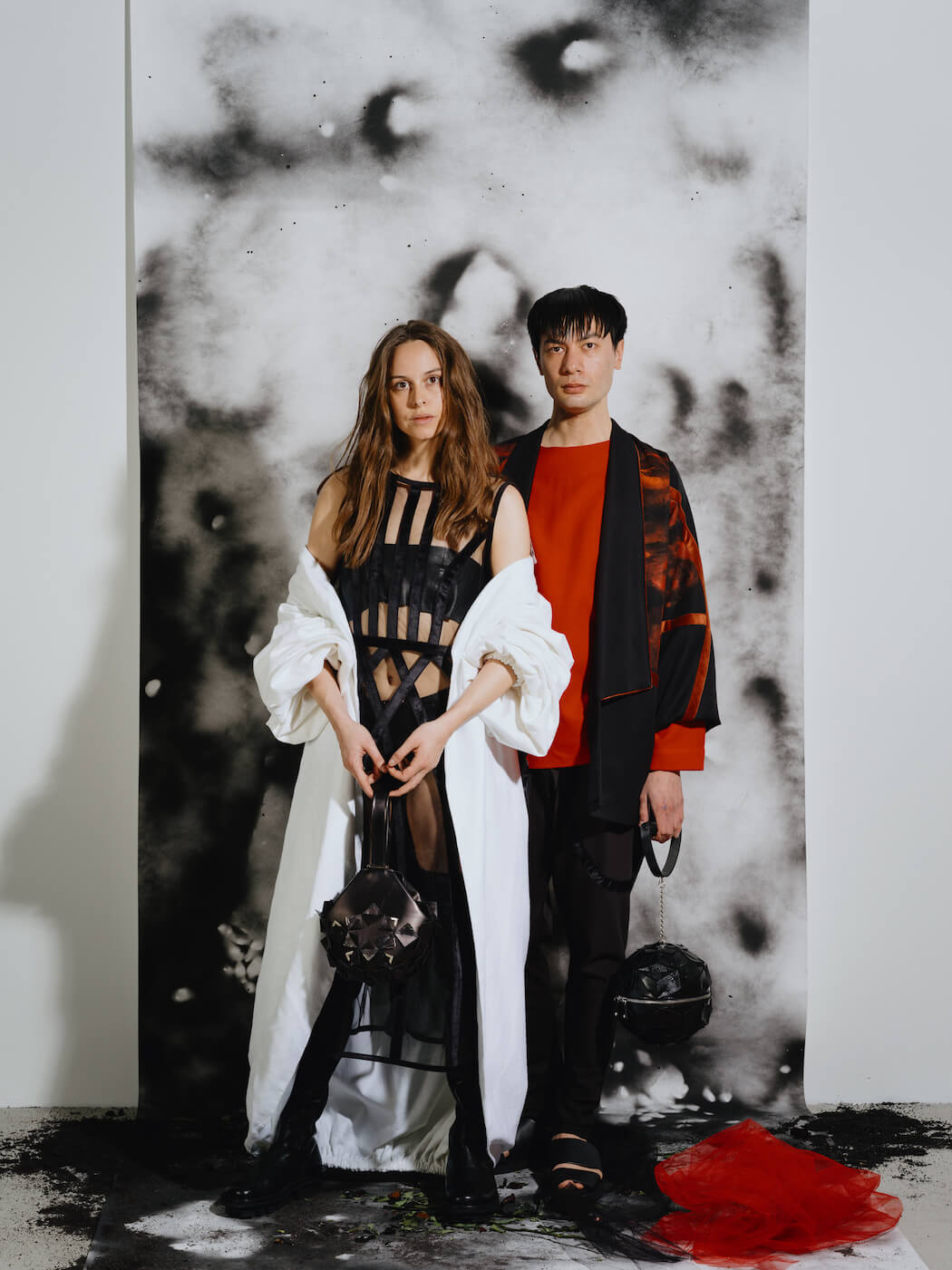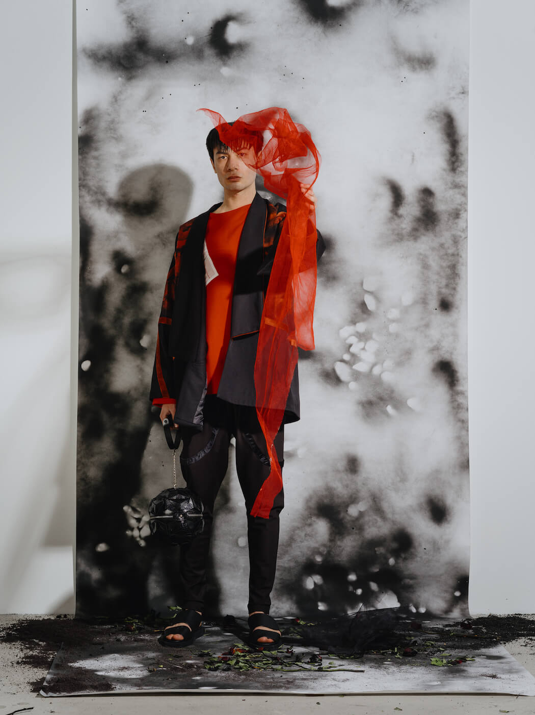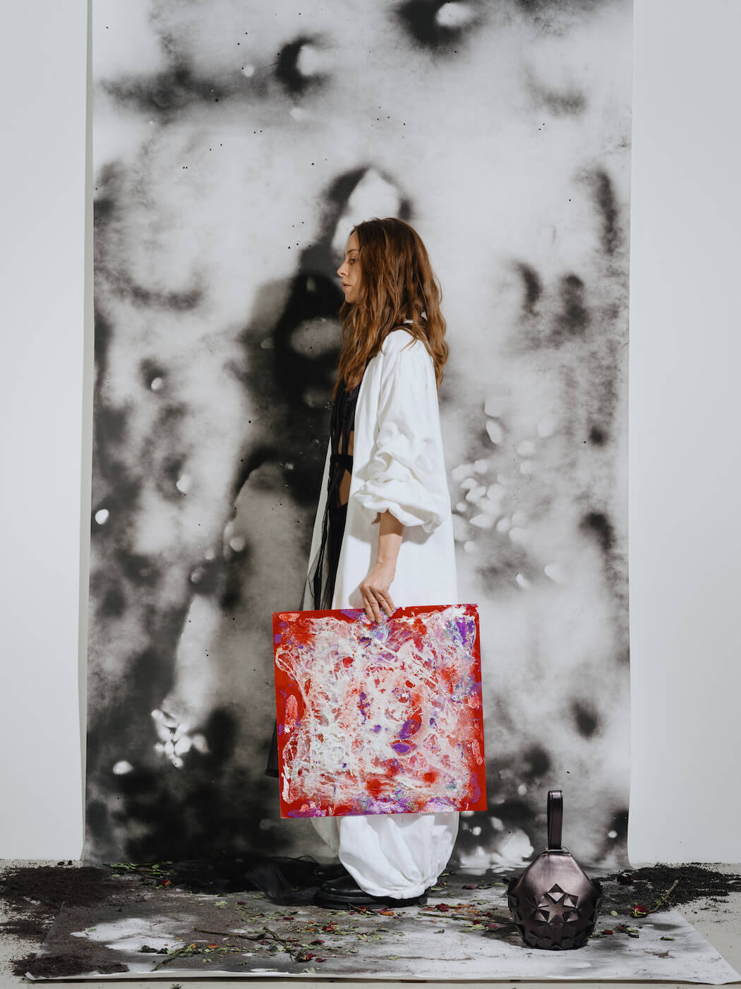 “My initial inspiration for this editorial came from Reza Nadimi’s aesthetic, that I could immediately connect to my friend’s work, Lucas Ngo. Lucas works on ink, paint, it can look quite dark and dramatic but very poetic at the same time. Then, I thought it could be a great opportunity to fuse our work which is very different but somehow matching together: his 4m long painting that we hang on the wall, and my multicoloured installations that are made from different materials that I usually work with. This collaboration is also a great way to share our work as artists and to see it in a different setting. Thanks to STUDIO183 for the opportunity“.