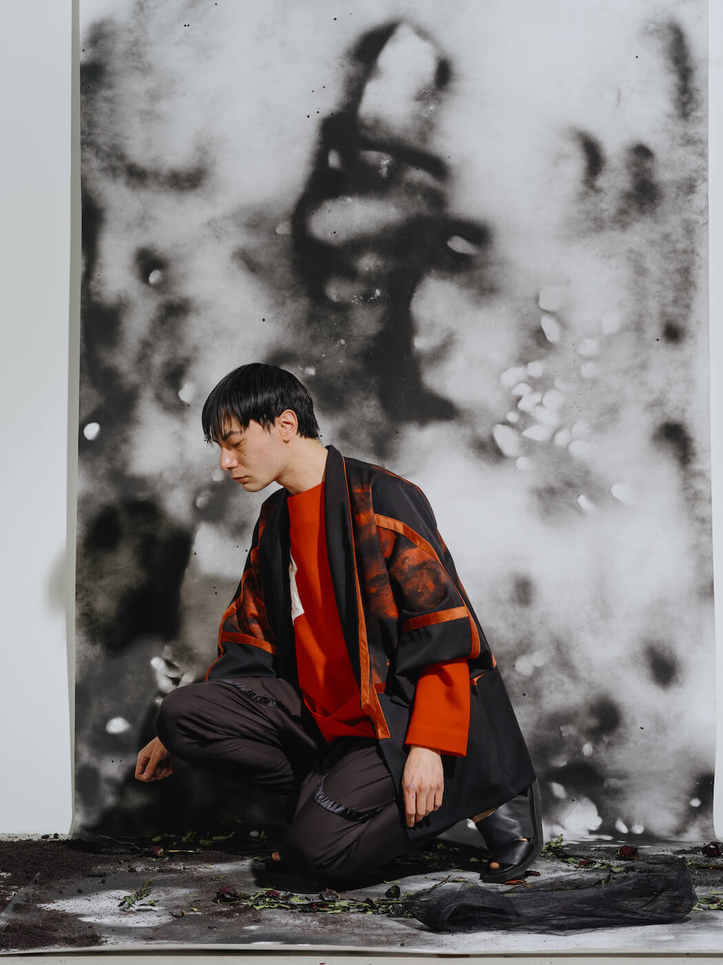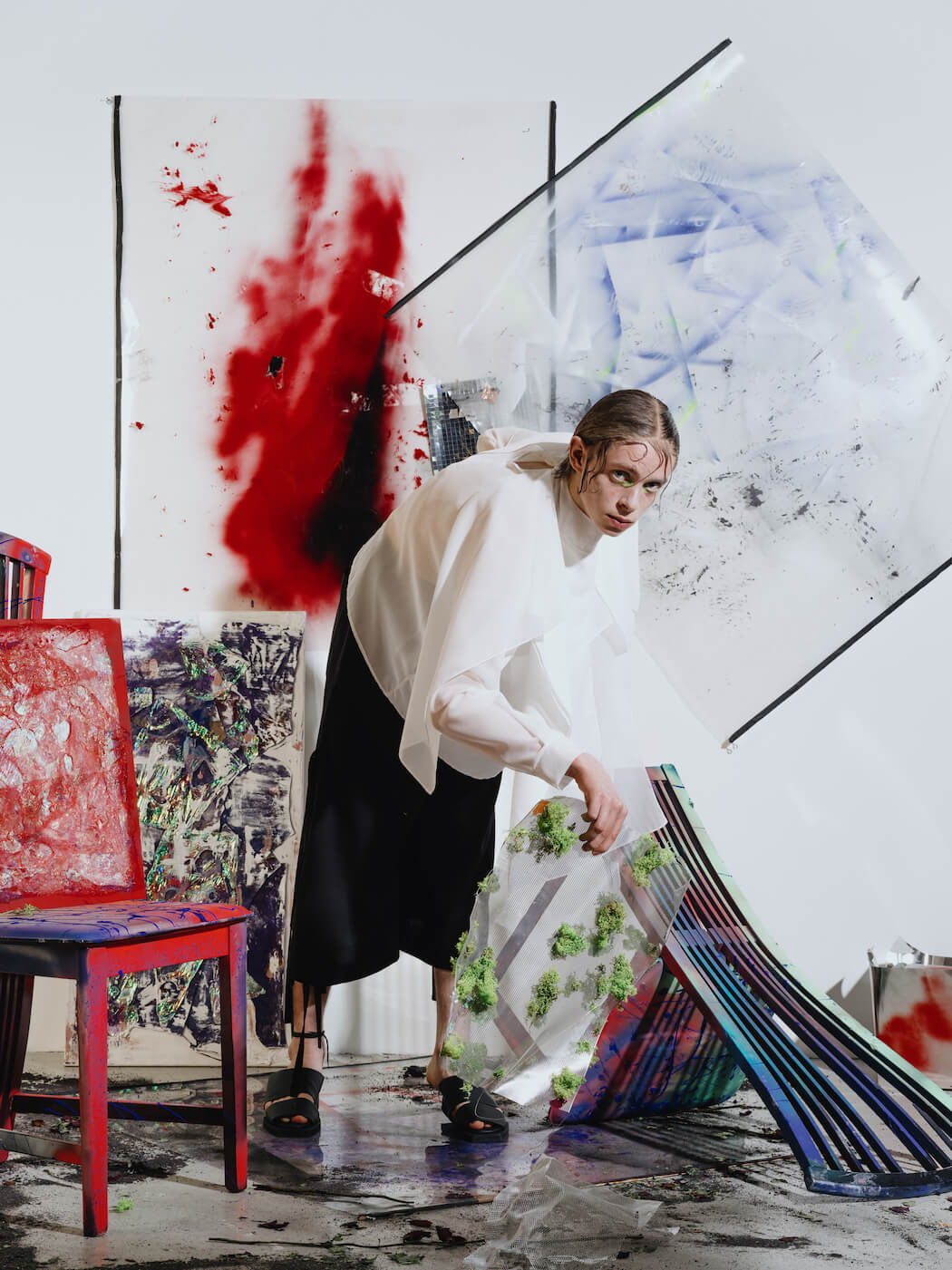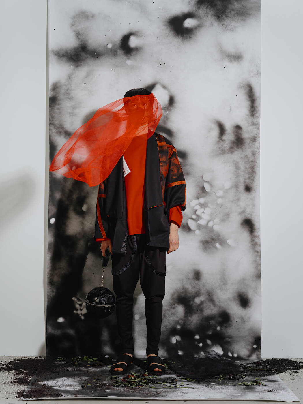 “My initial inspiration for this editorial came from Reza Nadimi’s aesthetic, that I could immediately connect to my friend’s work, Lucas Ngo. Lucas works on ink, paint, it can look quite dark and dramatic but very poetic at the same time. Then, I thought it could be a great opportunity to fuse our work which is very different but somehow matching together: his 4m long painting that we hang on the wall, and my multicoloured installations that are made from different materials that I usually work with. This collaboration is also a great way to share our work as artists and to see it in a different setting. Thanks to STUDIO183 for the opportunity“.