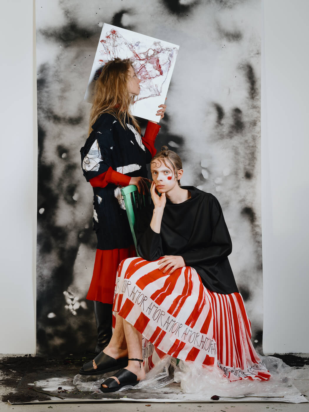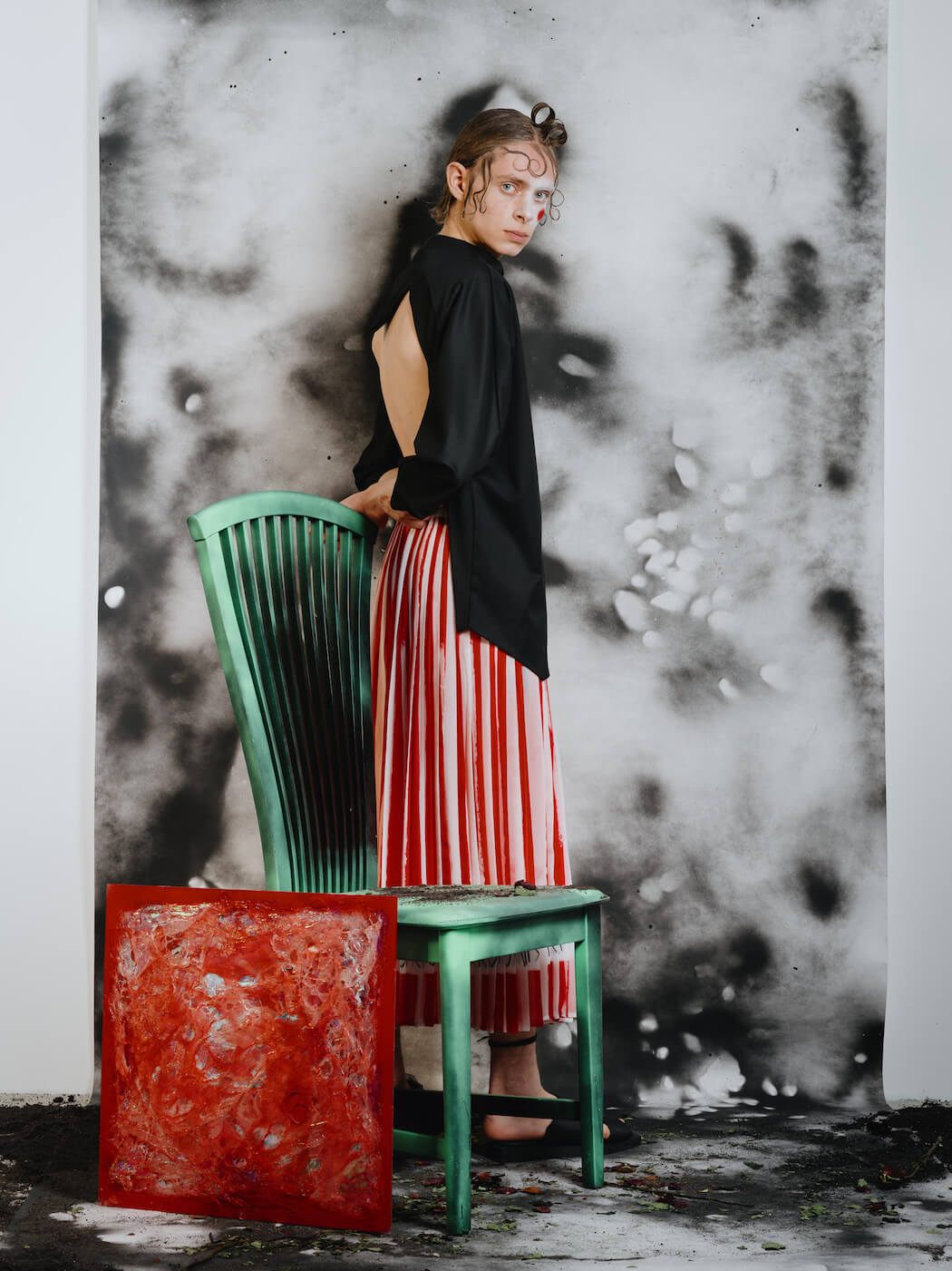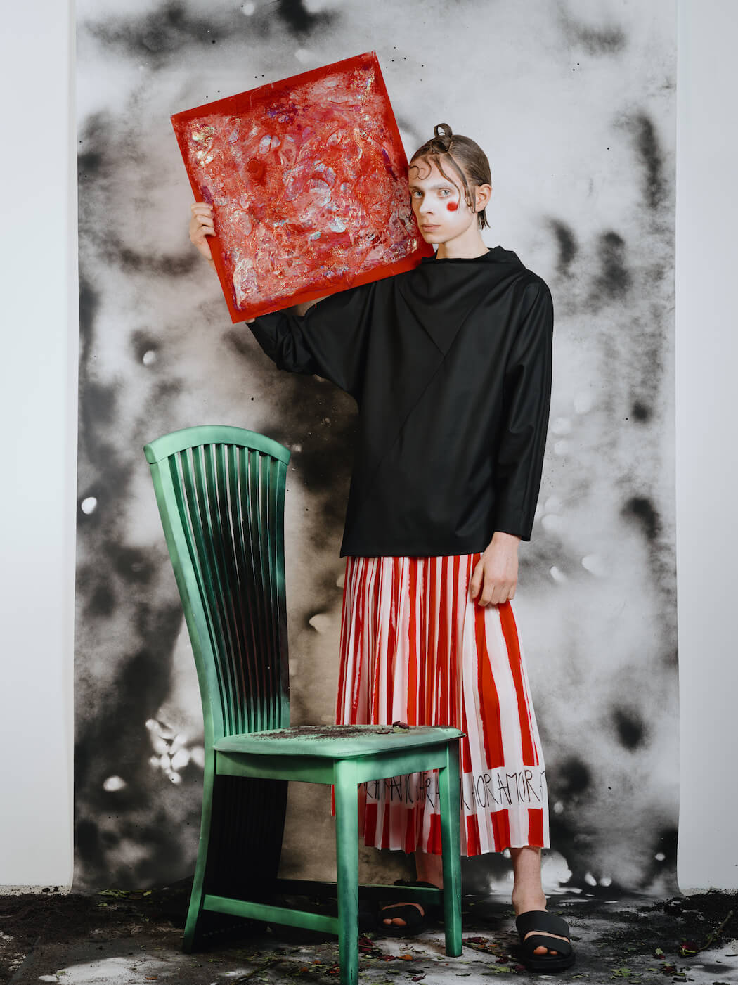 Cille Sch came up with the idea to present eight fashions designers from STUDIO183 who are also artists, painters, designers and creatives. Not only the designers are artists but the models too. “It’s about juggling between multiple talents and faces as artists and not to be afraid of it. It also means, having strong personalities, being sometimes too intense or too much for the rest of the world“. Natalie Golunbenko is a model and multidisciplinary artist. Benji Wohlrab is modelling in his spare time when he is not too busy being a musician. Lucas Ngo is a French artist now based in Berlin, working on paintings, installations and videos. Why be restricted to one personality, if you can show many. Am I being too much for you?