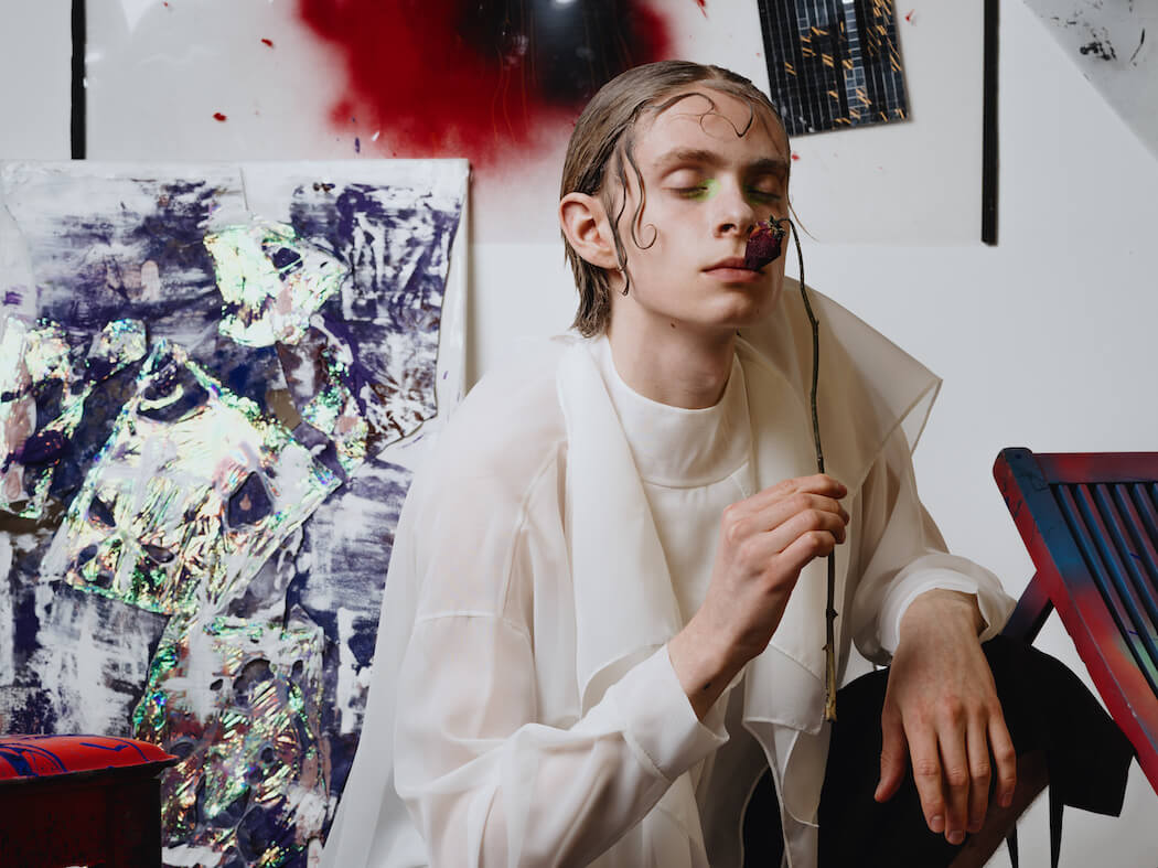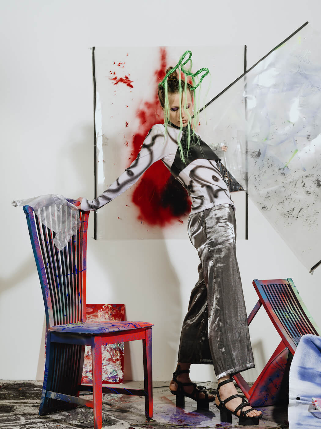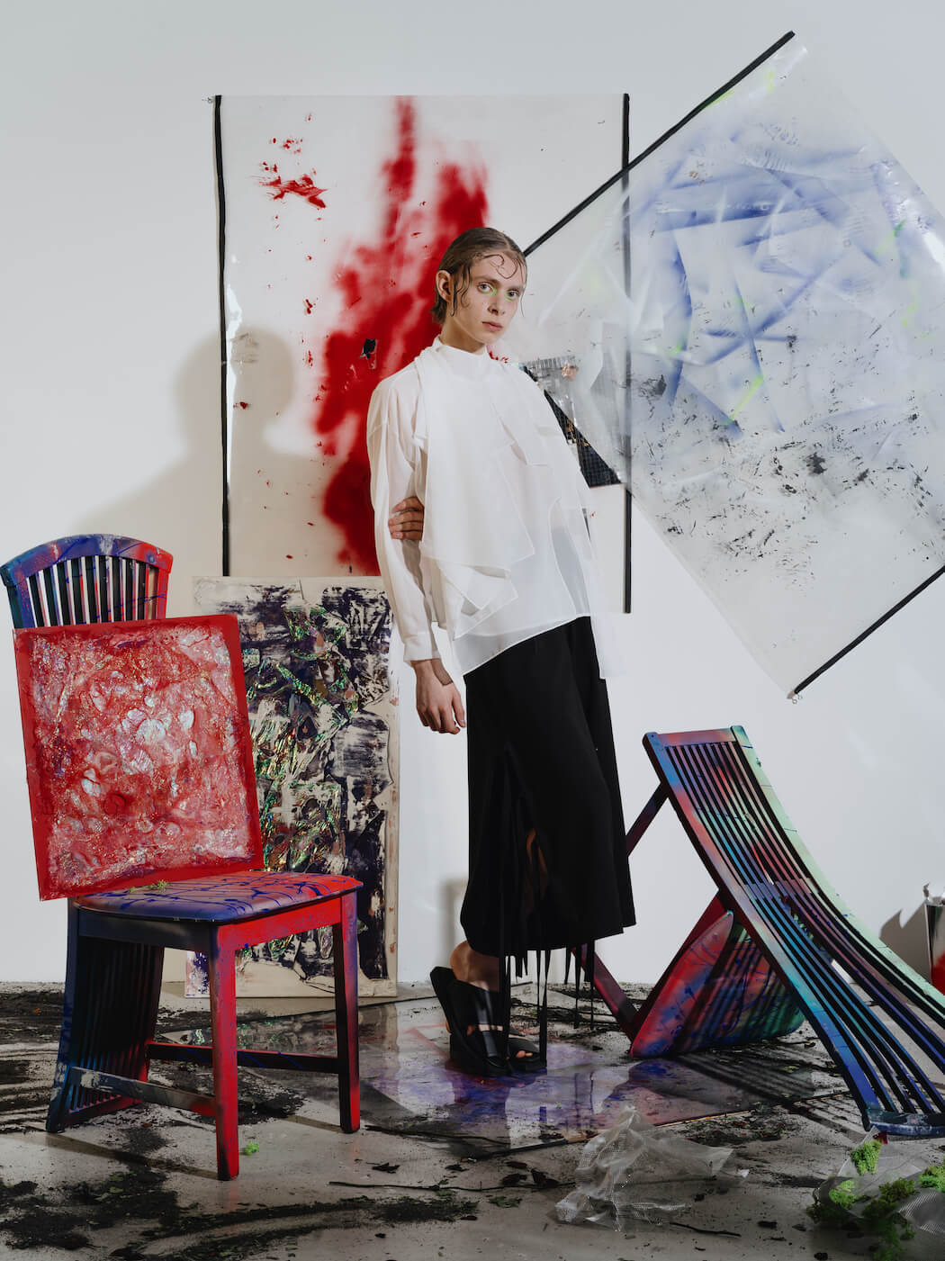 Cille Sch came up with the idea to present eight fashions designers from STUDIO183 who are also artists, painters, designers and creatives. Not only the designers are artists but the models too. “It’s about juggling between multiple talents and faces as artists and not to be afraid of it. It also means, having strong personalities, being sometimes too intense or too much for the rest of the world“. Natalie Golunbenko is a model and multidisciplinary artist. Benji Wohlrab is modelling in his spare time when he is not too busy being a musician. Lucas Ngo is a French artist now based in Berlin, working on paintings, installations and videos. Why be restricted to one personality, if you can show many. Am I being too much for you?