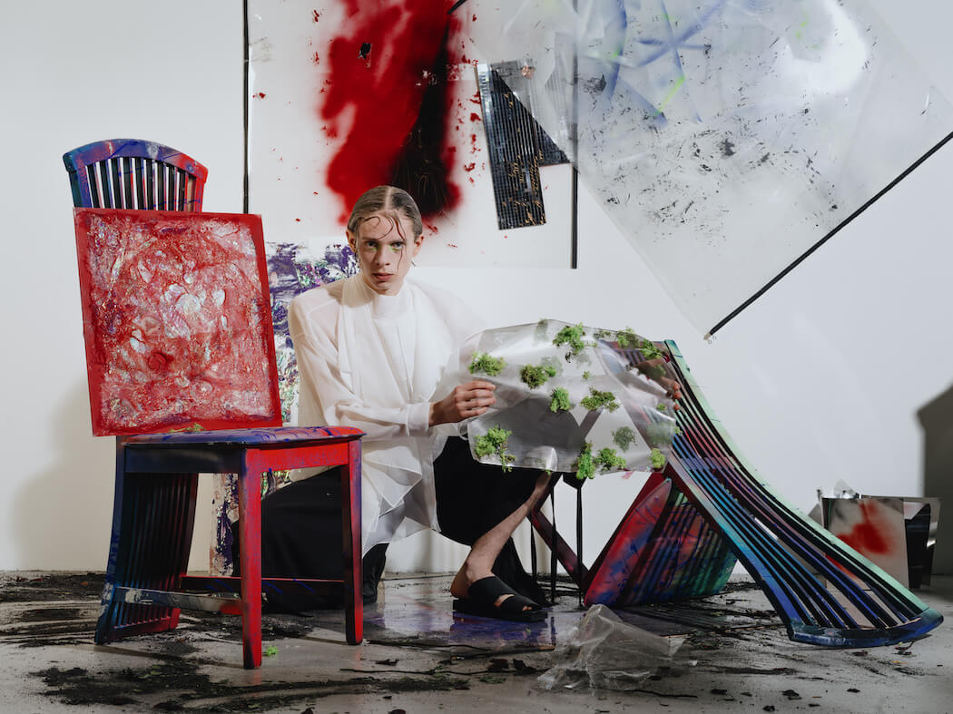 Camille Schaeffer or Cille Sch is a visual artist, performer and director based in Berlin. She navigates between diverse disciplines, going from performance art to sculpture and installations. Cille Sch is currently exhibiting at STUDIO183 in Bikini Berlin. At the exhibition, you can find some of her hanging sculptures and mixed media artworks. “Seeing my art in another context such as a fashion concept store opened up my mind and permitted me to expand my practice which I now can visualize more clearly in connexion with fashion.”