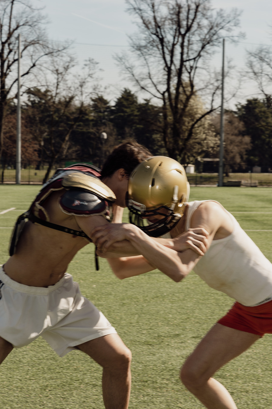 “The intention is to represent toxic masculinity within sports, such as rugby, American football, and football. The shooting is about total freedom of expression, absolute fun, harmony and intimacy between the two players. For me, it’s important to represent this hidden side of sports, because many people still think that sports are only for straight men.”