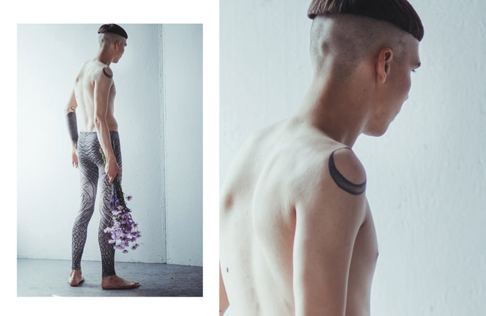 A KALTBLUT exclusive menswear editorial. Photographer Artiom Ponkratenko captured Antanas Luciunas for “Androgynous”. Styling by Indre Lukosiunaite. Make up by Lilija Ustin. Hair by Spaghetti Bolognese. Leggings by DUE Fashion.