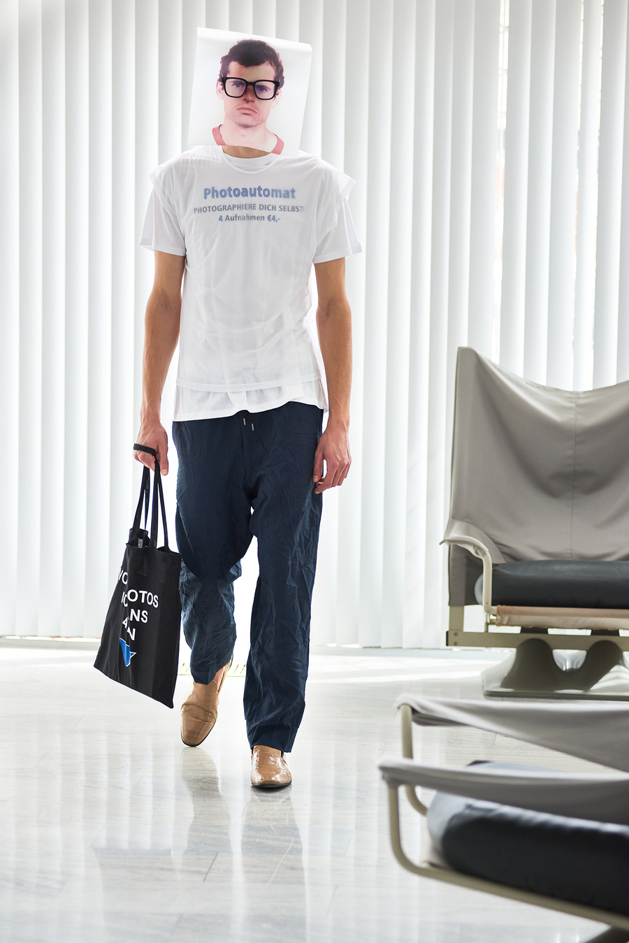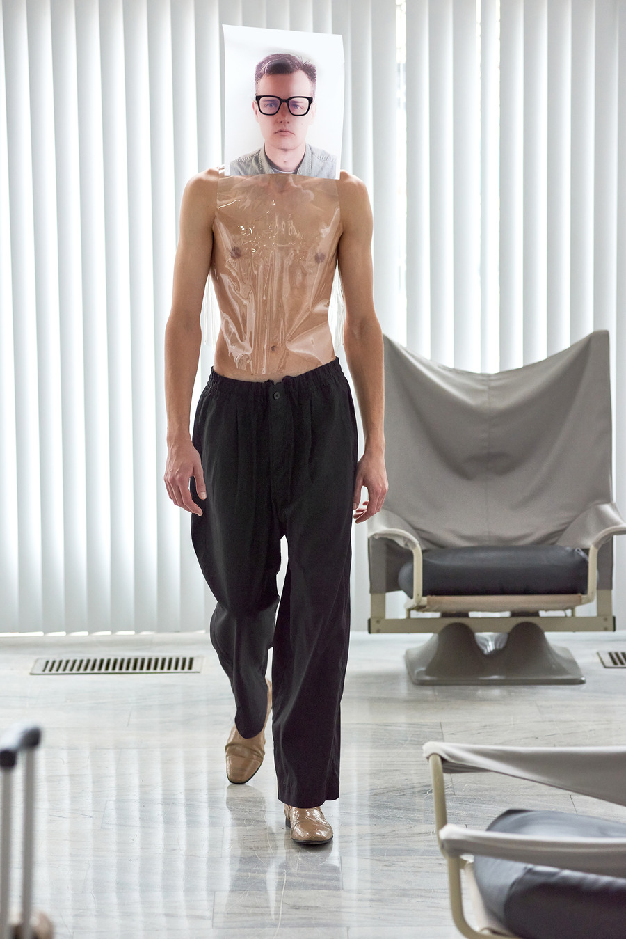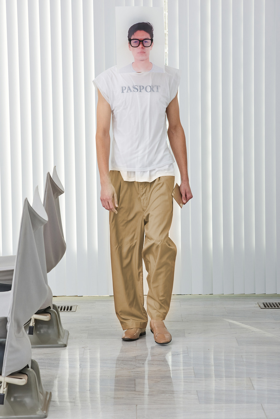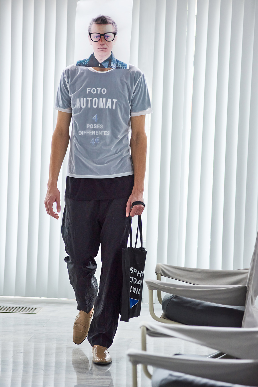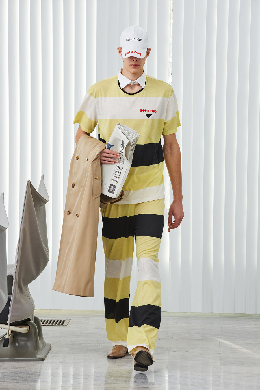 In a bold departure from traditional norms, the collection embraces elements reminiscent of passport photo booths. With striking stripes and captivating prints, Frentzos infuses a clear graphic mood into his designs, creating a visual spectacle that demands attention.