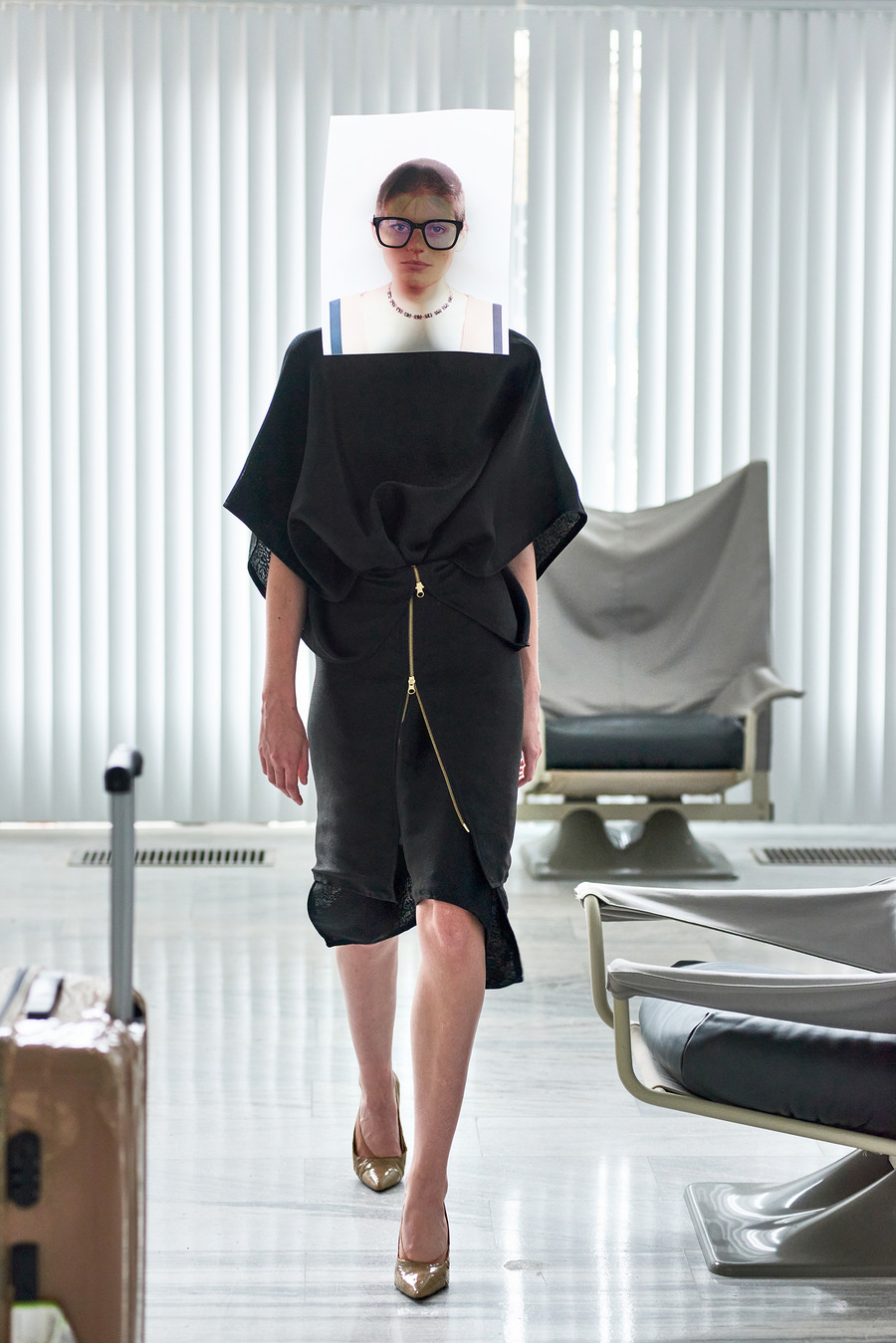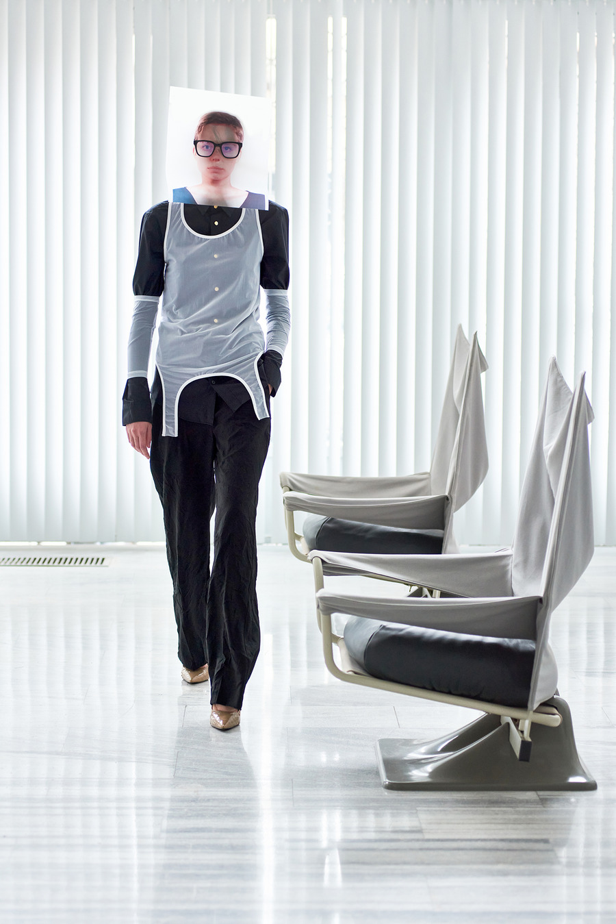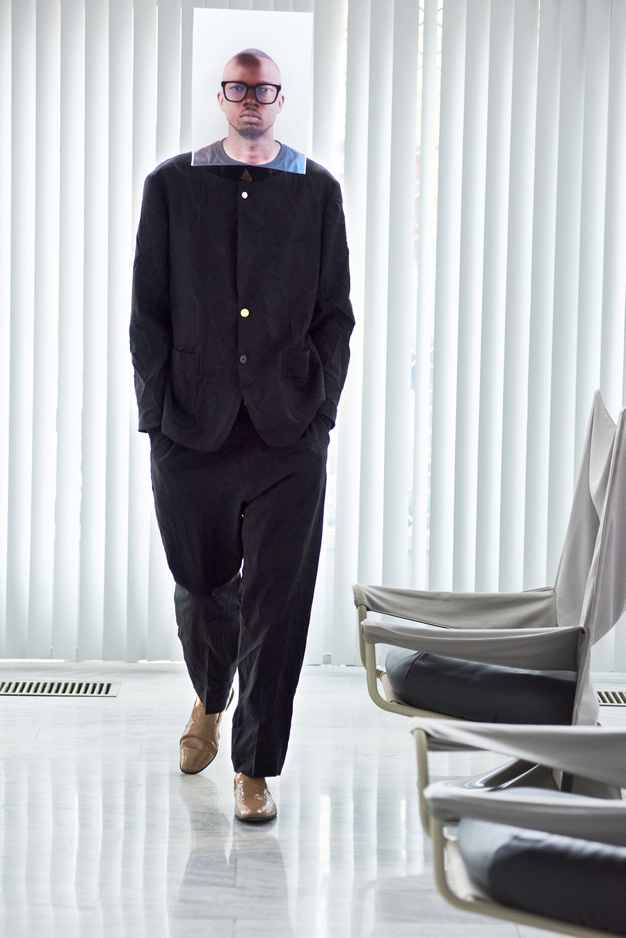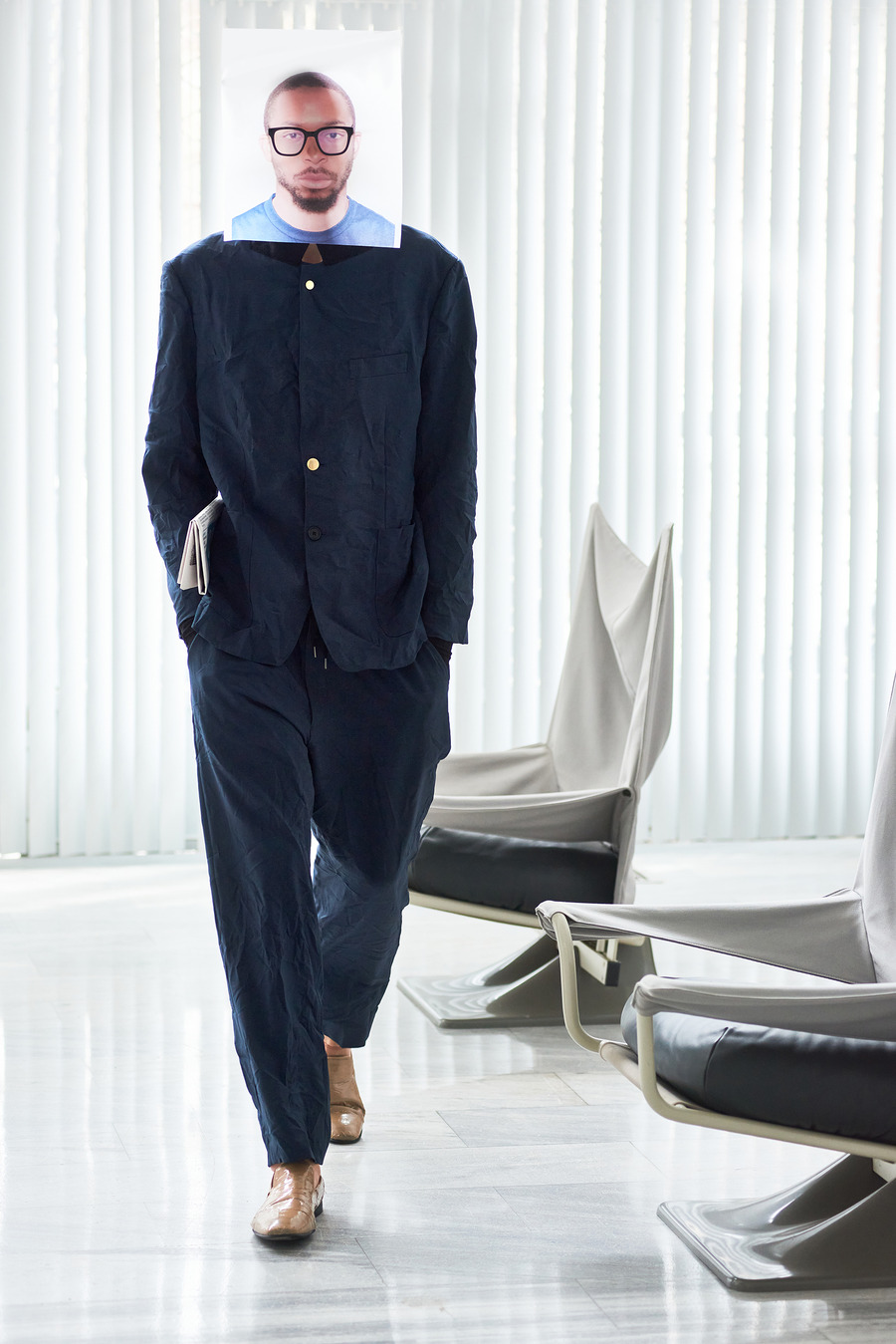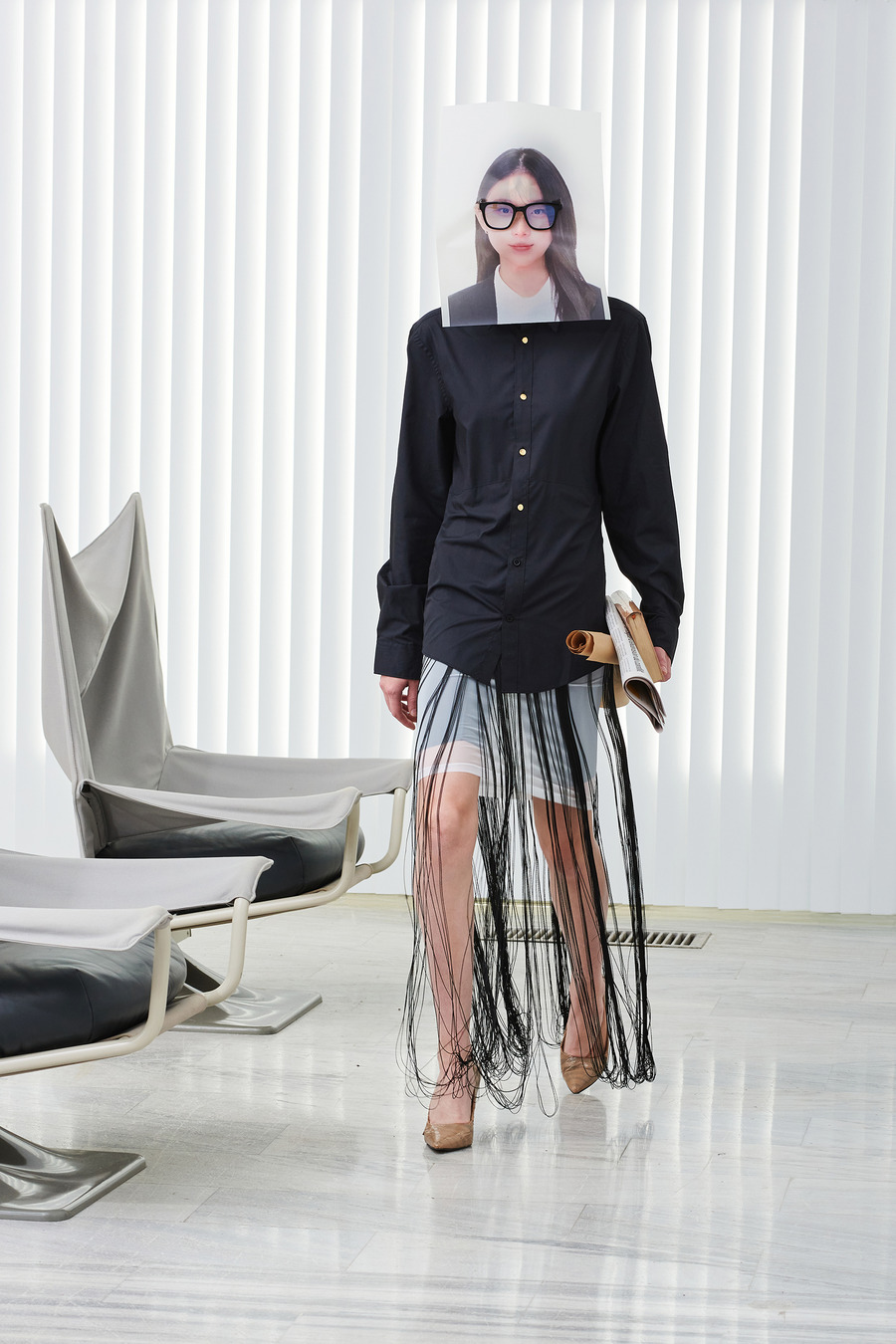 In a bold departure from traditional norms, the collection embraces elements reminiscent of passport photo booths. With striking stripes and captivating prints, Frentzos infuses a clear graphic mood into his designs, creating a visual spectacle that demands attention.