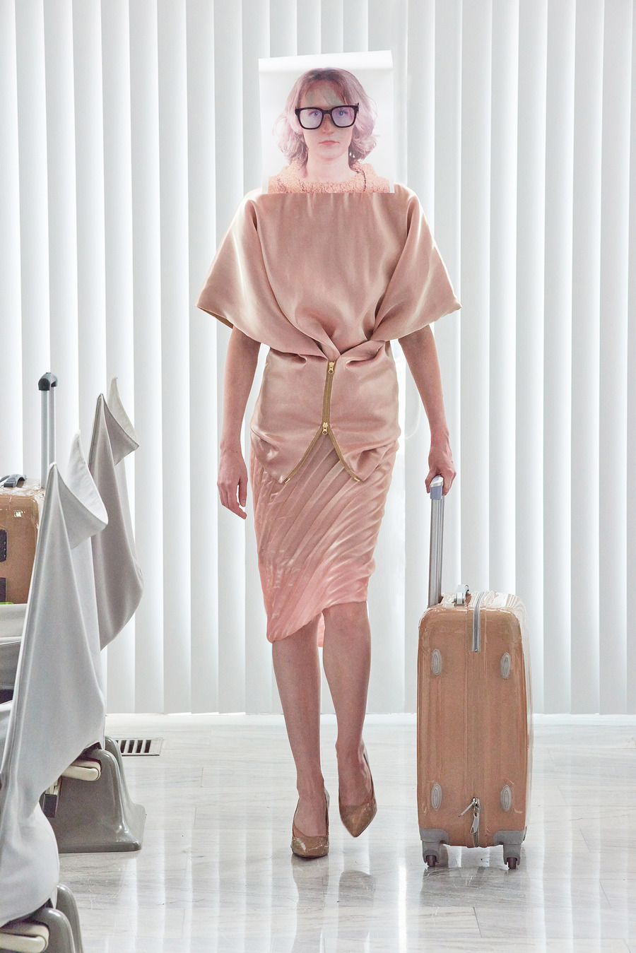 Featuring jelly fabrics that create a form-fitting structure, the collection showcases a unique play on layering. Pleated and draped variations of under-layered garments add depth and dimension, while golden accents replace traditional hardware details, adding a touch of opulence to each piece.