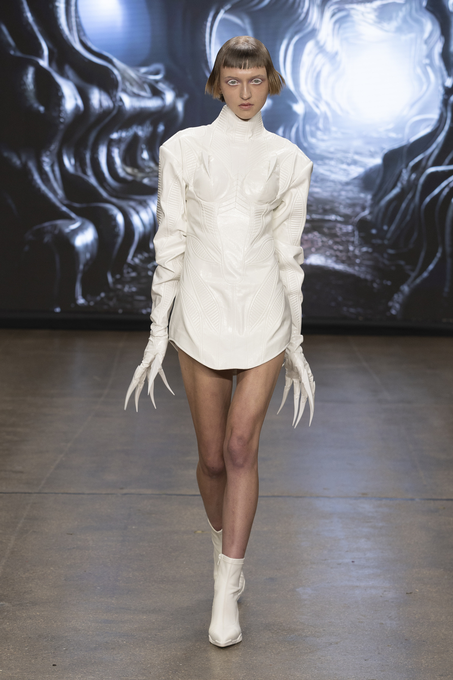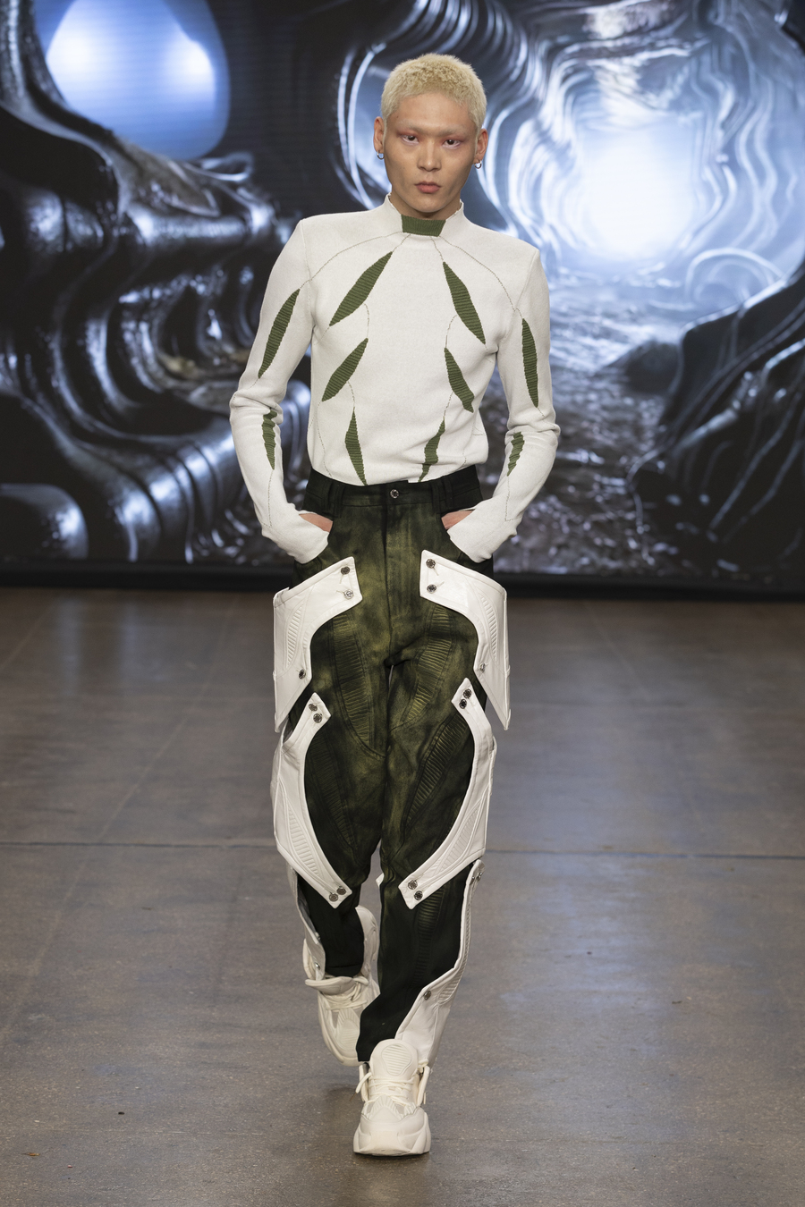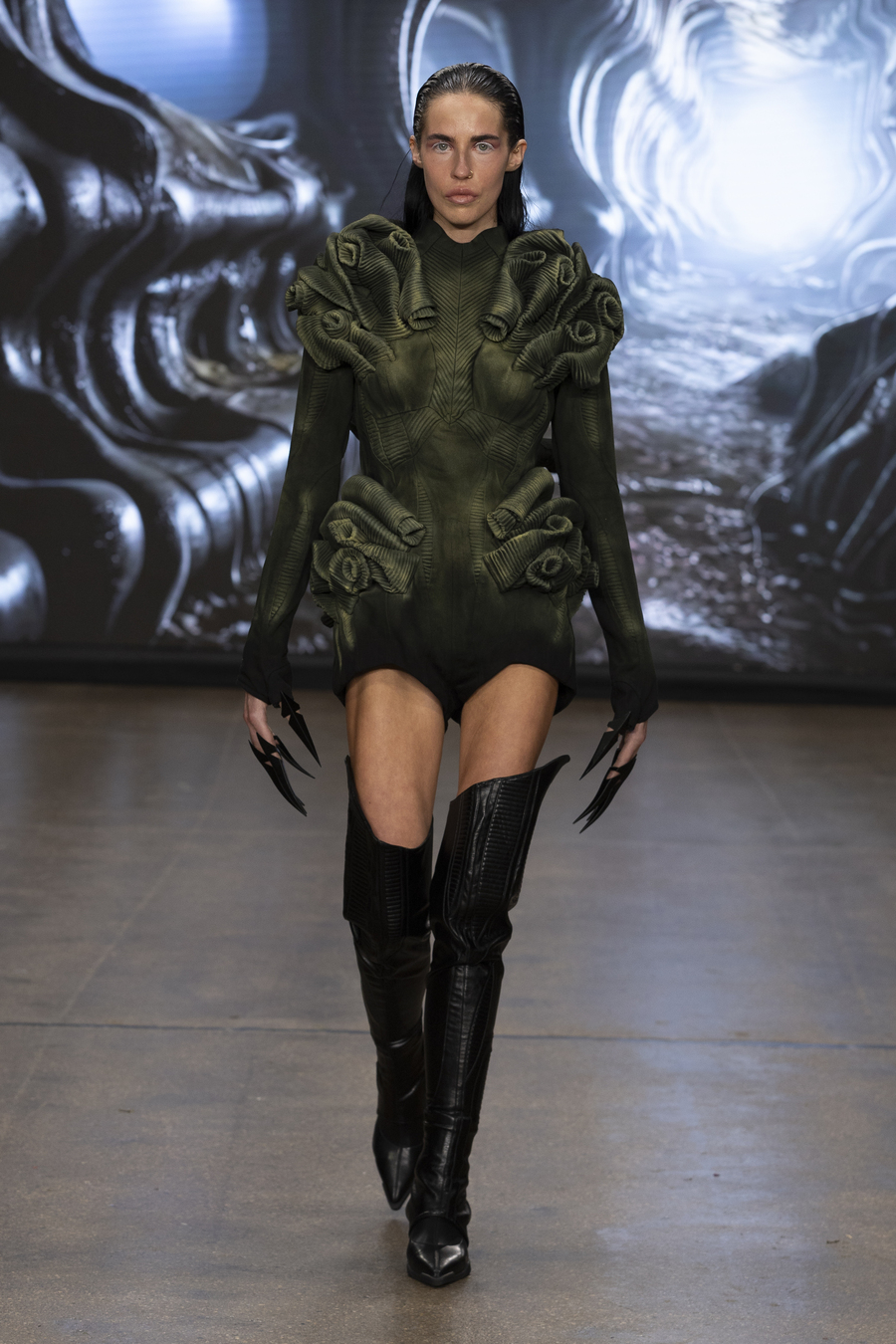 For those who ever wondered what fashion would look like in a cyberpunk utopia, Tsui provided the answer. Inspired by Giger’s iconic biomechanical aesthetic (think Xenomorph meets high fashion), the collection featured exoskeleton-like structures, surreal silhouettes, and avant-garde materials that defied the limits of design.