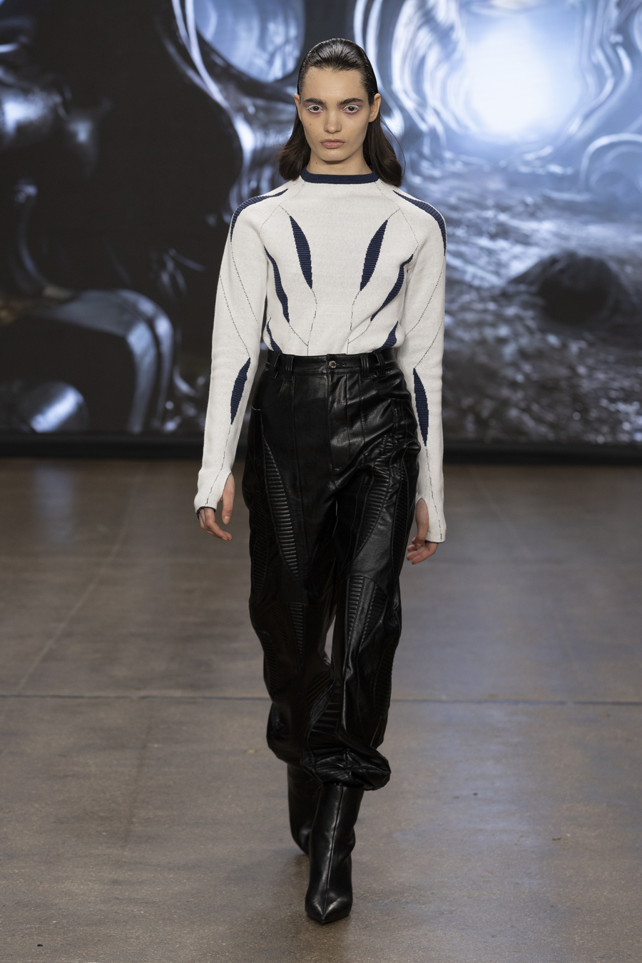 It included a thrilling mix of upcycled knitwear in collaboration with The Billie Upcycling, sustainable denim developed with The Stella Blue Textile and Vegan leather that looked and felt like it came straight from a future terrorised by James Cameron’s Terminators.