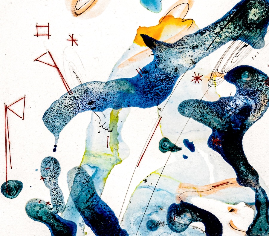 A distinctive hand-sewn red line courses through her pieces, animated and purposeful, connecting visual elements with emotional depth. In her compositions, colour becomes the emotional anchor; blue evokes reflection and the unseen, while red anchors the work in memory and physicality. Together, they orchestrate a dynamic balance between movement and stillness, matter and spirit.