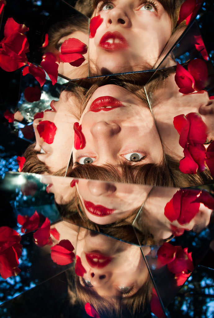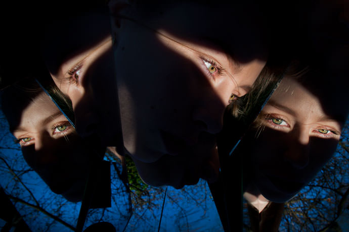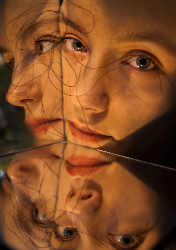usually more to our personalities and history than that which is exposed at first sight and might only have seen a reflection of their personality at first sight. Of this we must be aware. Therefore I have created a series of photos portraying people showing several faces from several angles. The distortions and reflections are never constructed in Photoshop, but always by working with multiple reflections in mirrors and other reflective surfaces whilst capturing the photographs with the camera. I aim to construct