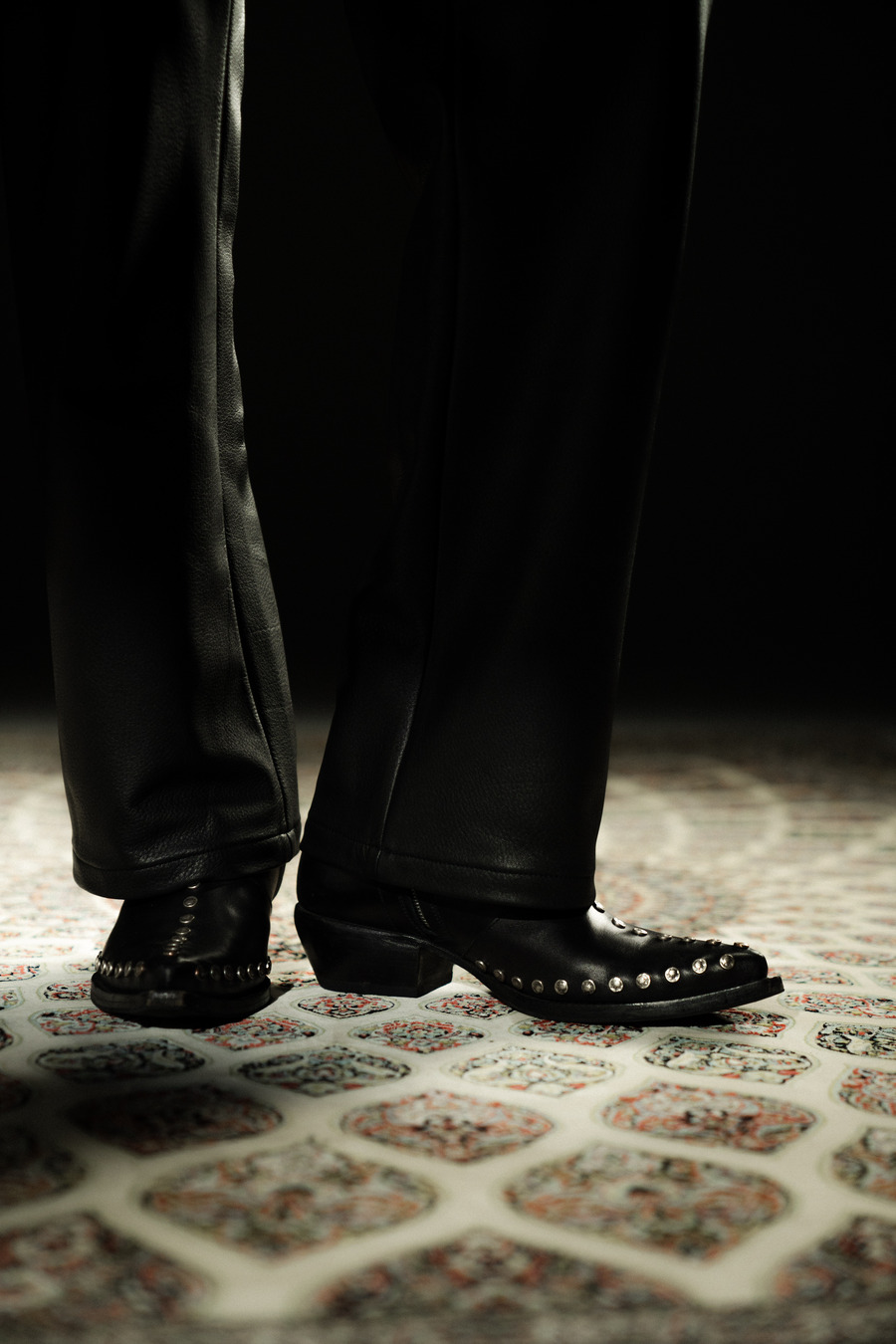 The cultural narrative unfolds with a highlight on outerwear. Inspired by the traditional Thawb, a leather jacket and pants set embodies this synergy. Crafted from high-quality calf leather, the jacket features a slit arm secured with cufflinks, complementing the minimalistic sophistication of the matching pants.