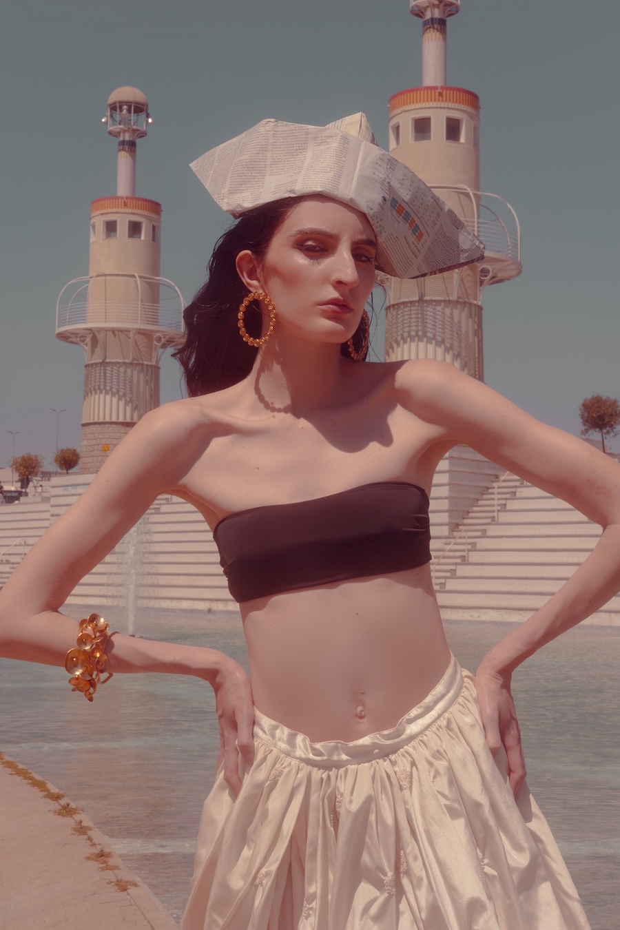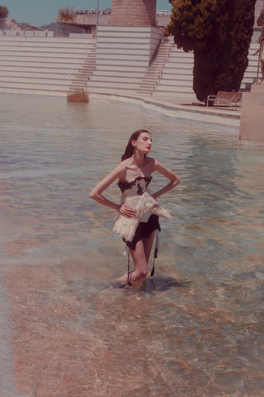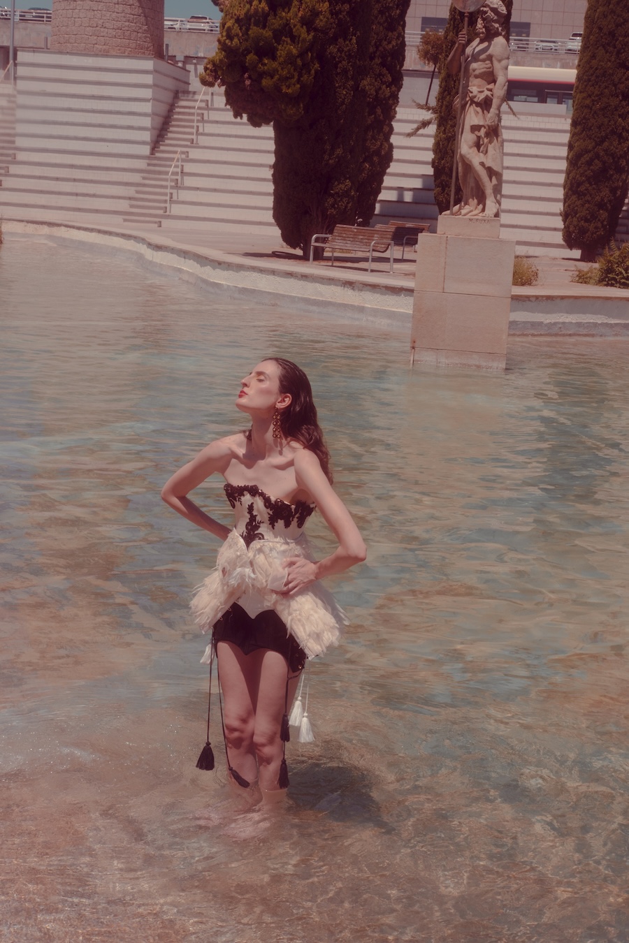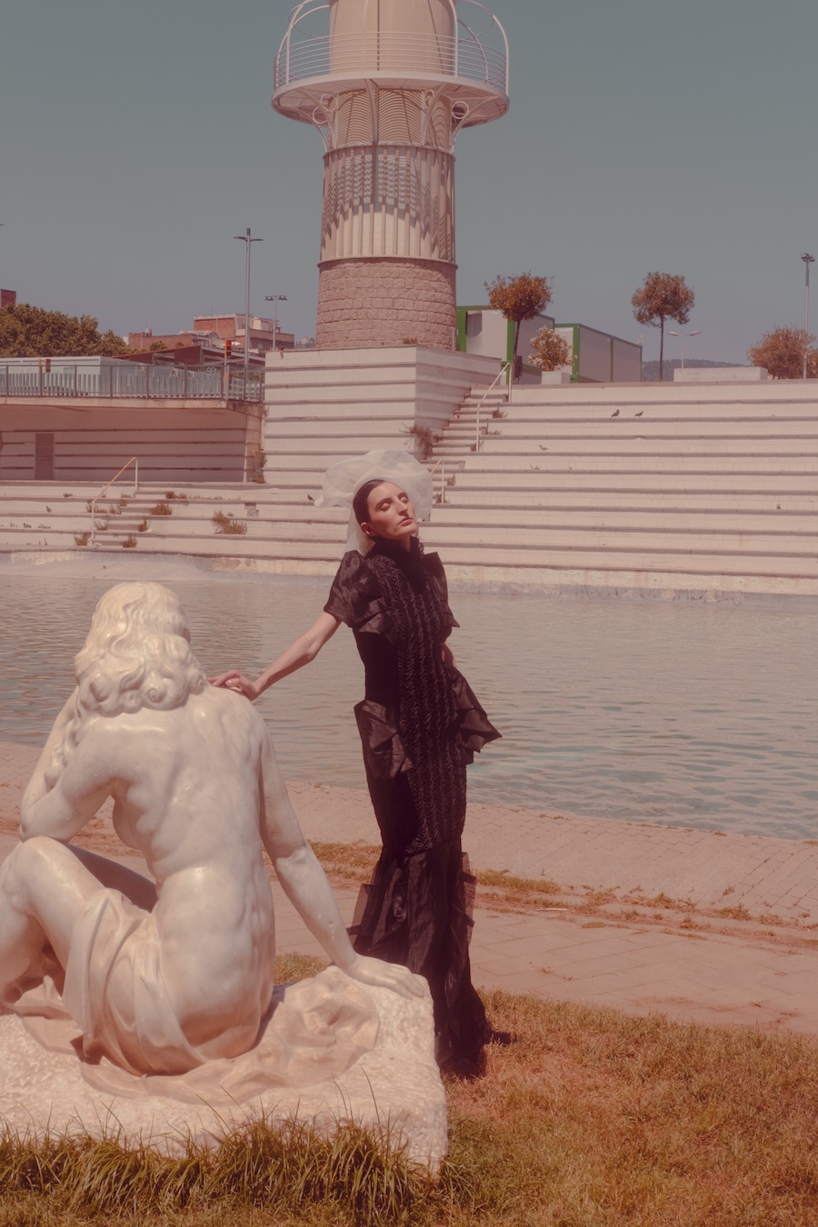 The concept is built around bold, extravagant silhouettes and experimental layering, opening a visual dialogue between fluidity and structure. Each look plays with volume, texture, and proportion, inviting the viewer to reimagine everyday spaces as stages for expressive fashion narratives. The series strikes a balance between whimsy and strength, presenting clothing not merely as garments but as sculptural forms that interact with water, stone, and greenery. It is a celebration of fashion as both art and performance—where each piece transforms into an ephemeral monument that inhabits and redefines its surroundings.