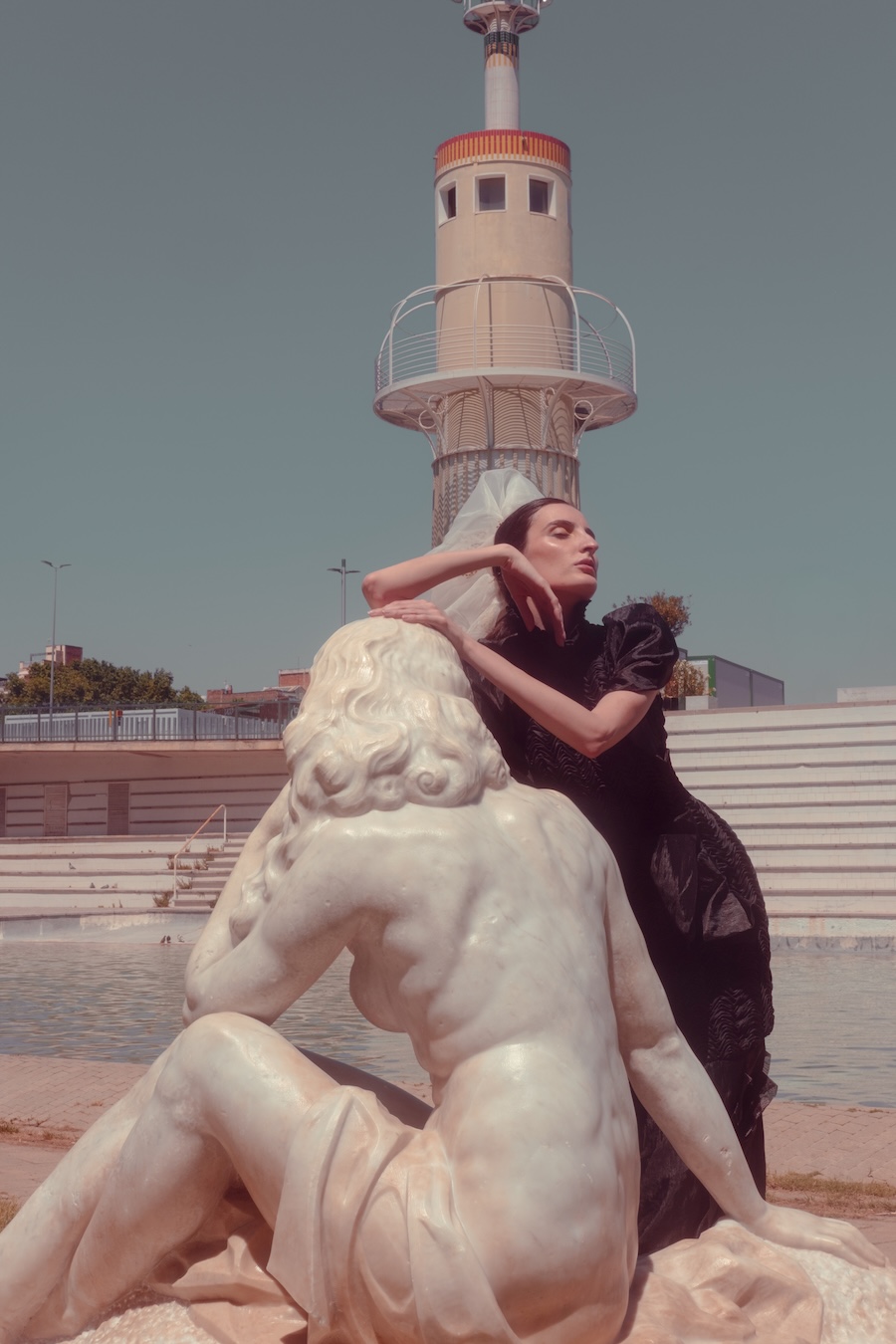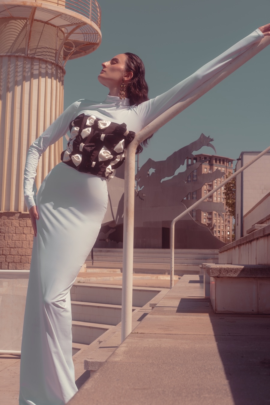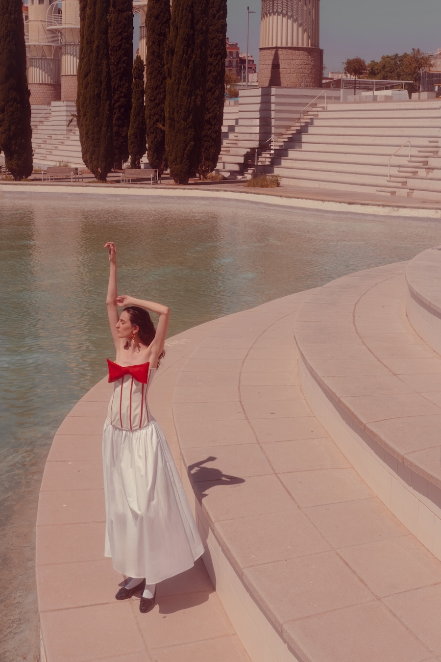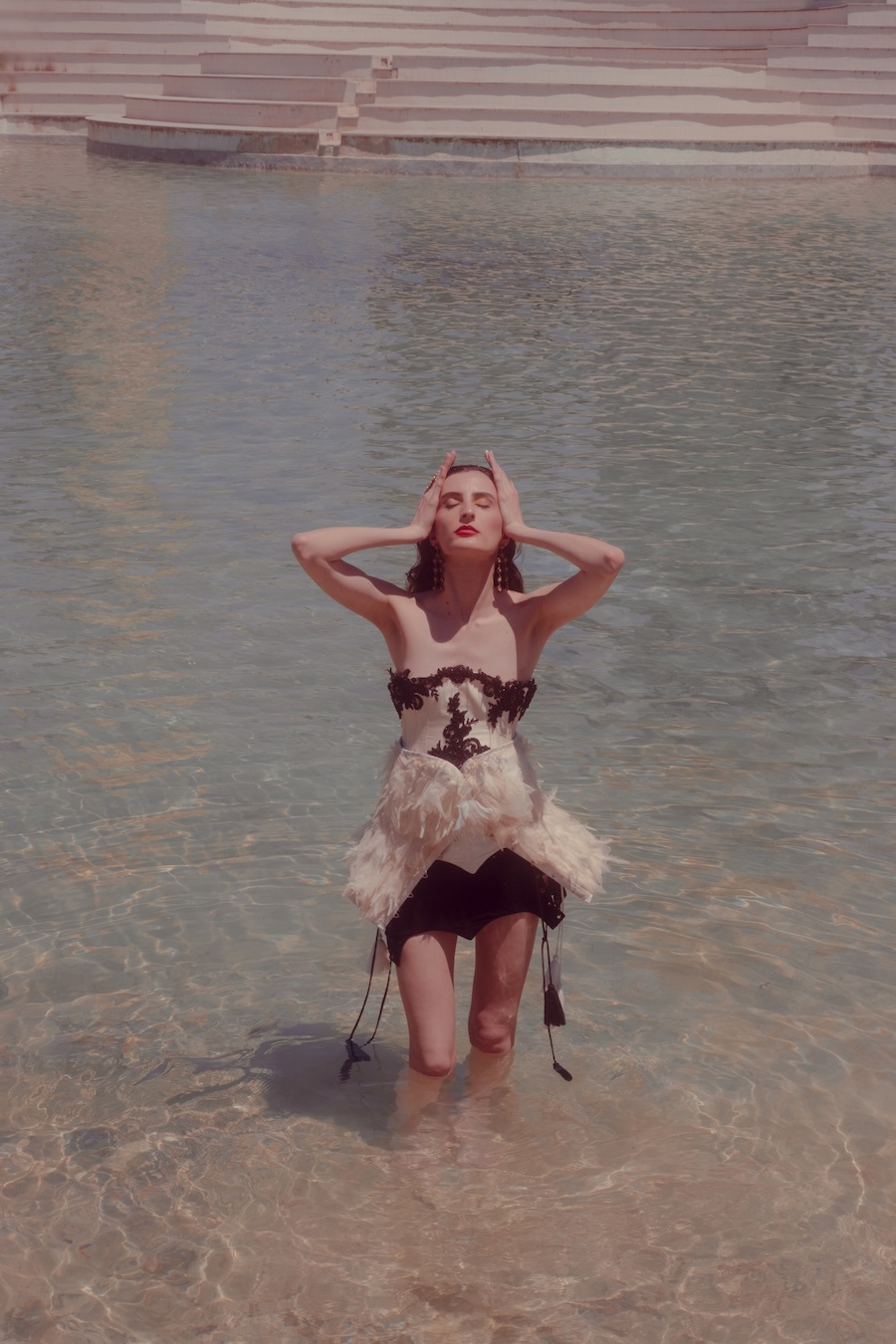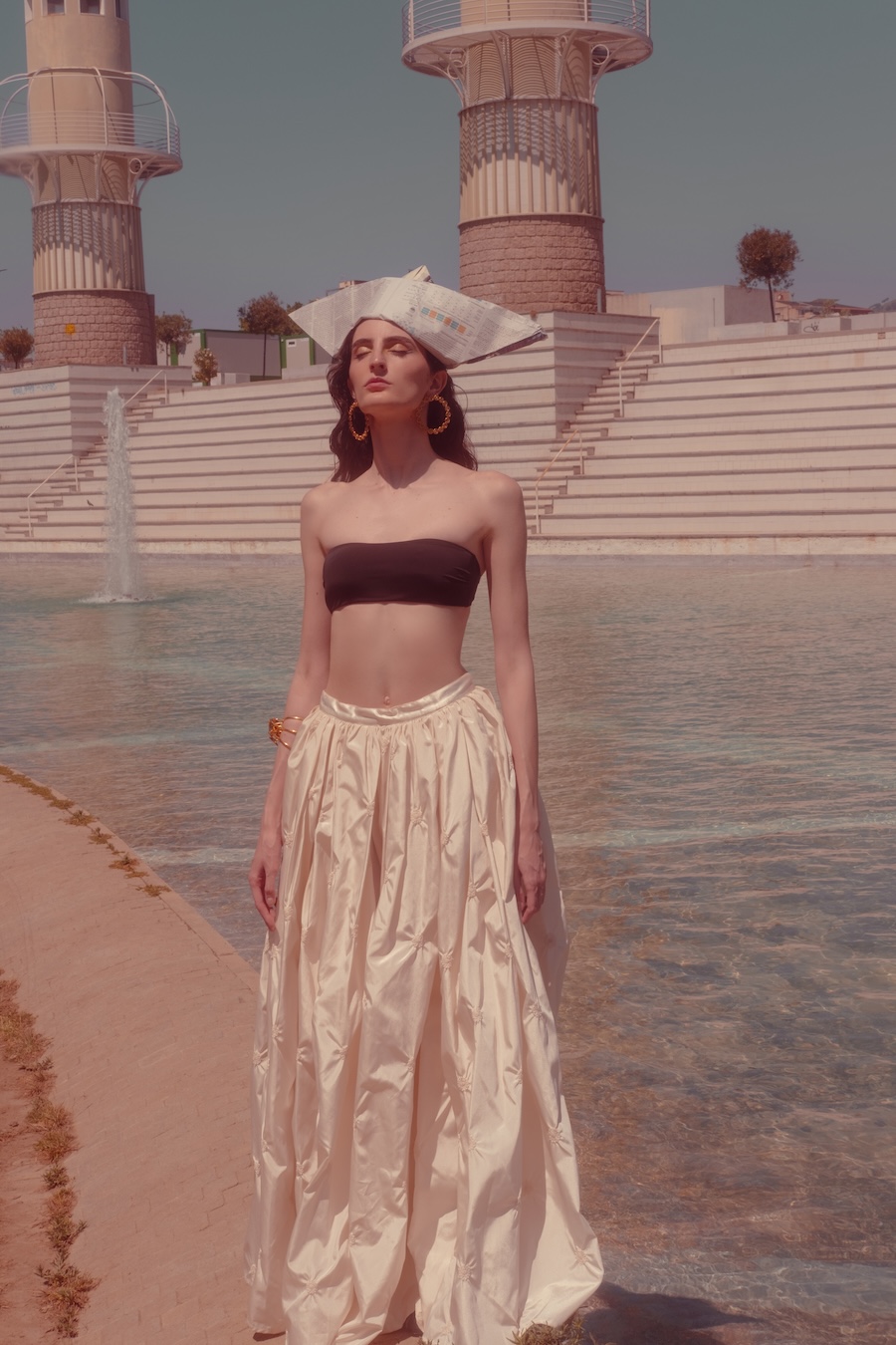 The concept is built around bold, extravagant silhouettes and experimental layering, opening a visual dialogue between fluidity and structure. Each look plays with volume, texture, and proportion, inviting the viewer to reimagine everyday spaces as stages for expressive fashion narratives. The series strikes a balance between whimsy and strength, presenting clothing not merely as garments but as sculptural forms that interact with water, stone, and greenery. It is a celebration of fashion as both art and performance—where each piece transforms into an ephemeral monument that inhabits and redefines its surroundings.