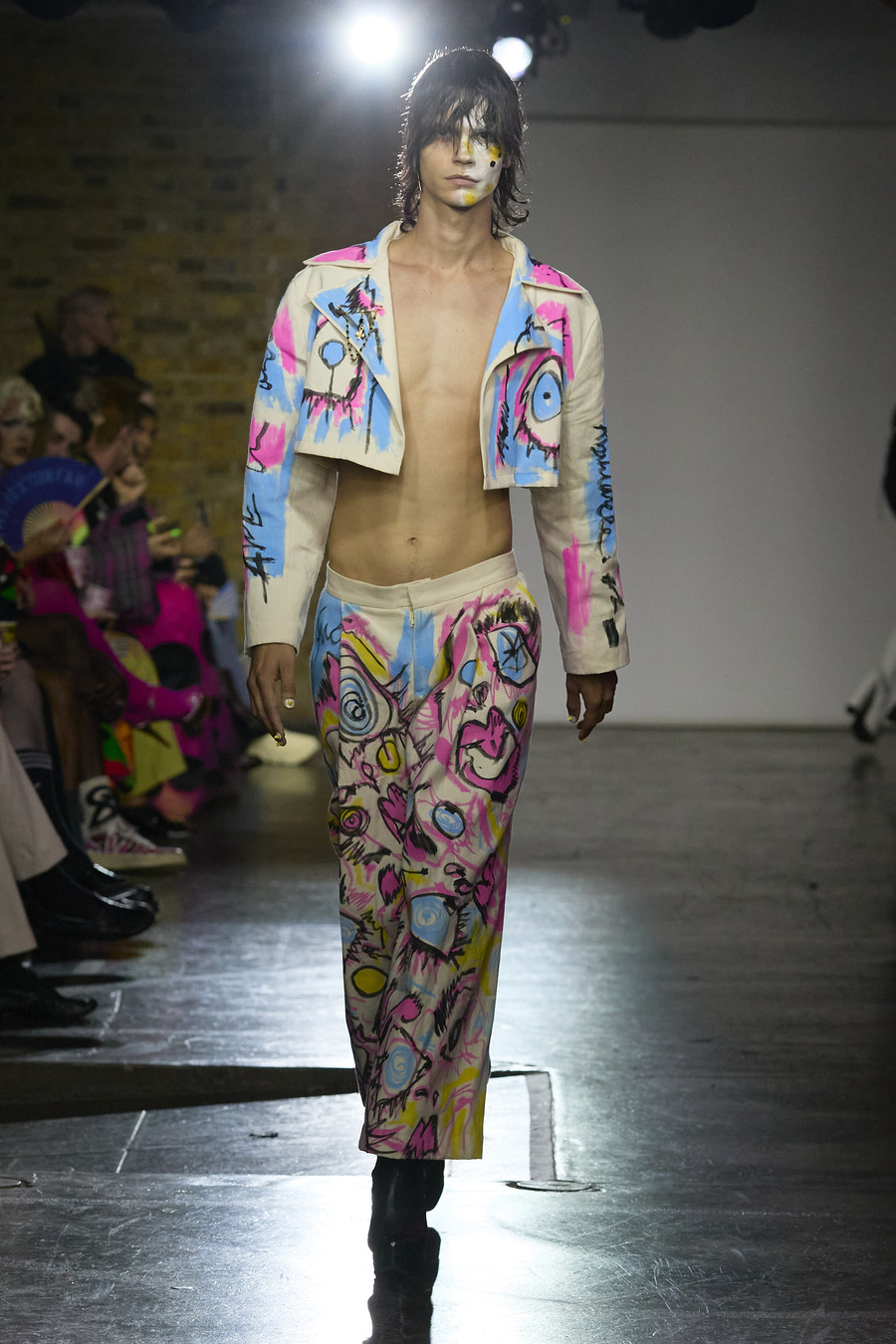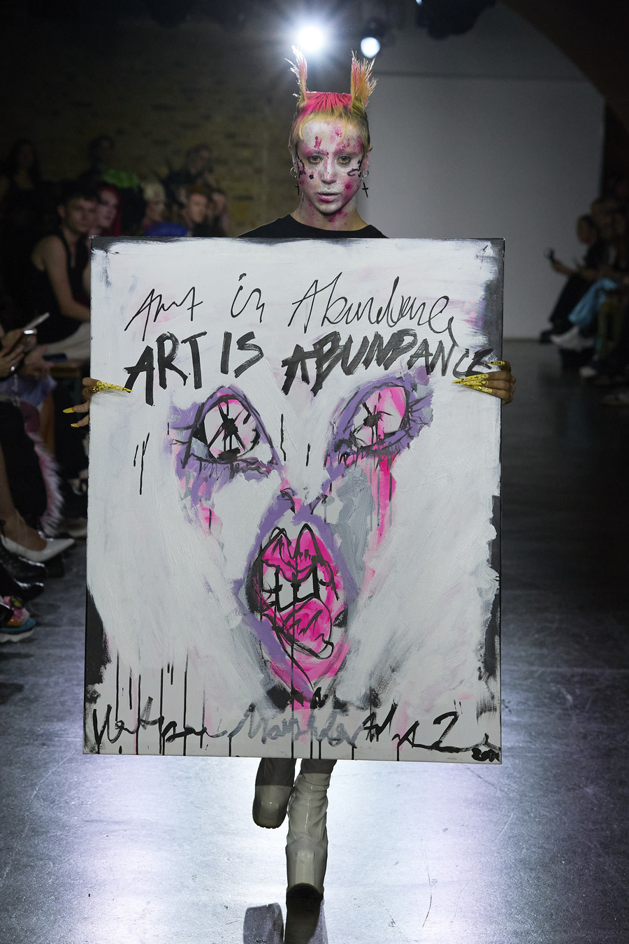 ‘Art is Abundance’ is Adam Frost’s self-proclaimed ‘industry-ready’ collection. Made up of gender-fluid styles such as the PVC power-shoulder coat and impeccably tailored separates; Adam means business this season. New mediums such as digital printing have been explored and used on garments adorned with the ‘Mania Faces’ print. The print fuses the designer’s iconographic face motifs with scribbles of lyrics to his new track, Art is Abundance.