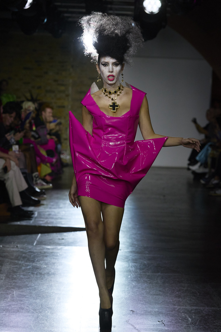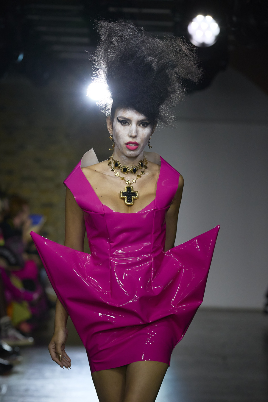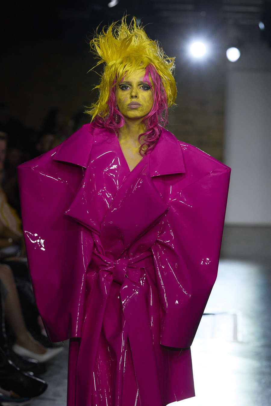 Amy Winehouse being a poignant figure of inspiration to this collection through the higher-than-sky hair and colourful co-ords. Some of the less-obvious references within the looks are Queen Elizabeth I, Cindy Sherman and Grace Jones through power shapes and opulent gold jewels designed in partnership with Era of Mystique.